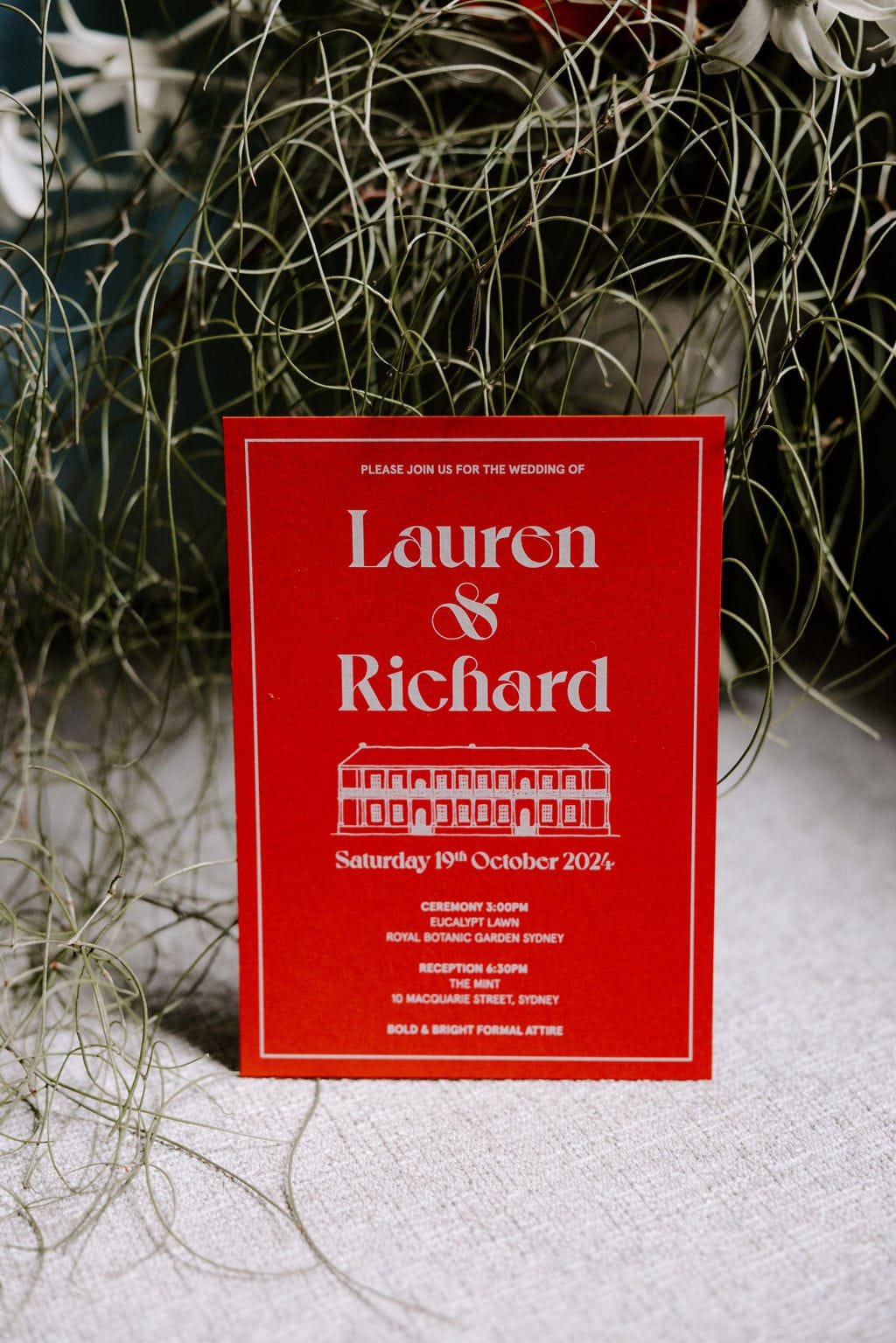 THE VENUE “We chose the Botanic Gardens Sydney as it’s a stunning part of the city, with a backdrop of the harbour and the Opera House, which inspired my love of architecture and where Richard and I have enjoyed many concerts together. We also really liked the idea of having our reception outdoors, which led us to The Mint and it’s historic sandstone courtyard. It ticked all the boxes for us: outdoors, architectural, and an iconic part of Sydney.”