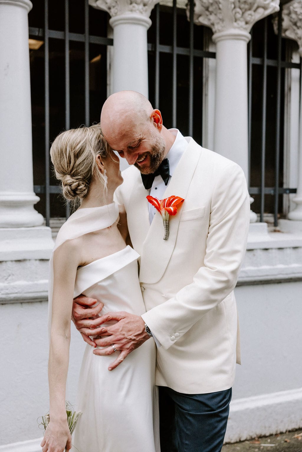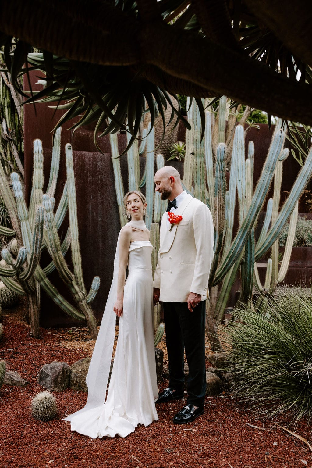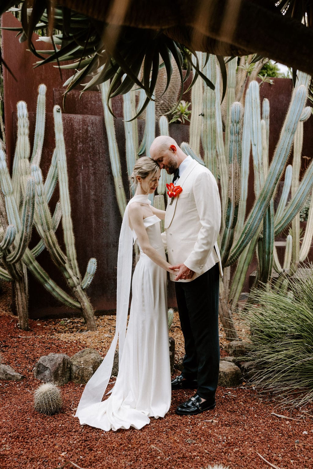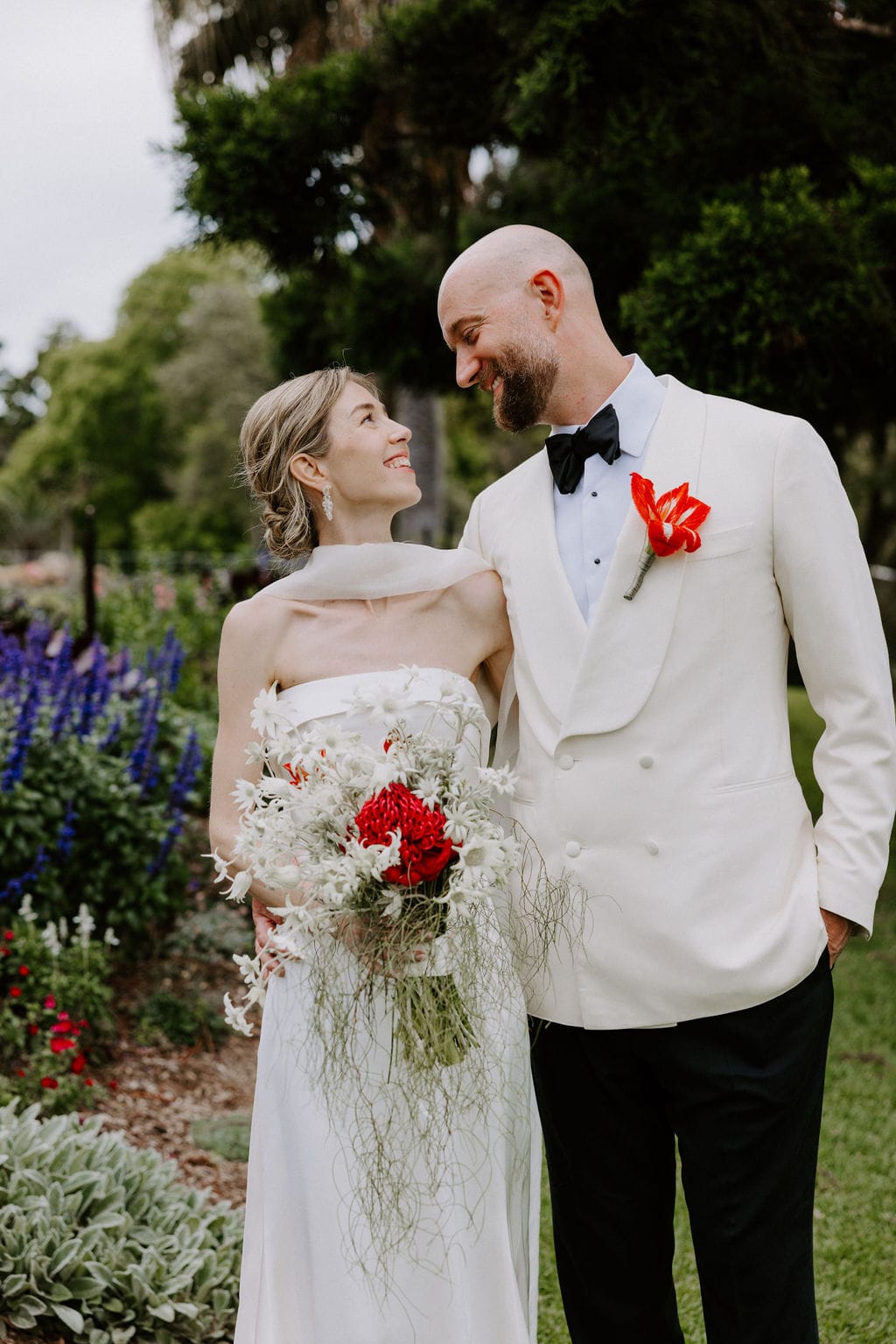 CONTRIBUTING VENDORS Photographer Gillian Keough Florist Bess Stationery & Signage DIY by bride Ceremony venue Royal Botanic Garden Sydney Reception venue The Mint Catering Pearl Catering Cake Fabbrica Bread Shop Rozelle Entertainment Ricardo Steyer, Soul Steady Celebrant Kristy Hosking Rings Stephanie Said MC Anna Robertson Dance lessons Arthur Murray Dance Studio THE BRIDE Bridal gown designer Prea James Bridal Silk scarf My Private Tailor Shoes Aeyde, D’Accori Accessories Simone Rocha Hair & Makeup The Pretty Parlour THE GROOM Suit, Shirt & Tie P Johnson Shoes Toga Pulla via Ssense Watch Rolex (heirloom) Grooming Mr Wolf Barber Shop