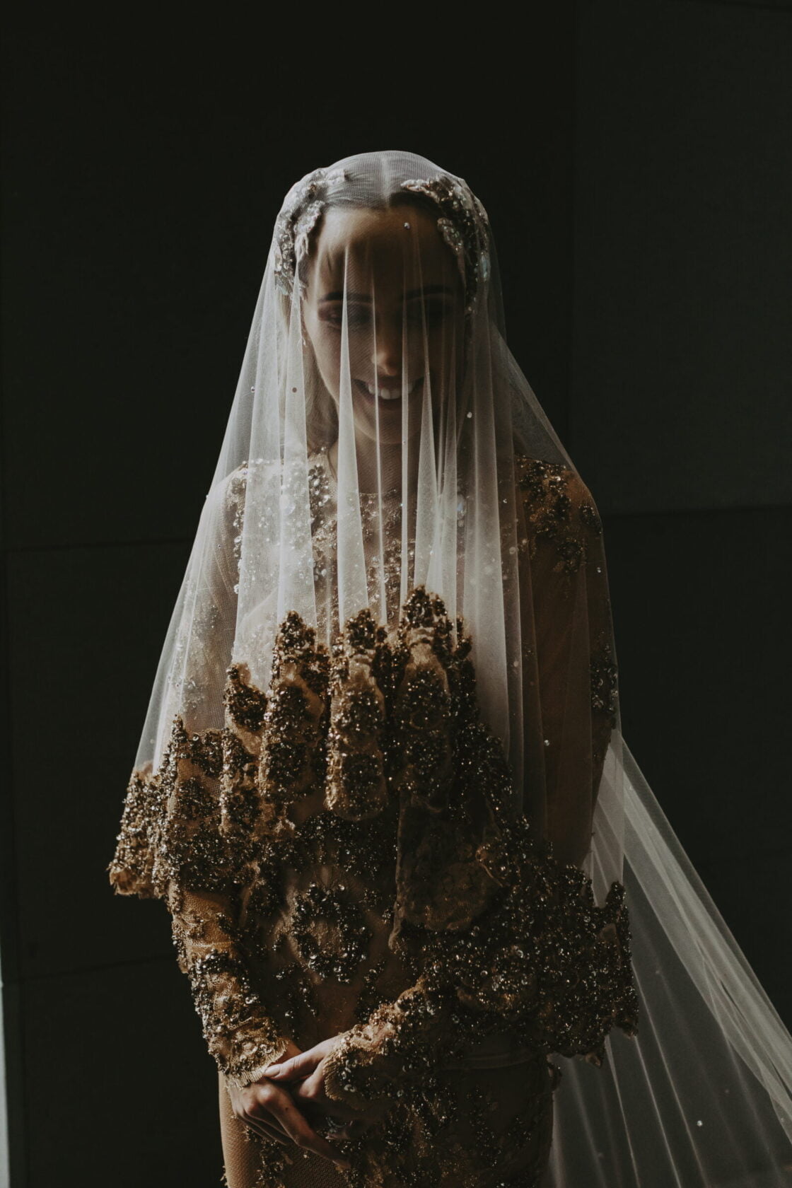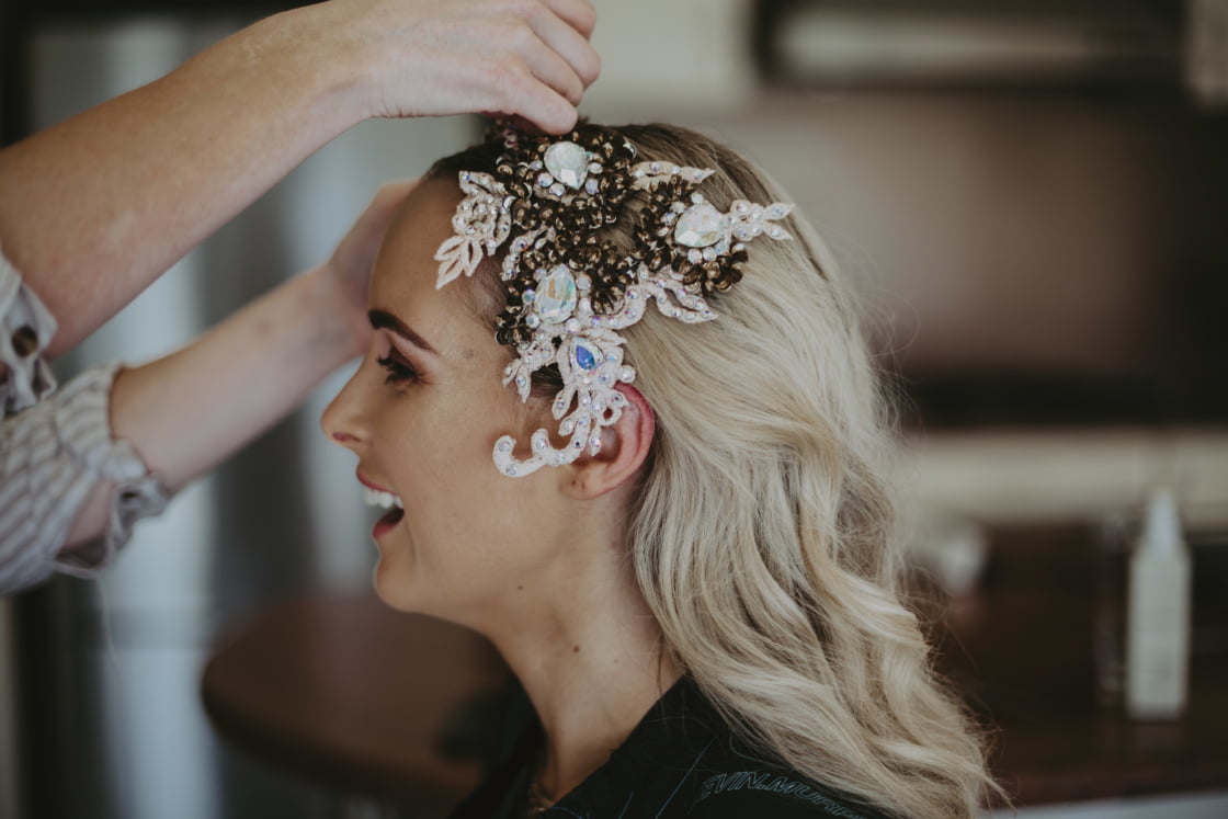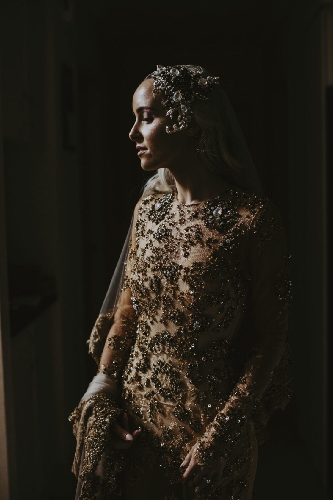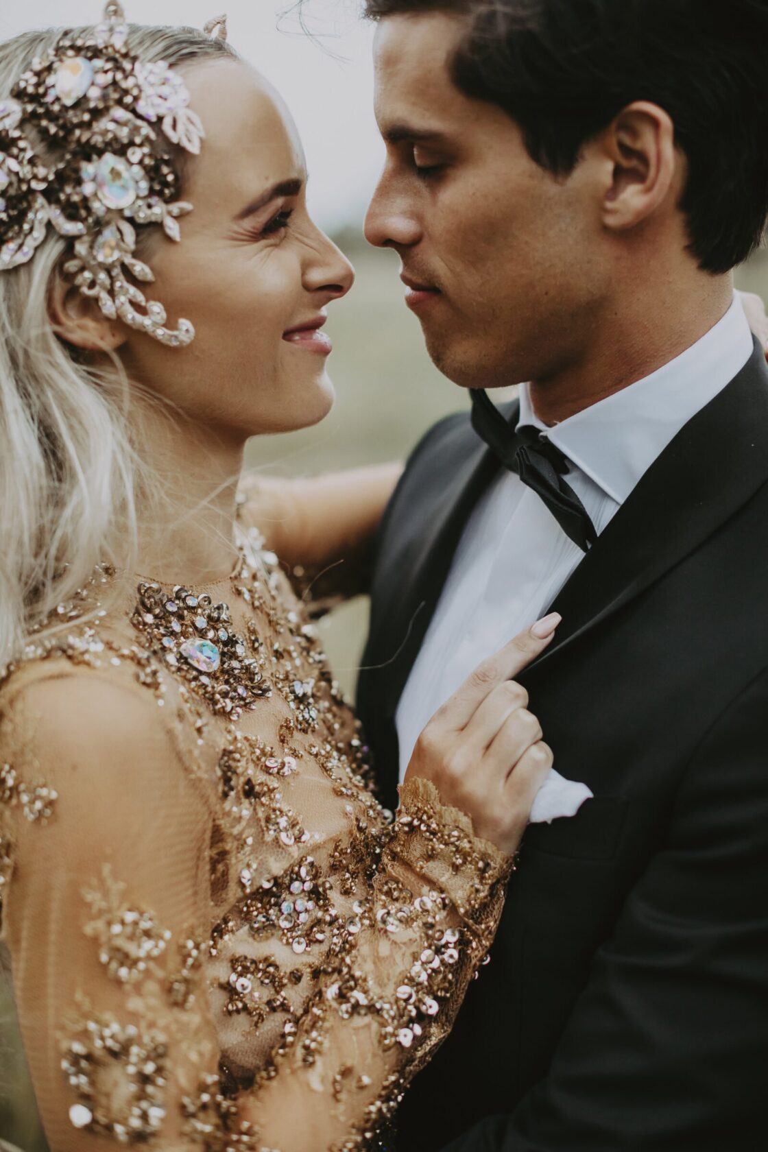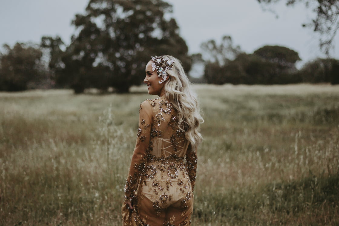 THE DRESS “Five years ago I attended a Jaime Lee Major runway show and I was in complete awe of every gown as they sparkled their way past me. Jaime Lee had moved to LA, so I had almost lost hope of the possibility of getting my dream gown. Thankfully the stars aligned and through a few serendipitous moments I found myself in possession of my dream wedding dress, veil and head piece. And Maevana created the most stunning corset for me to wear.”