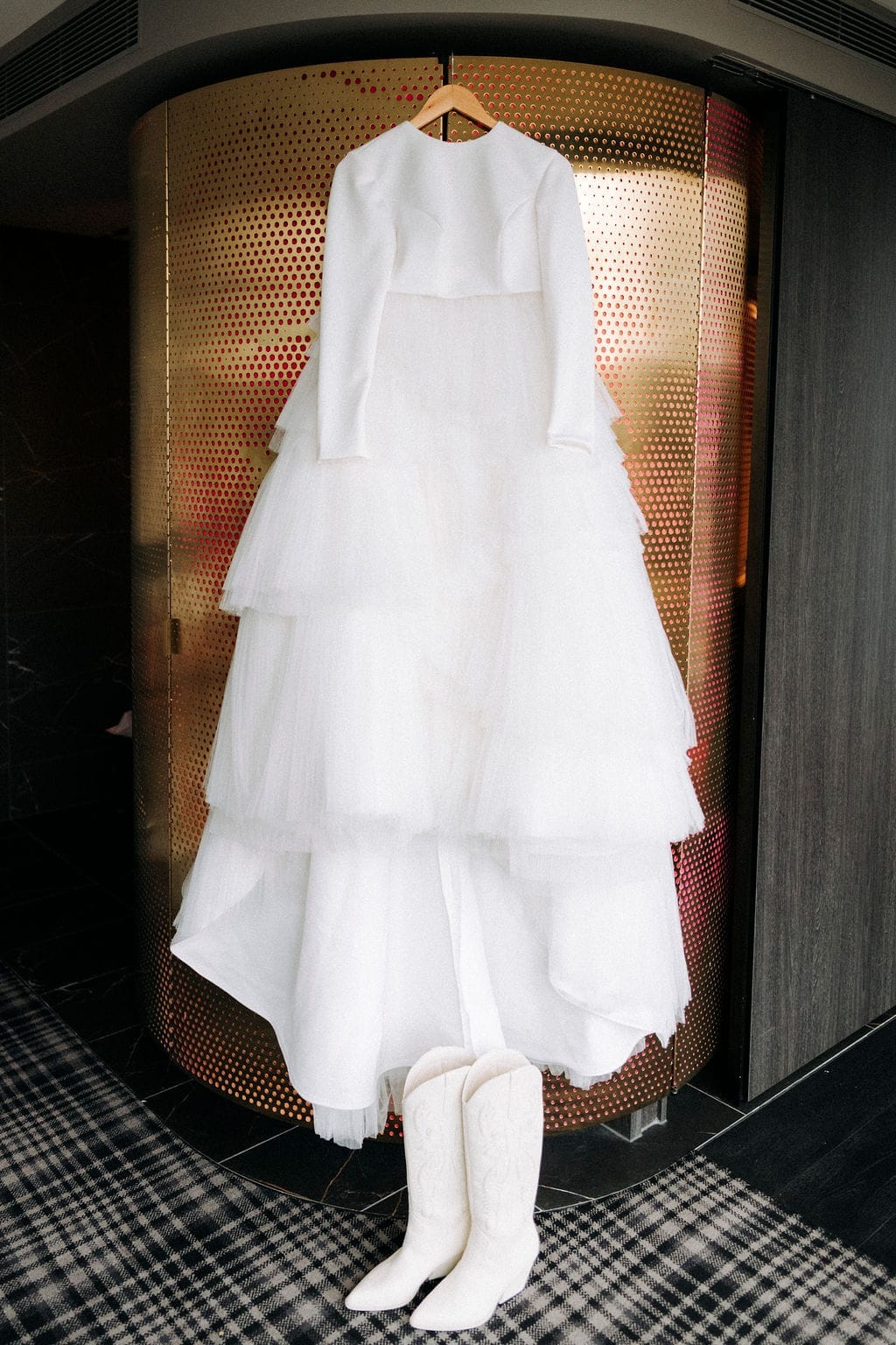 THE DRESS “I always knew I would wear cowboy boots and a cowboy hat (a nod to my love of riding). Then it was a matter of finding the perfect outfits to go with them. I fell in love with the KYHA Millie skirt and knew it was the one before I even tried it on. I then complemented it with the most perfect custom suit from Vasiliki Couture. Vicki was just gorgeous, and nothing was too difficult. She made the process so seamless, and I loved working with her. She made me feel like I was part of the family.”