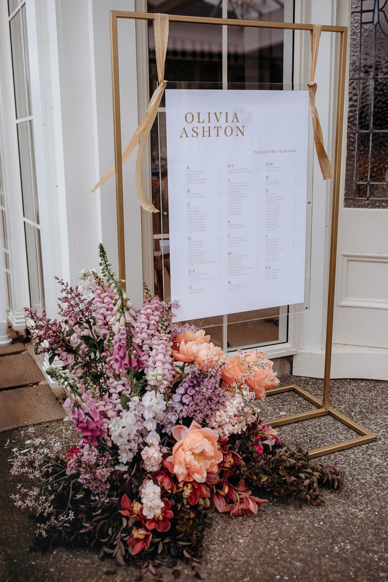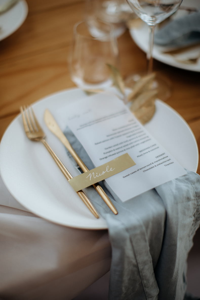 FAVE DETAILS “The flowers were amazing, I knew I wanted this to be a big focus but they really took my breath away and Naomi at Leaf & Honey was a dream to work with. One of my favourite arrangements was the flower girl basket, it was just so sweet. Also the archway was absolutely stunning and, of course, the car exploding with flowers. I loved the table settings as well, Naomi sourced fold foliage, which worked so well with the cutlery and menus. Amanda, our planner, of Amanda Norwood Design made our place cards from sheets of gold, a real labour of love that all came together perfectly. They were quite sharp though and we were worried someone would hurt themselves.”