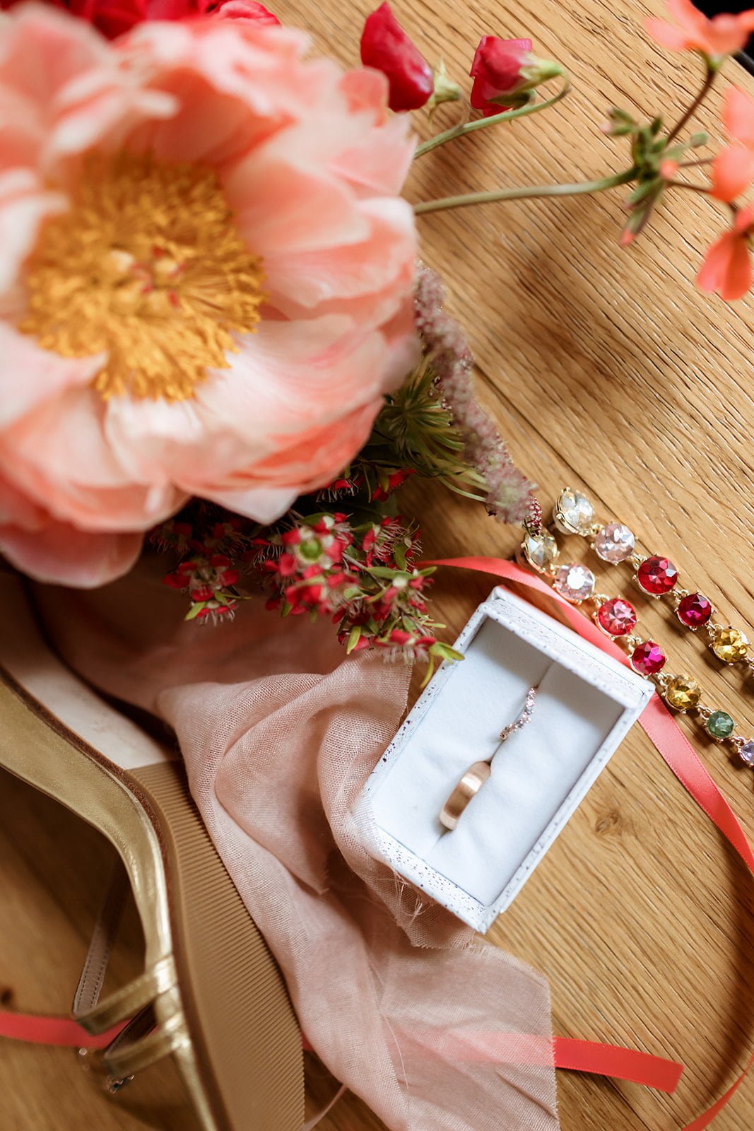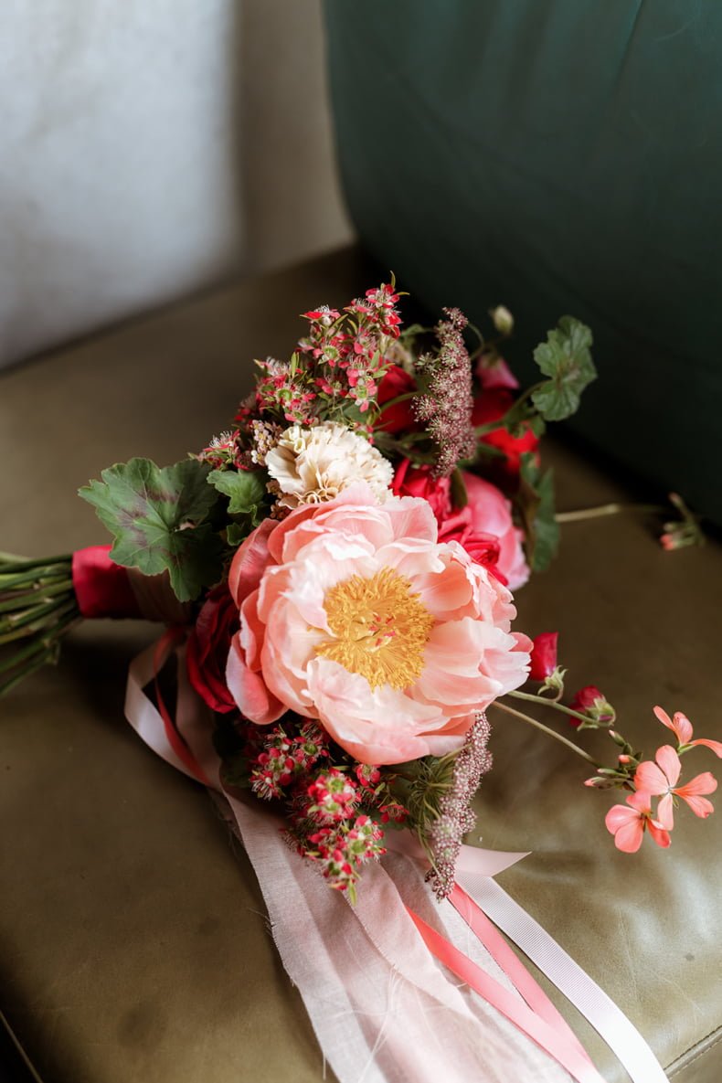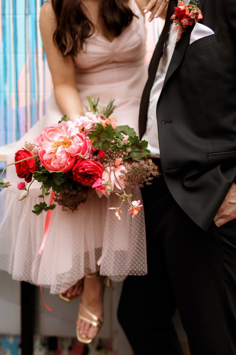 FAVE DETAILS “I wanted lots of colour, and our florist Laura was able to create the most gorgeous bouquet, using my dress and earrings as inspiration. I LOVED my earrings – they caught my eye on Jimmy’s season of The Bachelor, Holly was wearing them. I tracked them down after a lot of sleuthing and managed to grab a pair when the company added a story saying they had found three extra pairs! I had literally had a dream about them, so I knew they were a fun detail that I wanted on the day.”