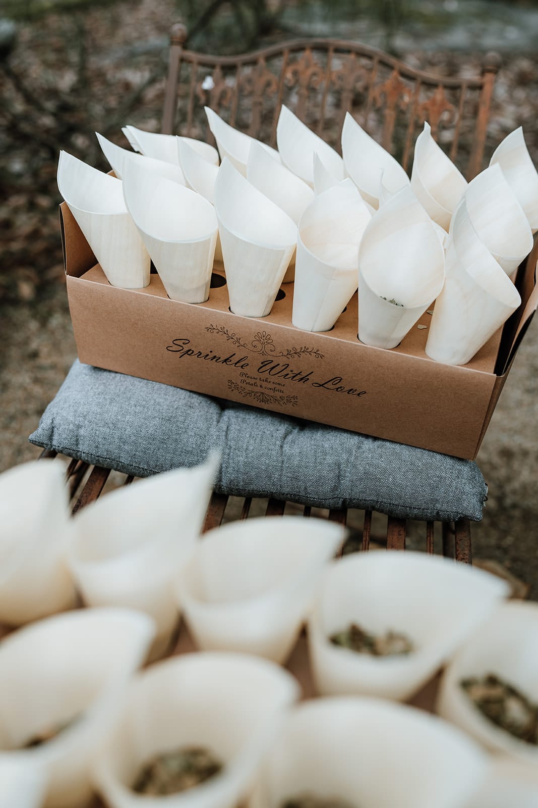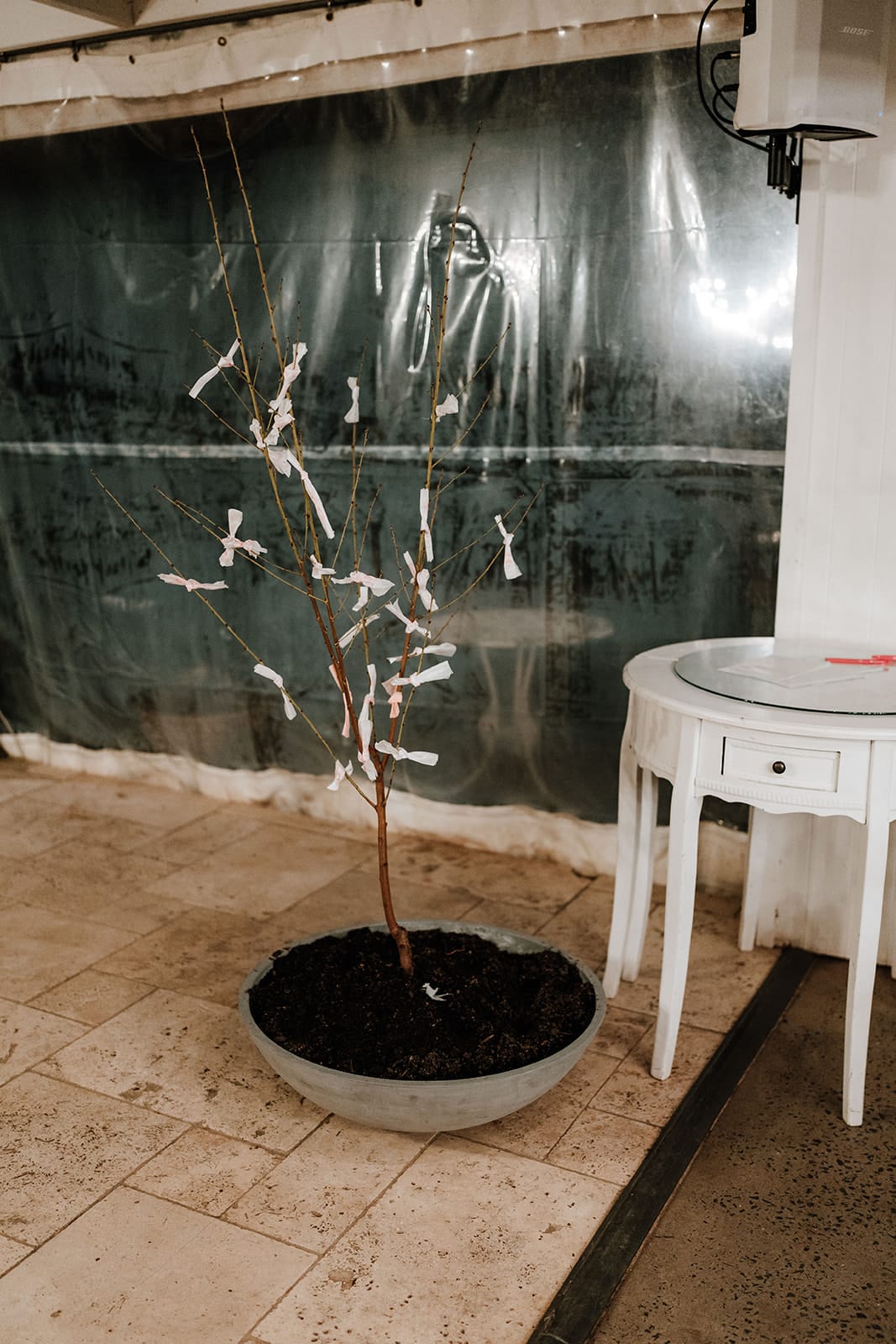 COOL CUSTOM “To incorporate our love of Japan, we planted a Japanese plum blossom during our ceremony. There is a Japanese practice where well wishes are written on strips of paper and tied to a branch. This practice stems from a festival [that] celebrates two star-crossed lovers. During our ceremony, after planting our tree, we both wrote a well wish and tied this to our tree. We then asked our parents and bridal party to write their own well wishes and tie this to the tree. After the ceremony, remaining guests could do the same.”
