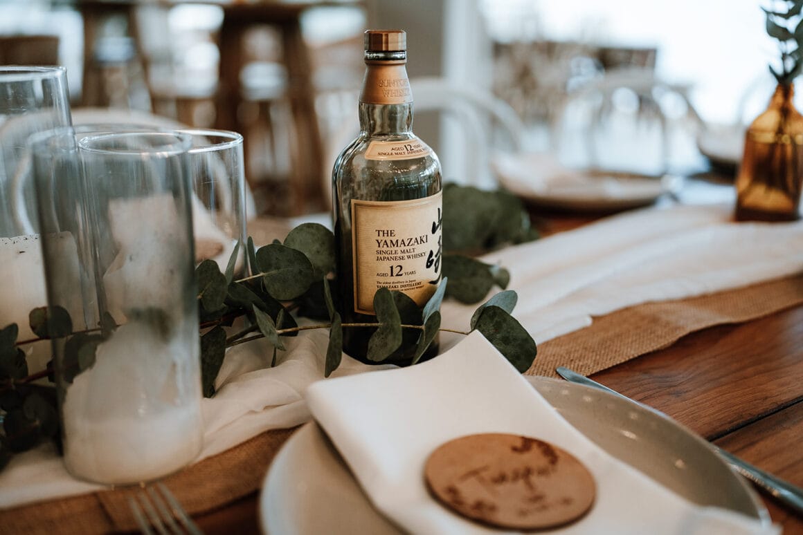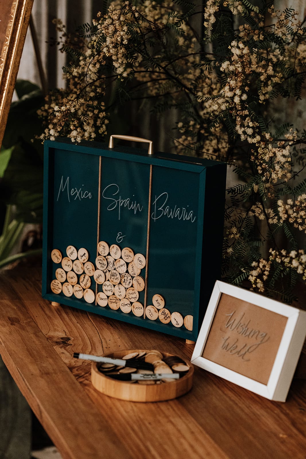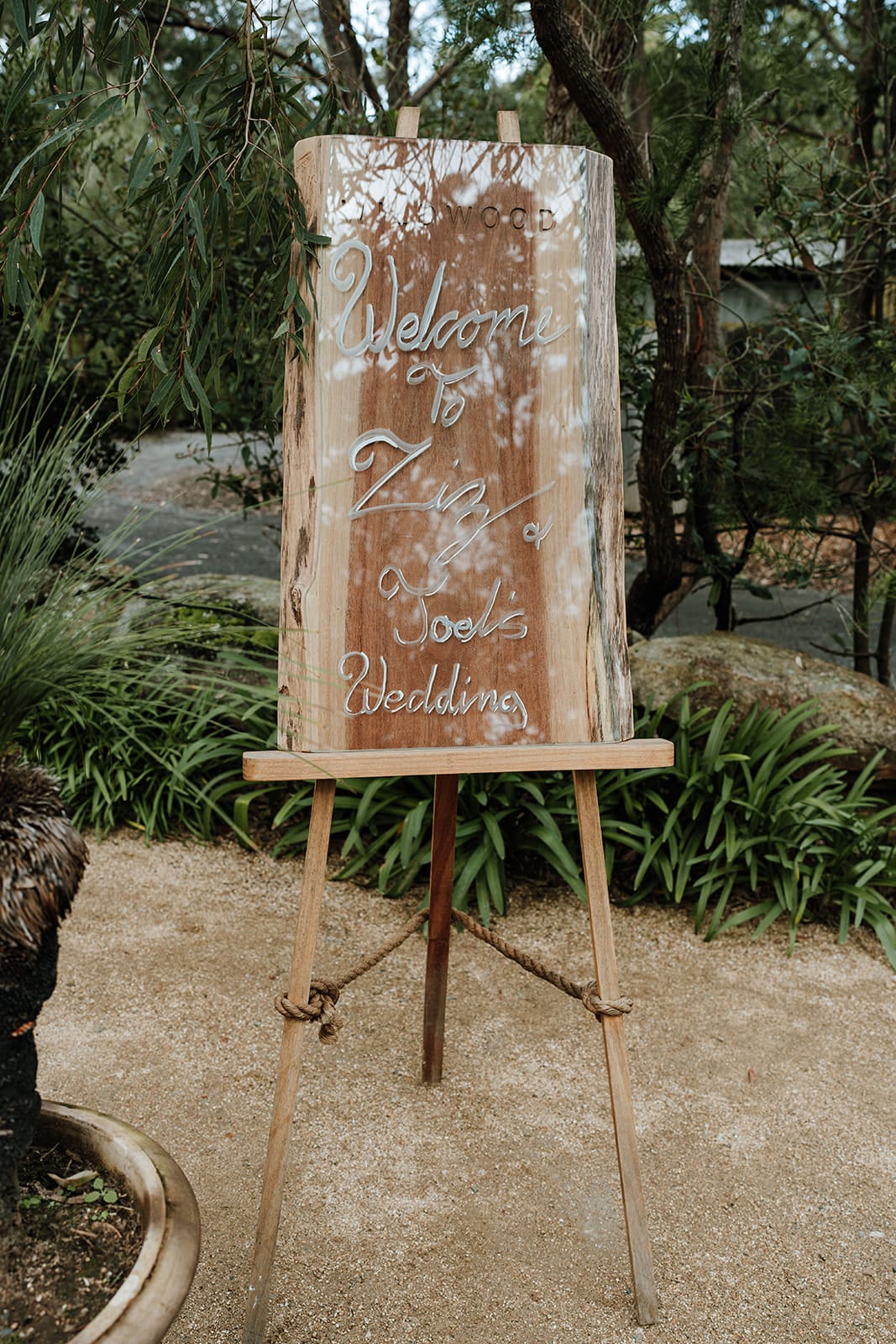 FAVE DETAILS “Rather than purchasing jewellery, I wanted to wear the laser-cut cherry blossom earrings Joel had hand-made for me many years ago. These also fit in with our natural aesthetic of timber and greens. For Joel, I hand-made his button holes after [we designed them together]. We also crafted flower collars for two of our cats using silk flowers. Other details on the day we created were our cake topper, honeymoon signing game and the bar sign. These items reflected our shared loves in life, our cats, travel and good cocktails.