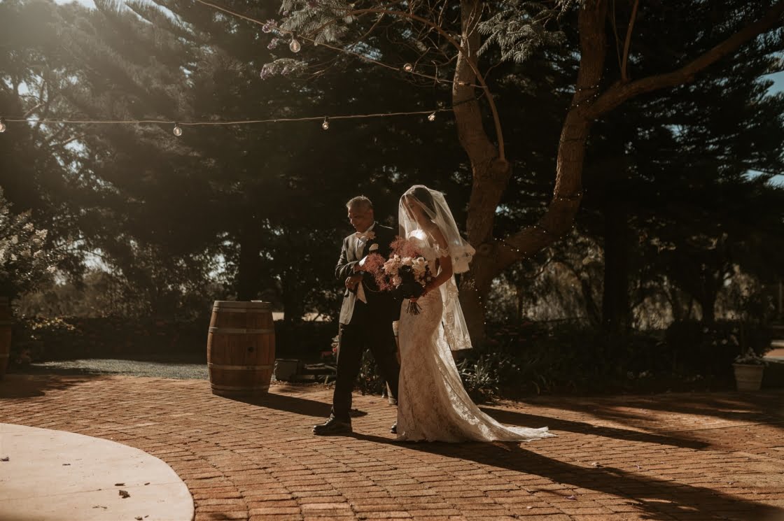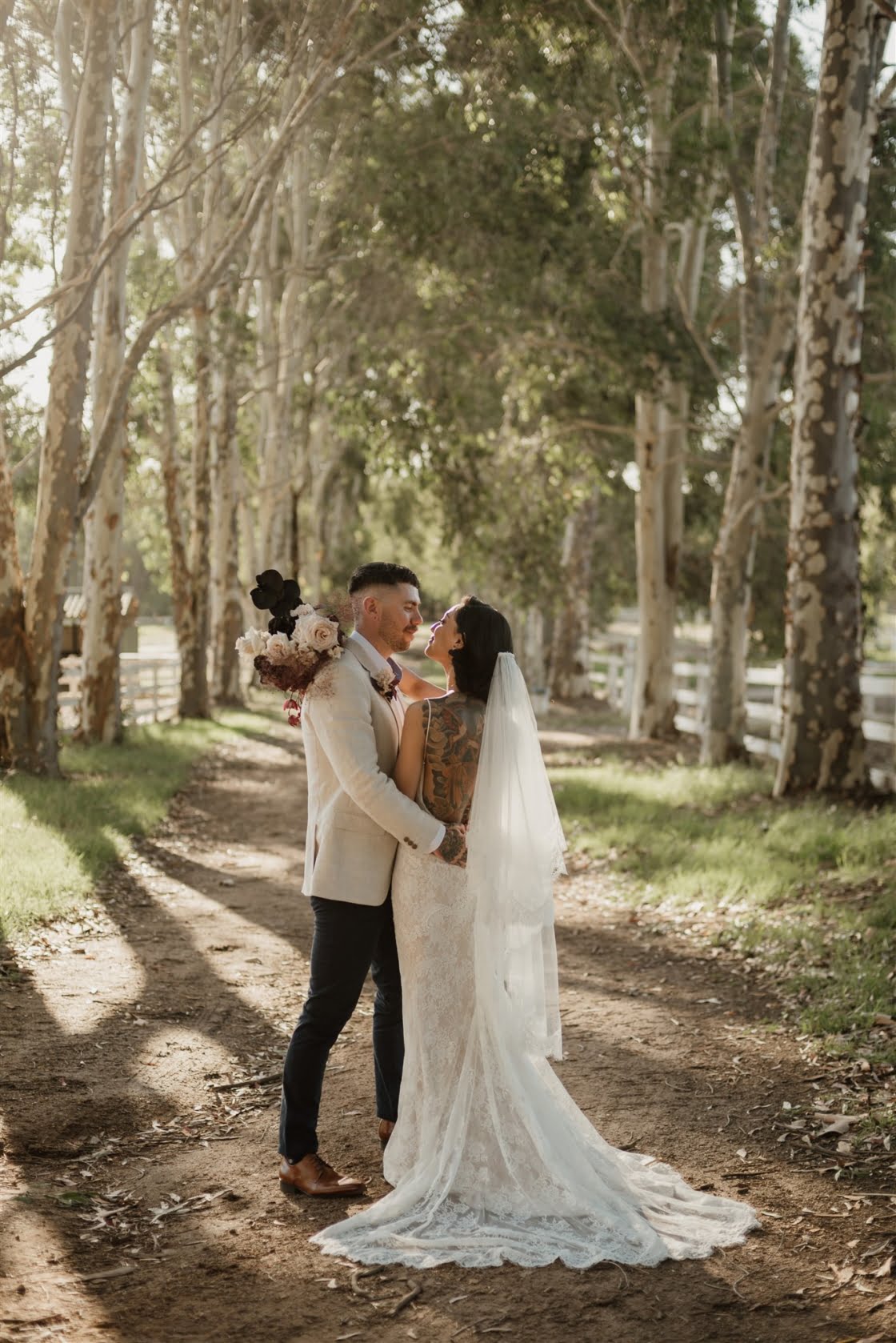 CONTRIBUTING VENDORS Photographer Ring & Veil Cinematographer Samuel Pettit Florist Honey Bunch Botanicals Stationery Adam Truarn via Wright Street Collective (Tattoo Art Work) & Margo and Bees (Invitations & Place Cards) Ceremony & Reception BrookLeigh Estate Food Truck Eat No Evil Drink Truck Caravan and Tonic Cake, Tart & Cannoli Tower Dolcetto Patisserie & Cafe Other Desserts Sweet Purpose Perth, Yo Donuts Perth, Macarons by Sky, M Town, Bake 180 & Sue Lewis Chocolatier Cake Topper Bee3Gifts via Etsy Wedding Favours Lavender Home Hire Items Black Label Events (Dining Tables, Signing Table & Chairs), Little Miss Vintage (Ceremony Rugs) & ArtyAlphabet via Etsy (Personalised Napkin Rings) Napkins MYER Vintage Disposable Cameras Disposable Camera Company Antique Mirrors & Welcome Sign Anthony Does Tattoos THE BRIDE Bridal Gown, Boutique & Veil Bridal by Aubrey Rose Pyjamas & Gowns All Things Nice Shoes Jimmy Choo Earrings & Fragrance Gucci Hair Adriana’s Hair Salon Makeup Elona Commerell Artistry via Muse Studio Collective Bridesmaid Dresses Shona Joy Bridesmaid Shoes ASOS THE GROOM Suit, Shirt, Pants & Belt Milano Menswear Shoes Aquila Cigars Devlins Grooming Soulsbys Groomsmen IntrasStudio (Gift Box)