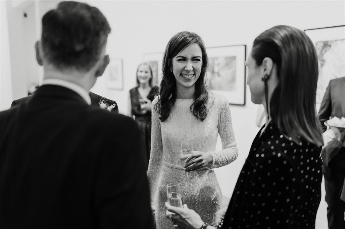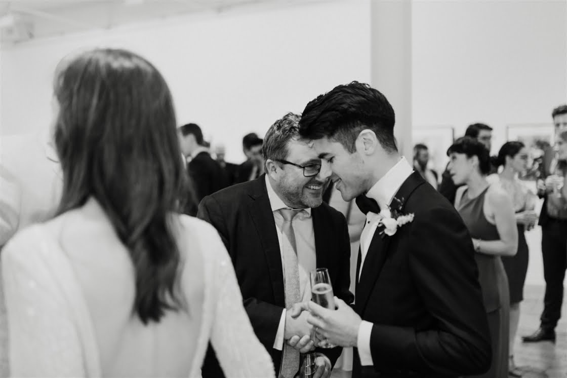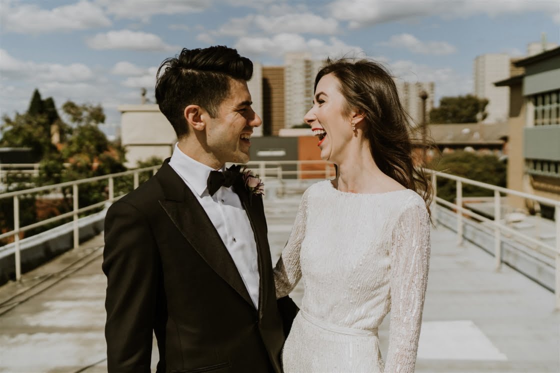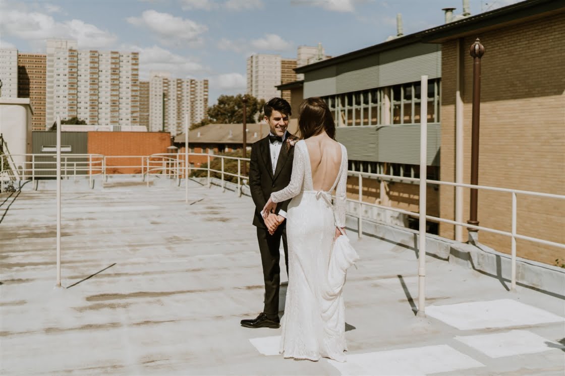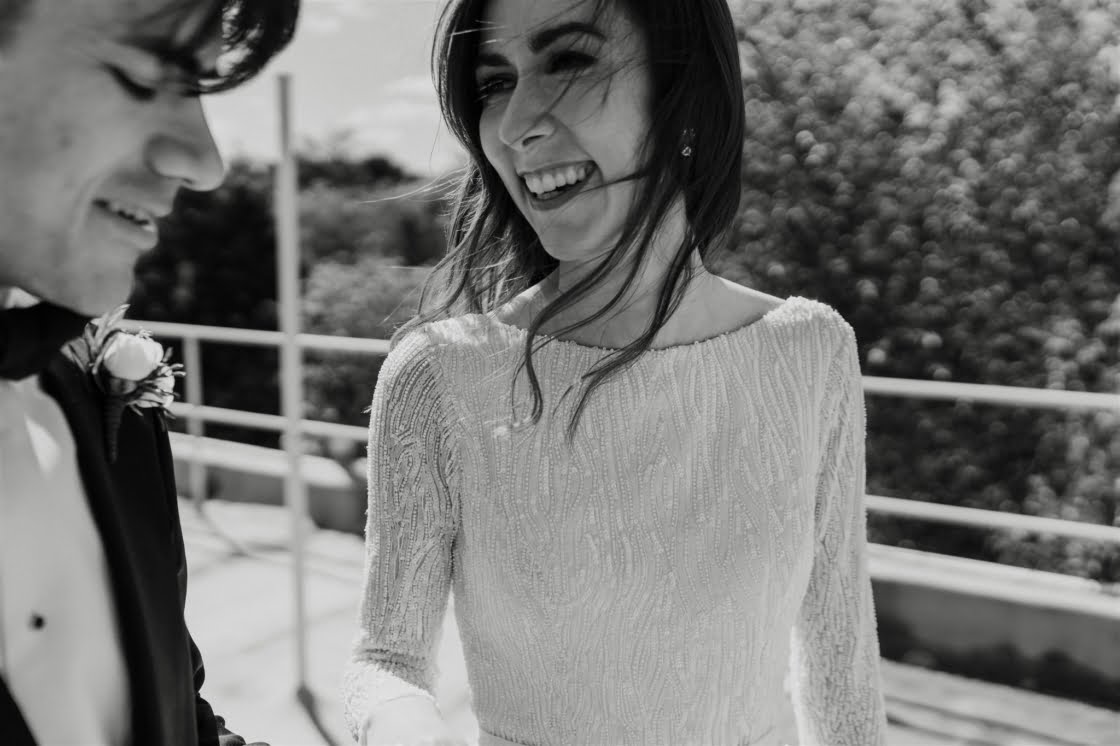 FAVOURITE MOMENT “We live in a really unique modernist apartment building with incredible gardens and wanted to make sure this was part of the day. It was the perfect place for us to meet up ahead of the wedding and share a toast with our families. We really loved having that intimate moment together at our home ahead of the big event.”