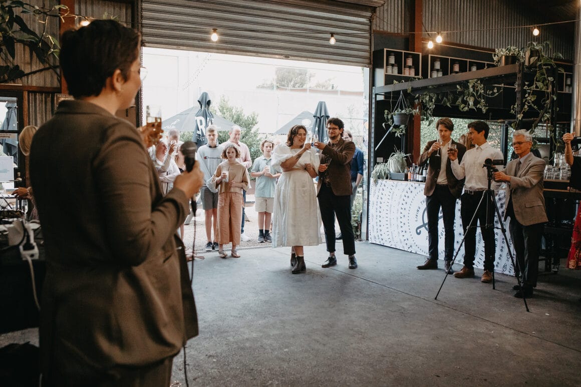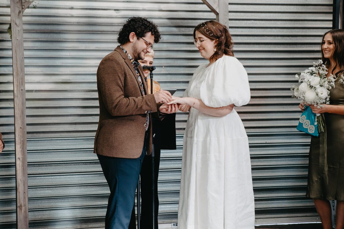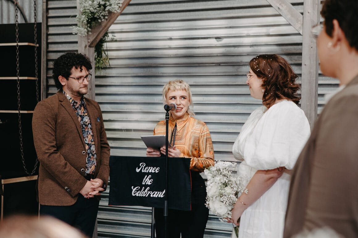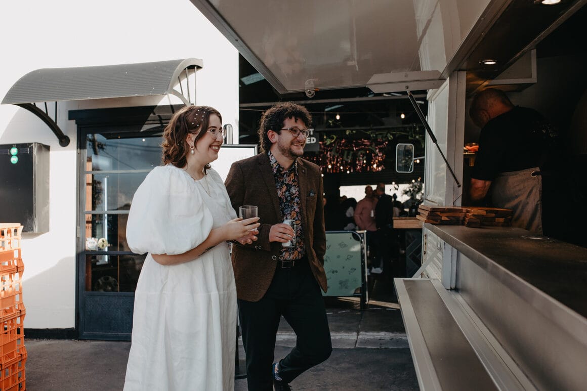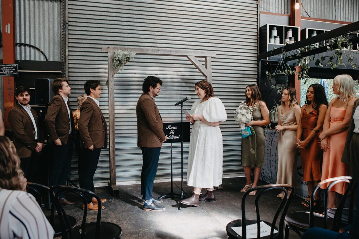 CONTRIBUTING VENDORS Photographer Lovegood Images Cinematographer Anna Jameson Florist & Stationery DIY Venue Commonfolk Café Food Trucks Gather Round Pizza Wagon Other Desserts Family Lighting & Sound Hire Clear Systems Celebrant & Entertainment Renee the Celebrant Rings Averie Jewellery via Etsy (Groom) & A Gilded Leaf (Bride) THE BRIDE Bridal Gown Designer Aje Shoes R.M. Williams Accessories Mejuri Hair & Makeup The Distinctive Dame Bridesmaid Dresses Beginning Boutique, Bec + Bridge Bridesmaid Shoes Chloe & Current Mood via Dolls Kill THE GROOM Jacket & Pants Politix Shoes Trent Nathan Socks Peggy and Finn Watch Treehut Grooming Drunken Barber Groomsmen Jackets Politix
