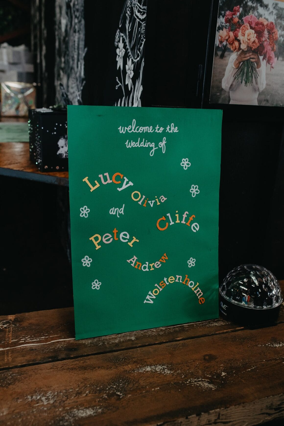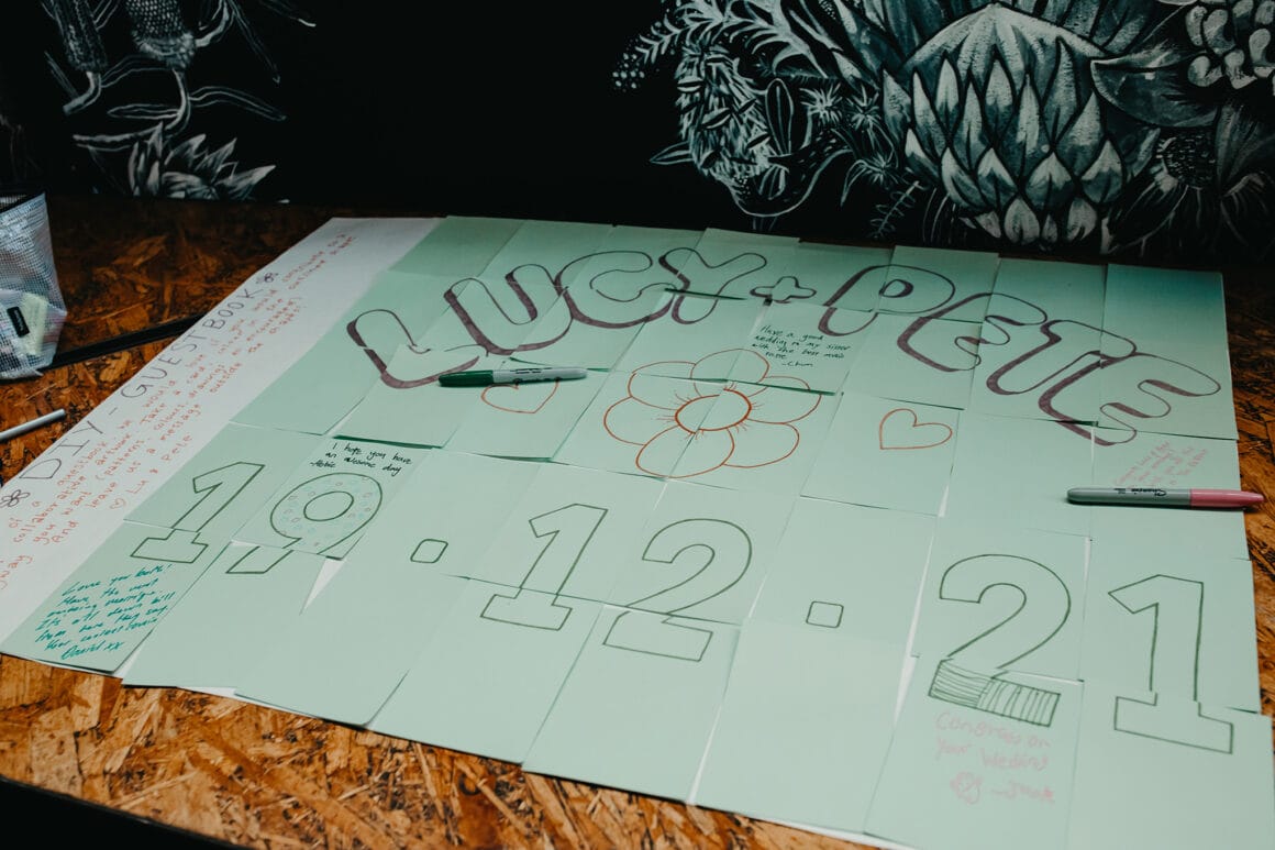 FAVE DETAILS “Lu handmade our incredible wedding sign [which hung] from the Commonfolk rafters. [It] looked absolutely impeccable. We also decided to go a bit rogue with the ‘signing book’ and turn it into an art project, where all the guests could drop an illustration/colouring in alongside their well-wishes! Still trying to figure out where in our apartment to hang it!