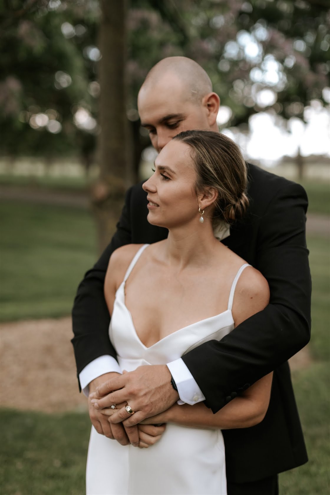 THE DRESS “Karen Willis Holmes grabbed my attention on Instagram so I organised an appointment between COVID lockdowns at the Armadale store. As I live 3.5 hours from Melbourne, I made a day of it, spending time with my mum and sisters. I tried one dress and absolutely loved it. I knew that was it straightaway and didn’t need to try any more. We were in and out in 20 minutes. The staff were lovely. Due to COVID I unfortunately could not return for fittings before the wedding so they sent my dress and veil to me via post and I had a local seamstress Lindy Kennedy do the alterations. She did a fantastic job.”