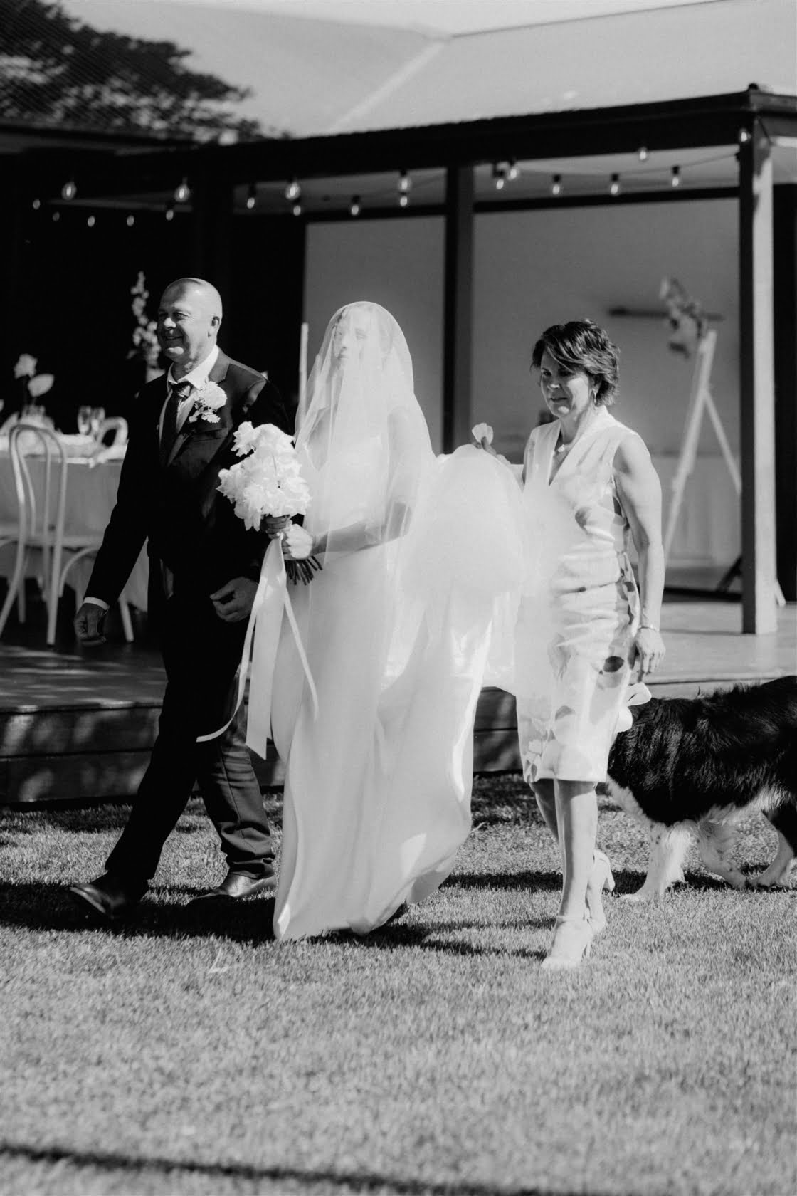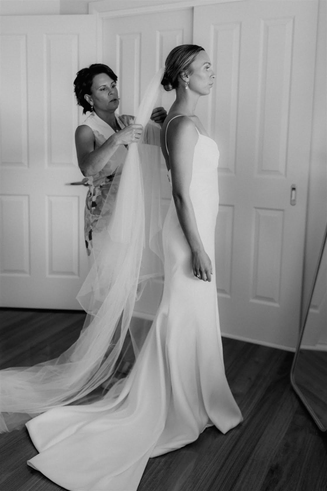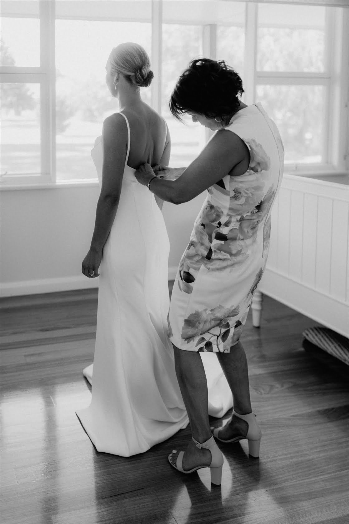 FAVOURITE DETAILS “We were so in love with every detail! My mum did and amazing job of the wedding cake – it was a six-layer chocolate mud cake infused with Chambord raspberry liqueur, filled with chocolate ganache and vanilla buttercream icing, served with double cream and fresh raspberries. We were also blown away with the flowers by Botany Green. Ben [from Botany Green] went above and beyond to make everything beyond perfect. He took control of the event and personally made sure everything went smoothly, he coordinated with all the other vendors to bring everything together – he was definitely BOG (best on ground) along with my mum, who spent months making sure every inch of her house, lawn and garden was perfect. Right up until the final moments before the ceremony. Nic got a photo of her mopping in her robe with her hair and makeup done!”