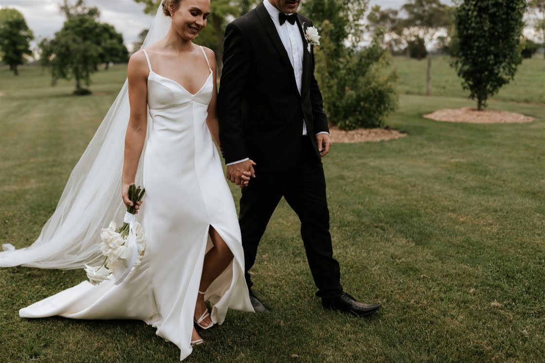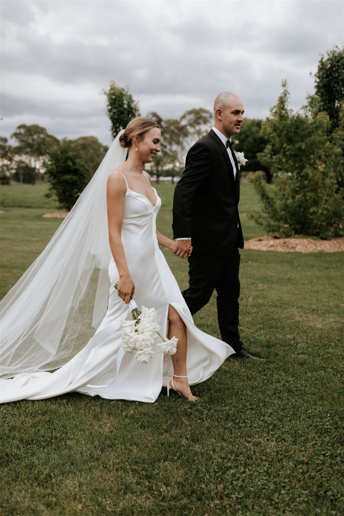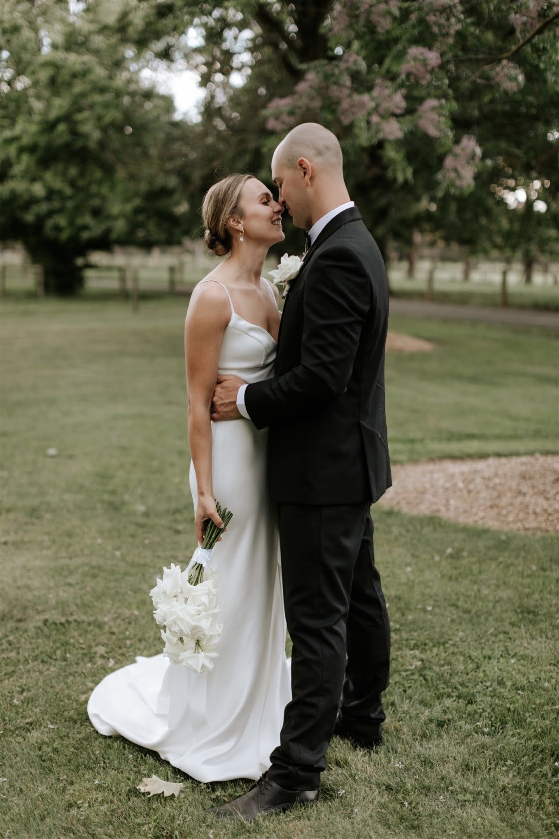 THE DRESS “Karen Willis Holmes grabbed my attention on Instagram so I organised an appointment between COVID lockdowns at the Armadale store. As I live 3.5 hours from Melbourne, I made a day of it, spending time with my mum and sisters. I tried one dress and absolutely loved it. I knew that was it straightaway and didn’t need to try any more. We were in and out in 20 minutes. The staff were lovely. Due to COVID I unfortunately could not return for fittings before the wedding so they sent my dress and veil to me via post and I had a local seamstress Lindy Kennedy do the alterations. She did a fantastic job.”