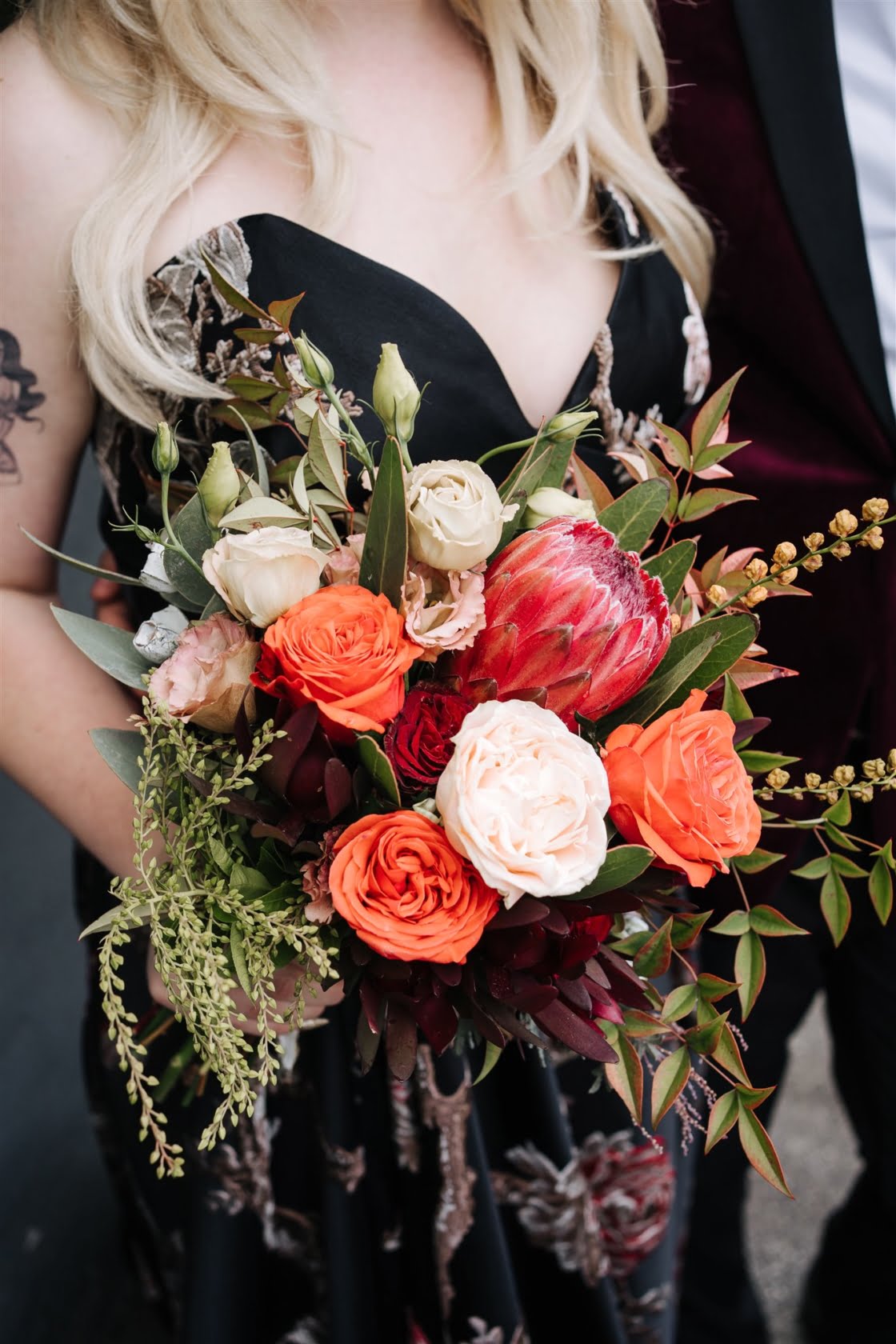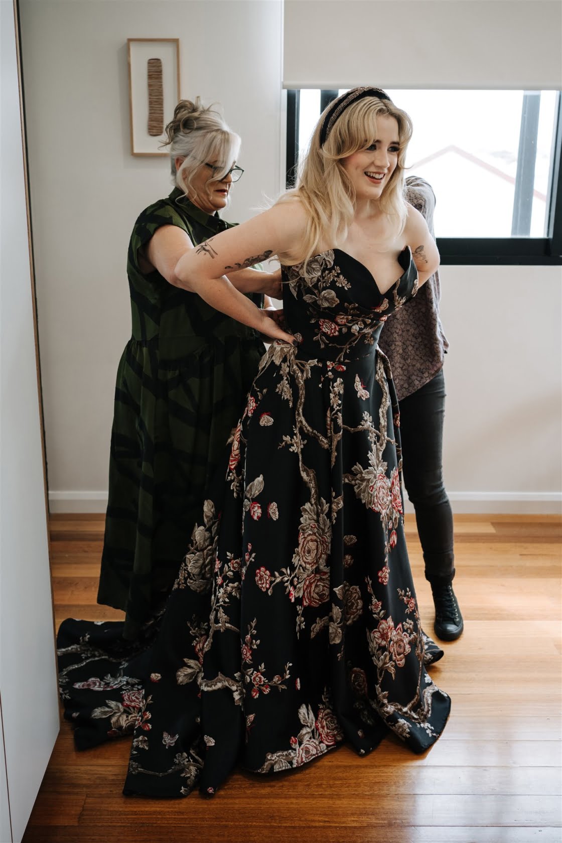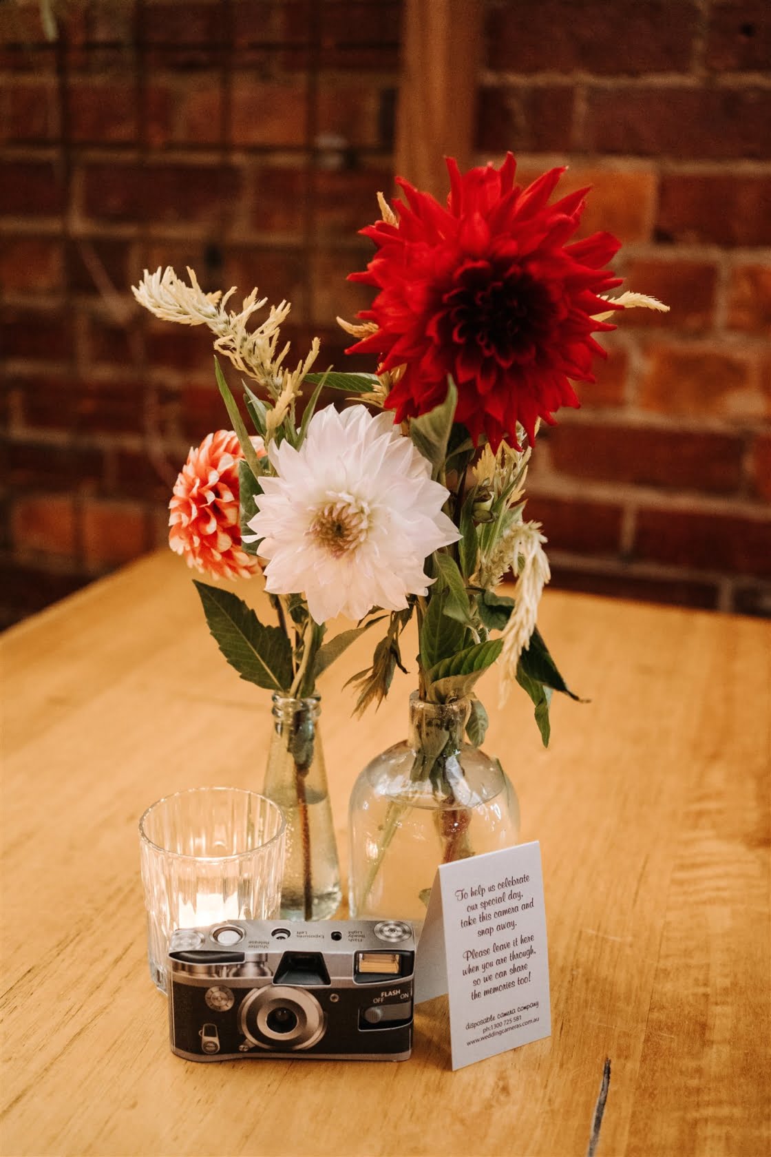 DIY “My mum, best mate and I did all the flowers for the reception, mainly to save some money, but it was a really nice experience to do something for the space with some of my closest women. I went to the Preston Market the day before, loaded up on a whole bunch of dahlias and a few other bunches, went to Art Stems on Lygon for a couple of more ‘special bunches’ and then we spent the afternoon making different arrangements.”