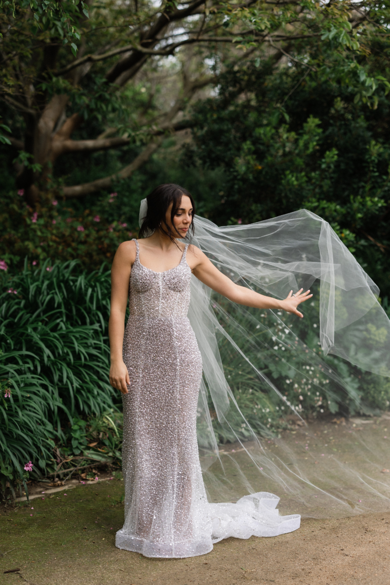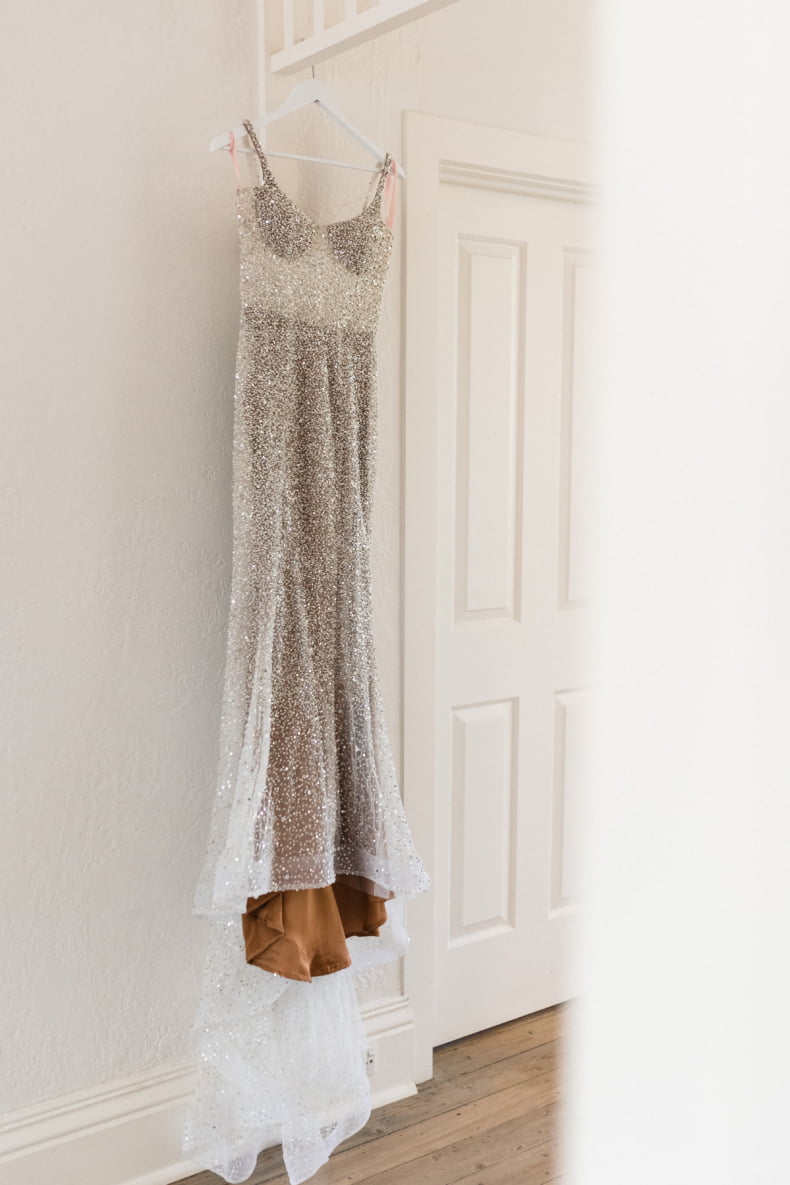 THE DRESS “Khya Studios – a fitted hand beaded dress. Was a disco ball in a dress and everything I wanted in life. It was the first wedding dress fitting I had and I just new in my waters it was the right one.”