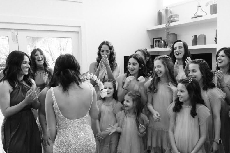 TOUCH OF TRADITION “We had a traditional Jewish wedding with the chuppah and a rabbi. Our bridal party was enormous – seven bridesmaids and seven groomsmen, nine bubble girls and boys. We have a huge family and wanted them with us every step of the way.”
