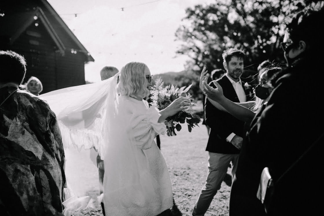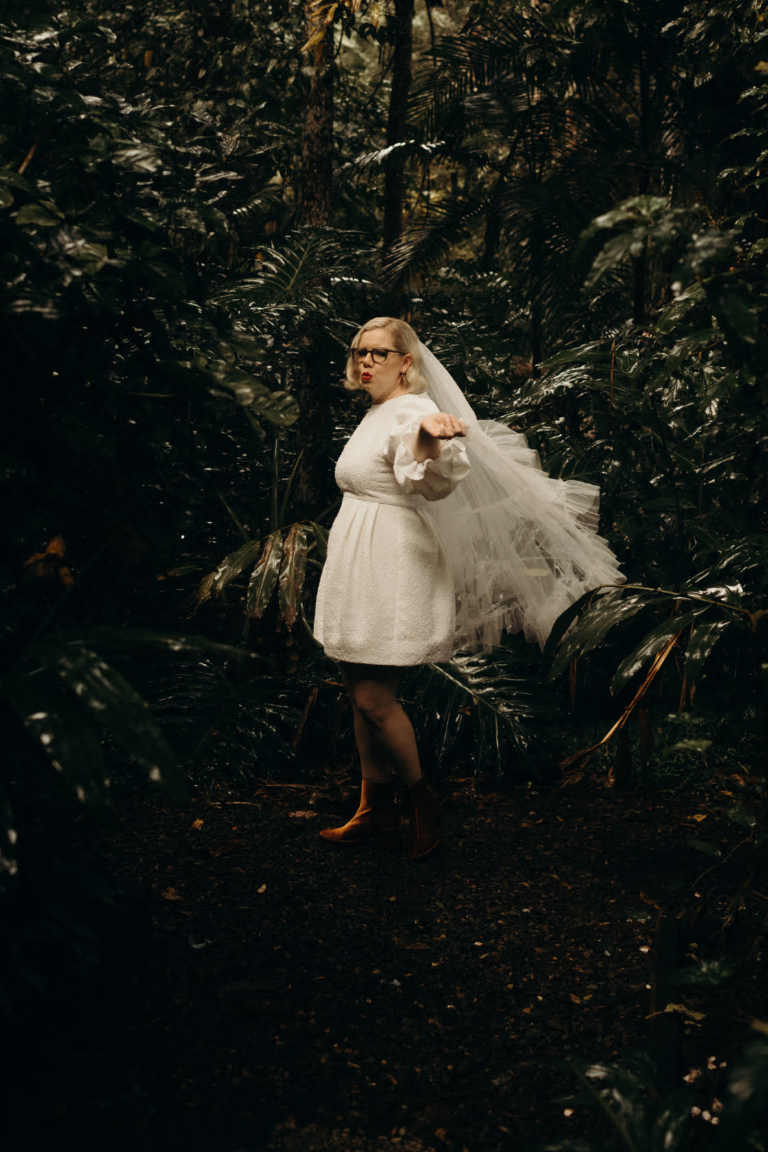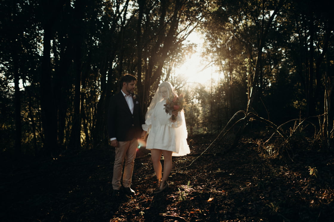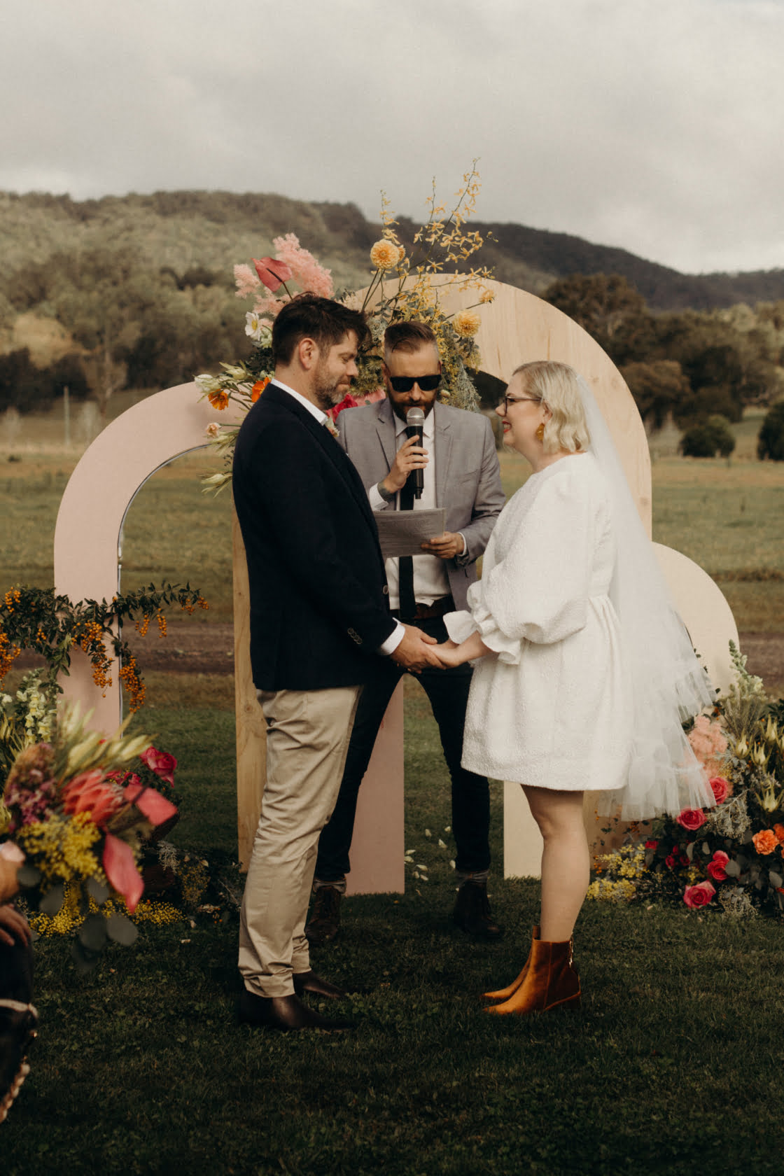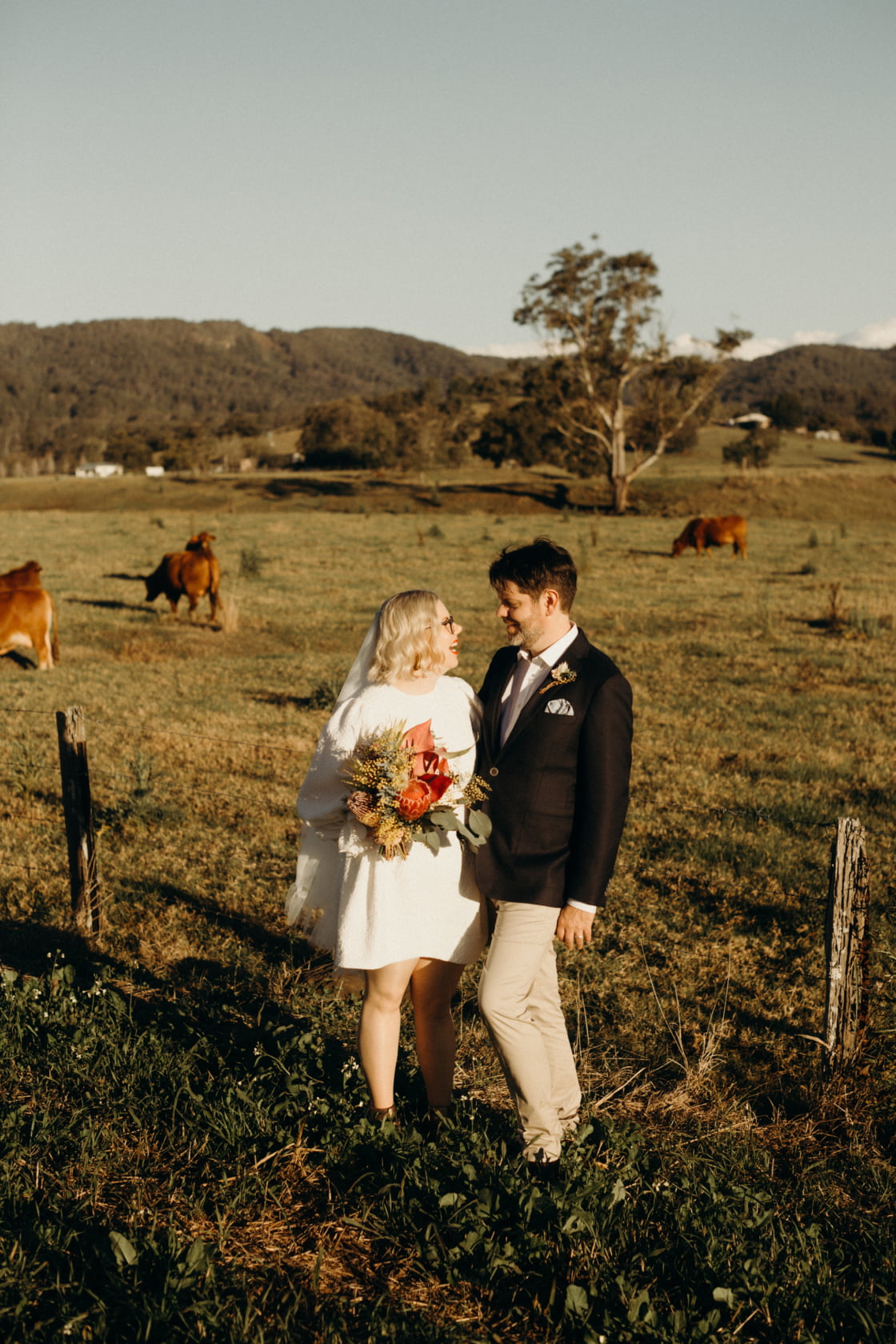 We’re loving everything about Megan’s short dress and boots combo – check the fun casual bride vibes! Swoon. It was the perfect look for her nups to Chris in the Sunshine Coast Hinterland.