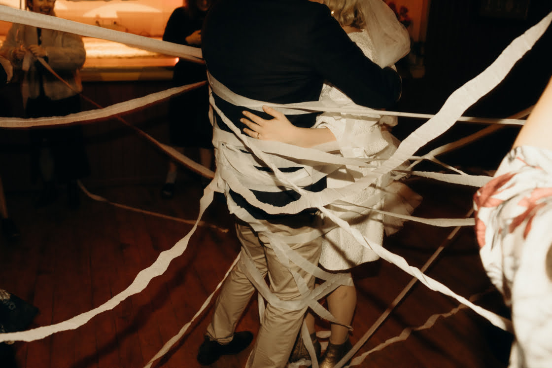COOL CUSTOMChris’s family has a tradition that involved us being wrapped in streamers during our first dance. While family all knew it was coming, a lot of friends had never seen it, so that was pretty fun. Megan’s father passed before the wedding so Chris wore a set of his cufflinks – that was really sweet. Both our mums were the ring bearers.”