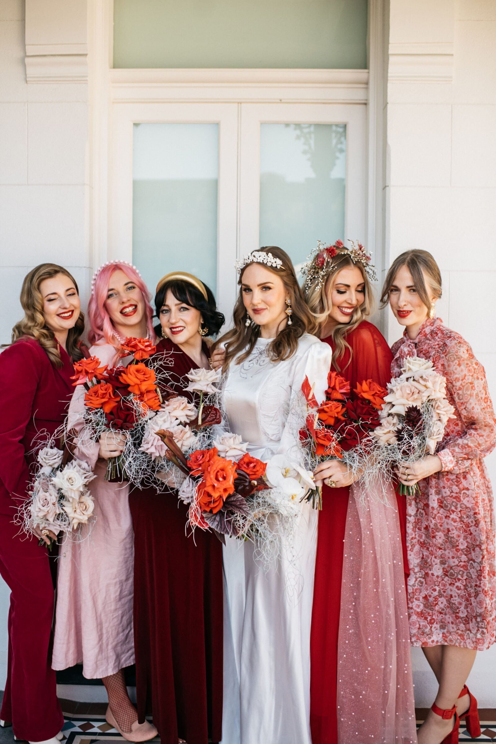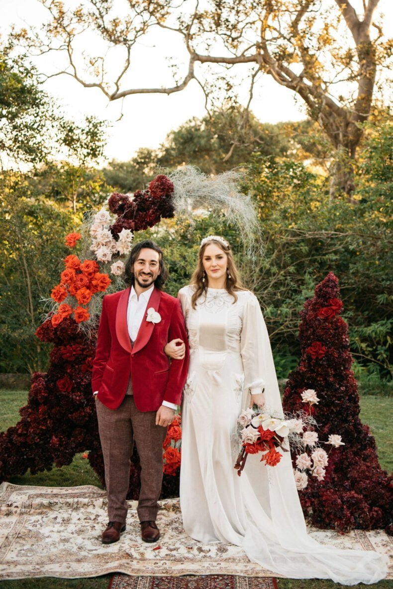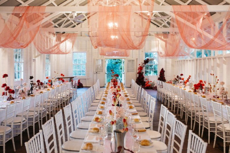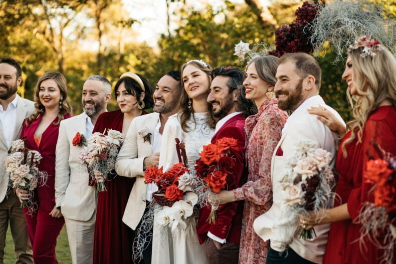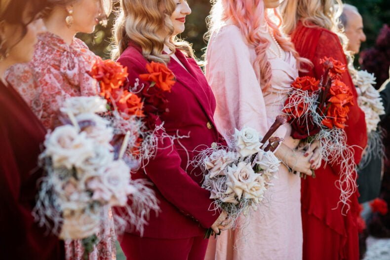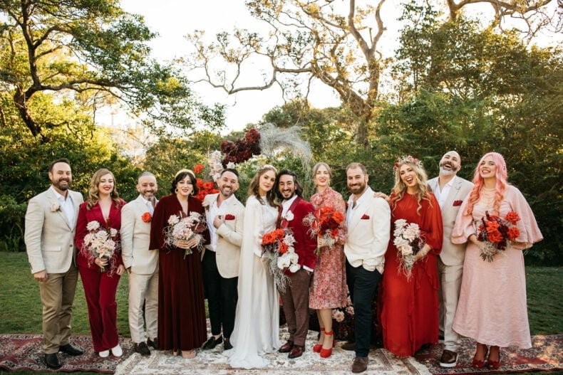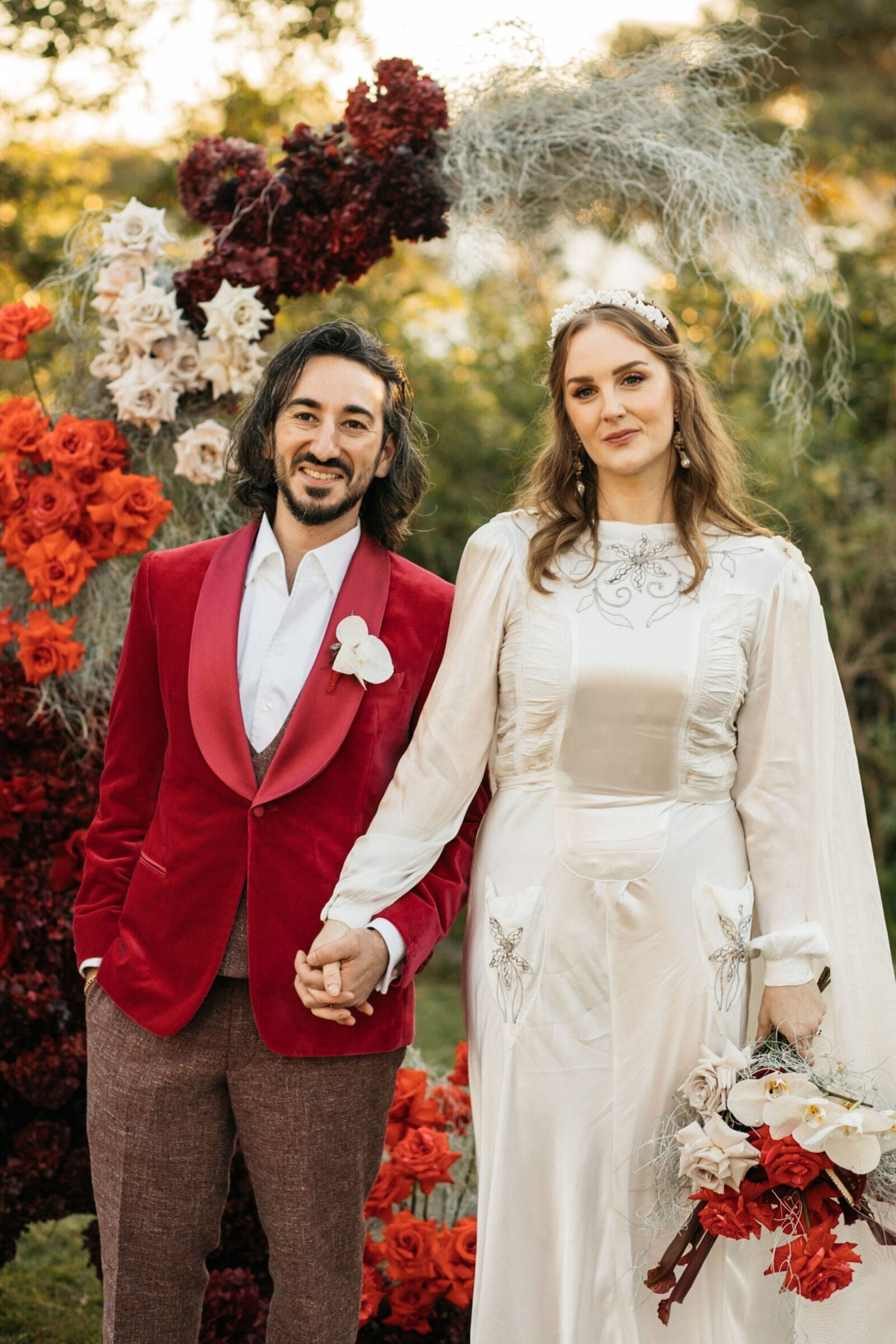 Seriously, how straight-up magic is Morgan and Adam’s big day? The colour palette, the red velvet suit, the styling, the wedding parties… We’re so here for all of it!  “The aesthetic we were going for was a more elegant version of ’70s era glam-rock meets 1930s,” the newlyweds share (um,YES!). “We chose a pink and red colour scheme and wanted guests to feel fabulous and comfortable.”