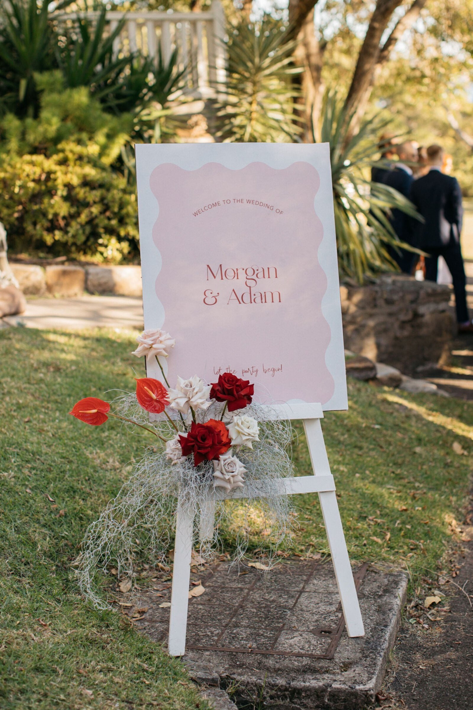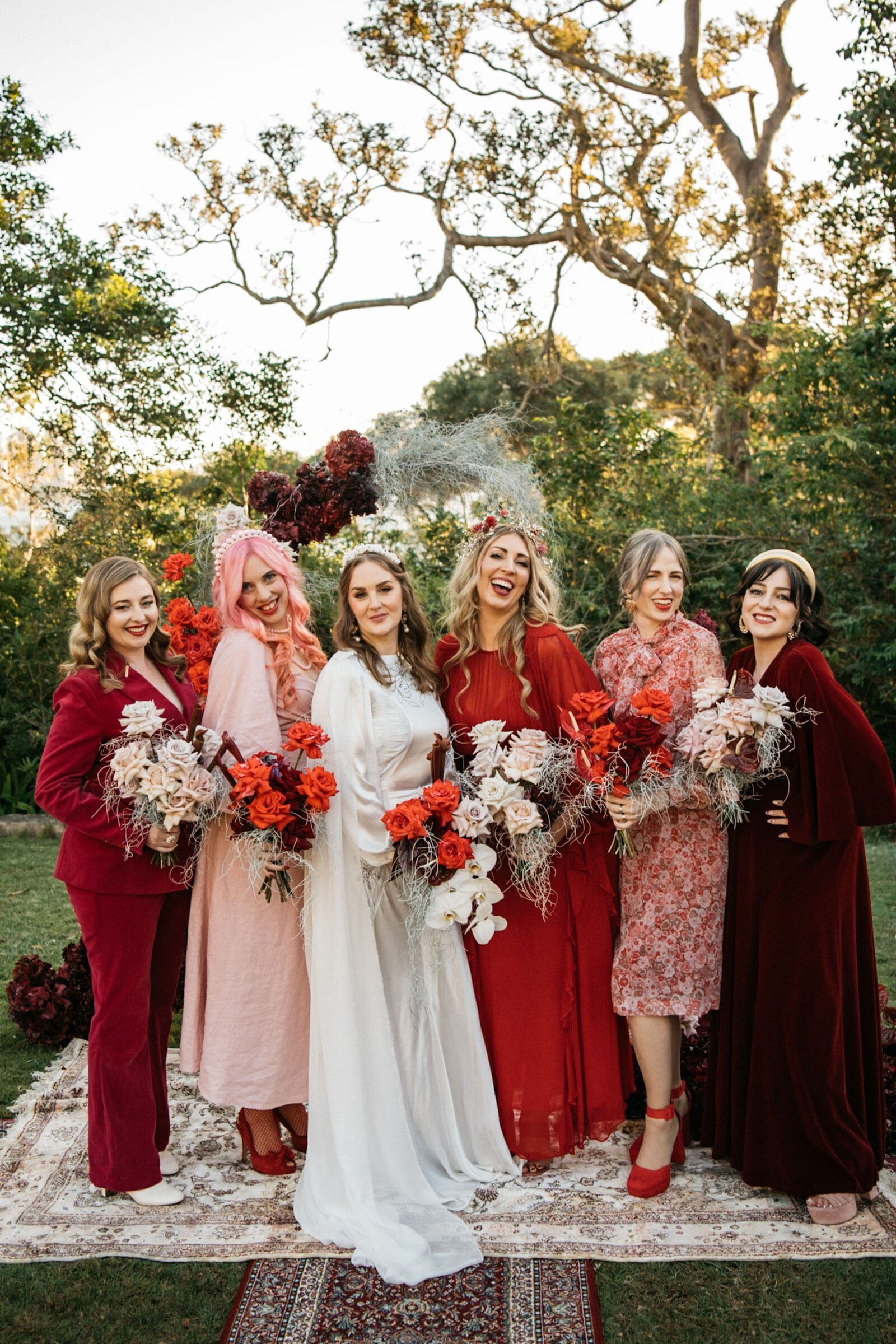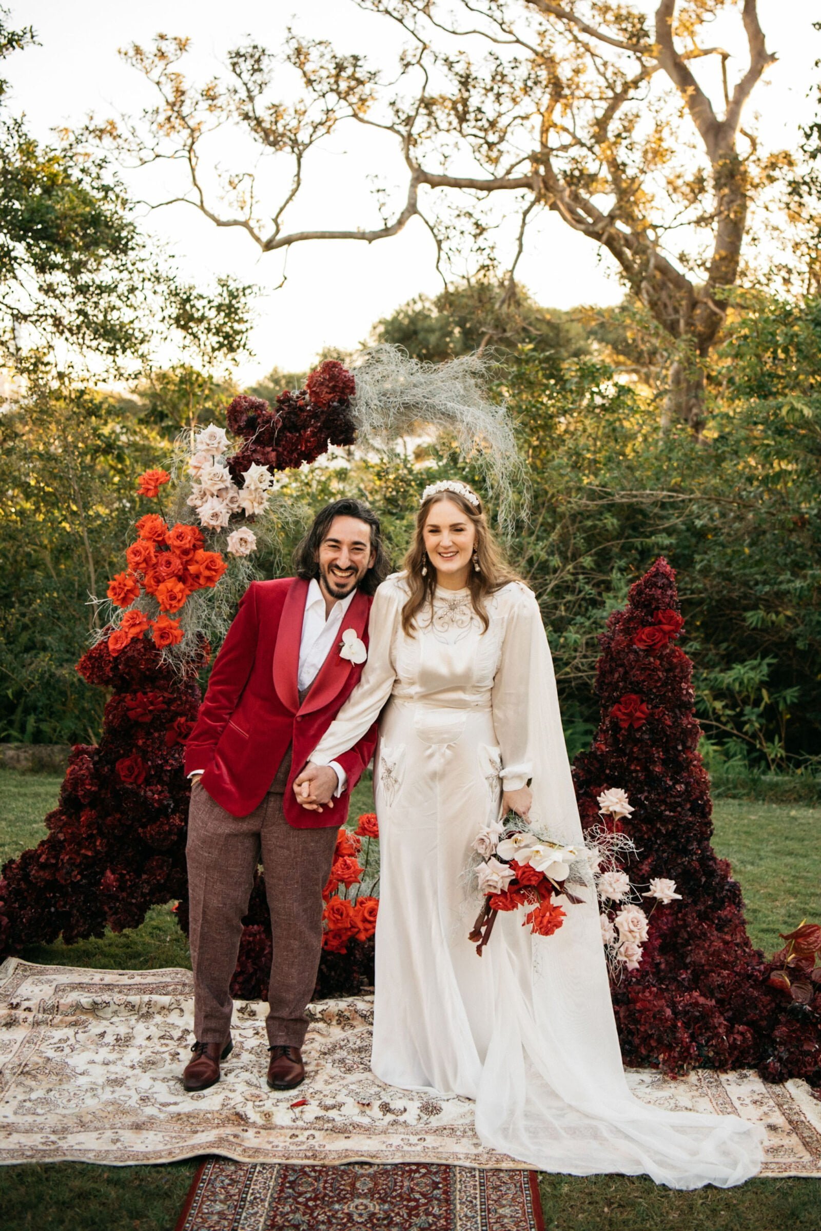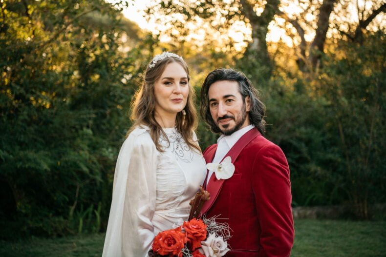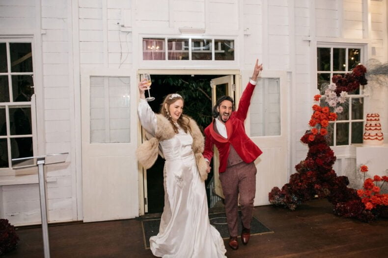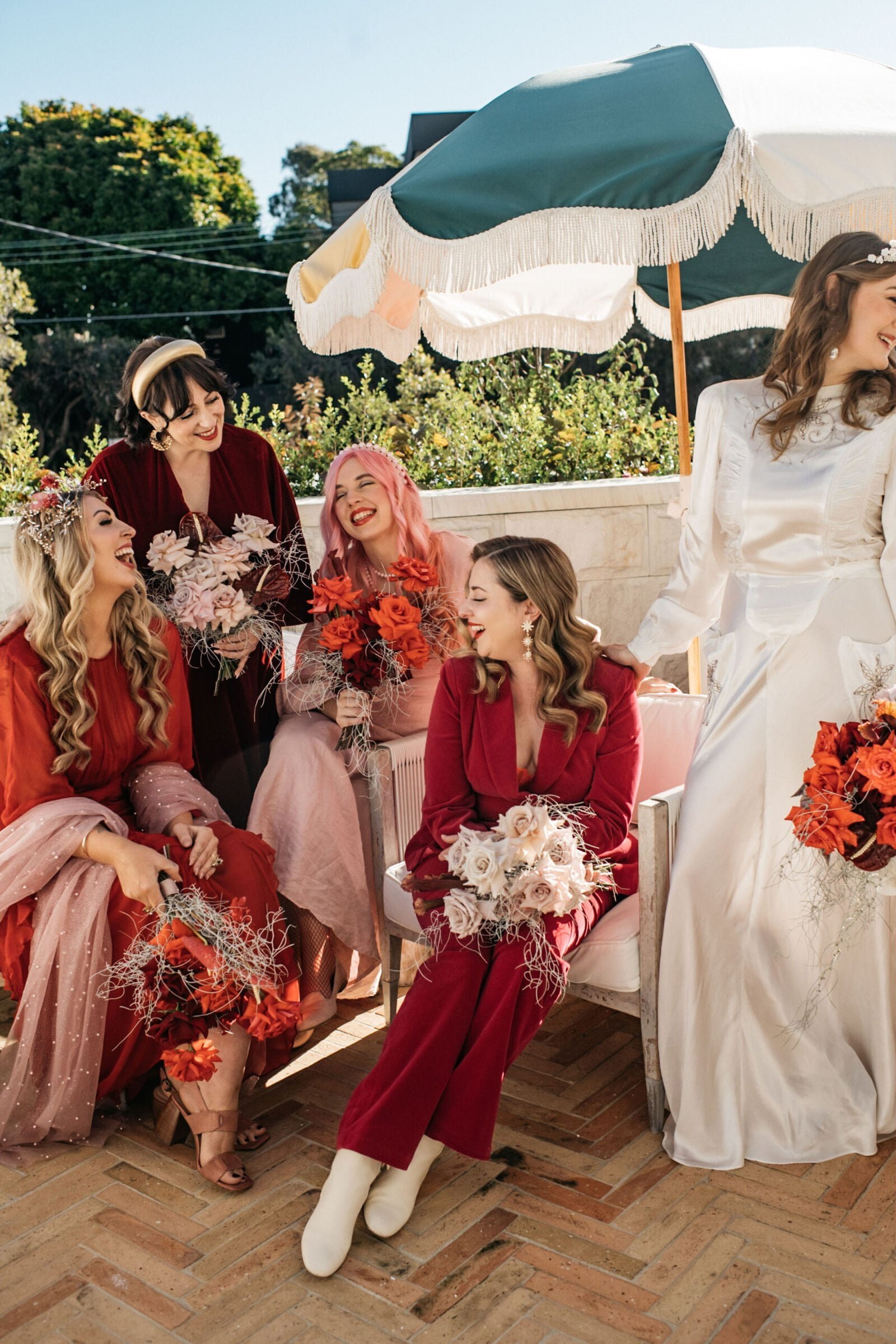 Seriously, how straight-up magic is Morgan and Adam’s big day? The colour palette, the red velvet suit, the styling, the wedding parties… We’re so here for all of it!  “The aesthetic we were going for was a more elegant version of ’70s era glam-rock meets 1930s,” the newlyweds share (um,YES!). “We chose a pink and red colour scheme and wanted guests to feel fabulous and comfortable.”