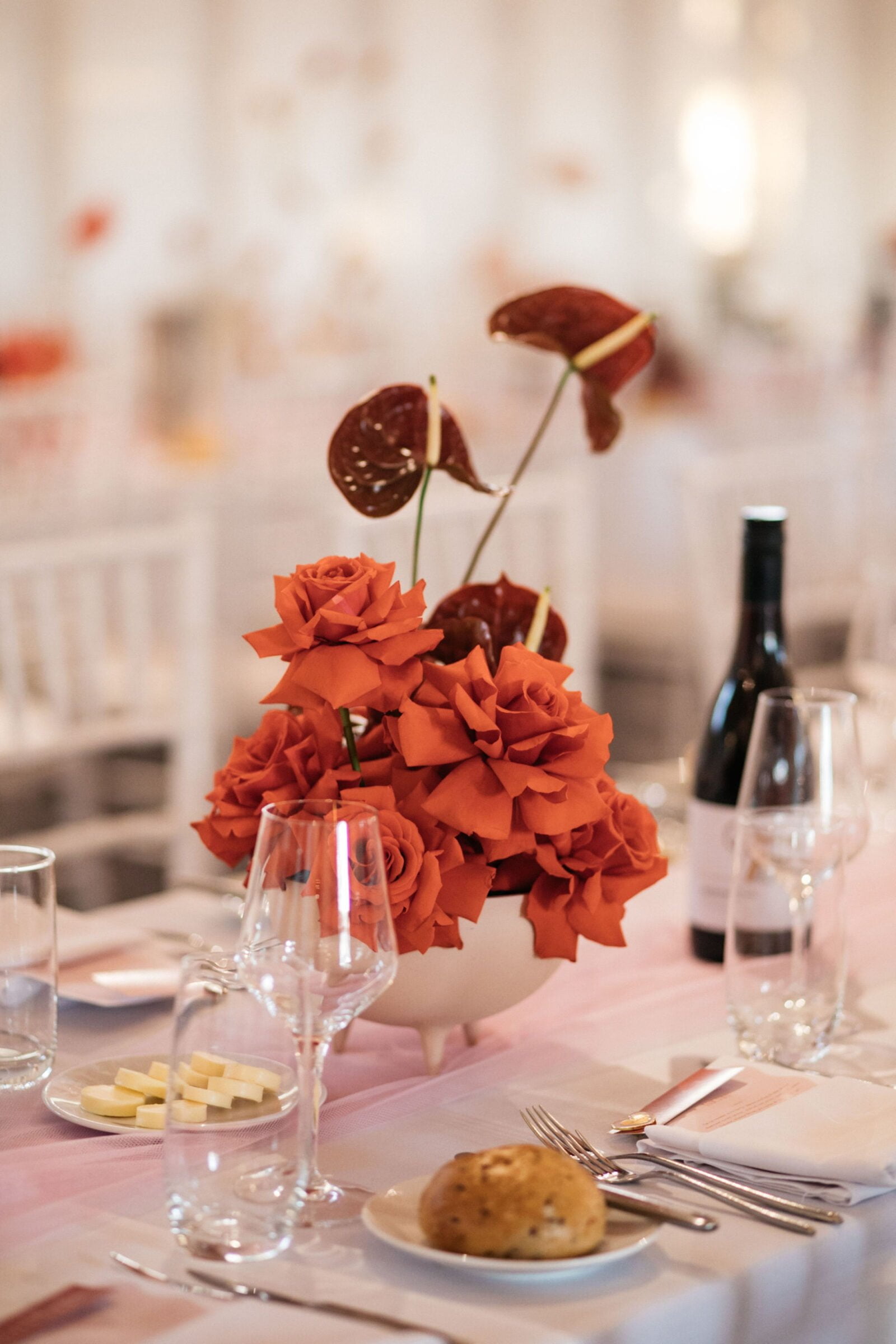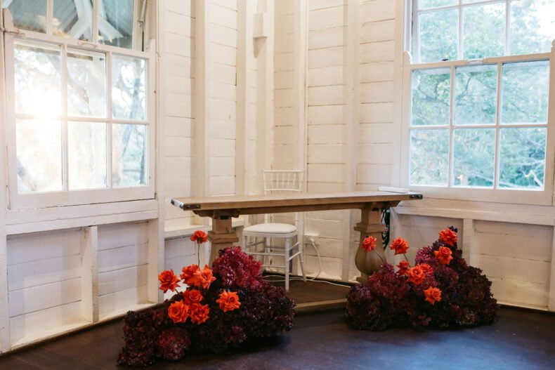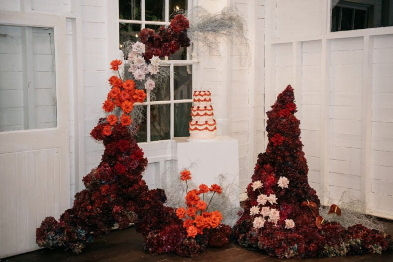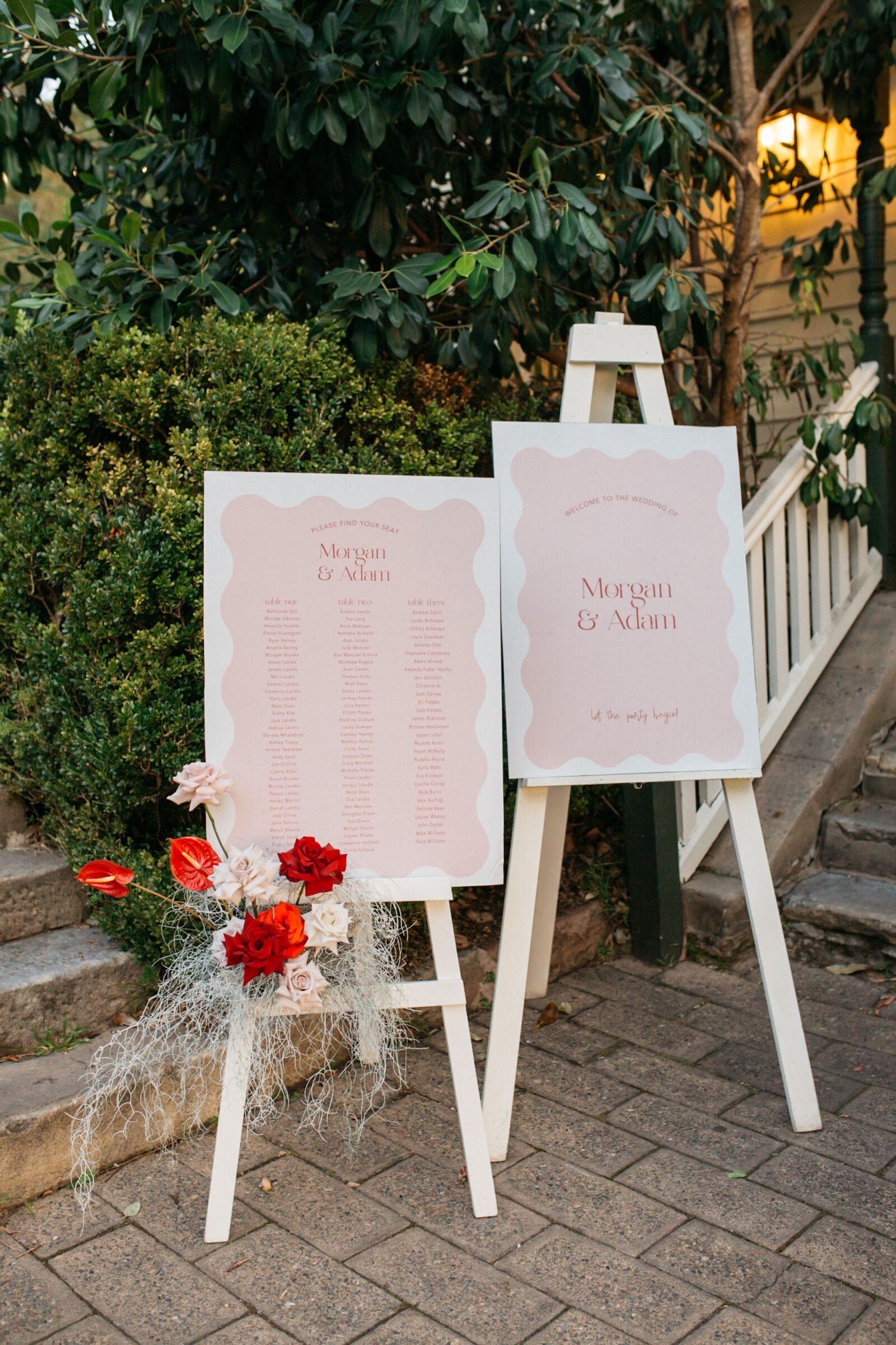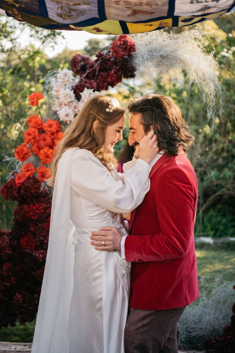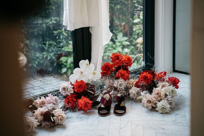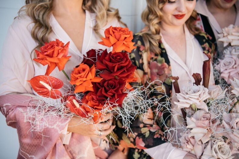 Seriously, how straight-up magic is Morgan and Adam’s big day? The colour palette, the red velvet suit, the styling, the wedding parties… We’re so here for all of it!  “The aesthetic we were going for was a more elegant version of ’70s era glam-rock meets 1930s,” the newlyweds share (um,YES!). “We chose a pink and red colour scheme and wanted guests to feel fabulous and comfortable.”