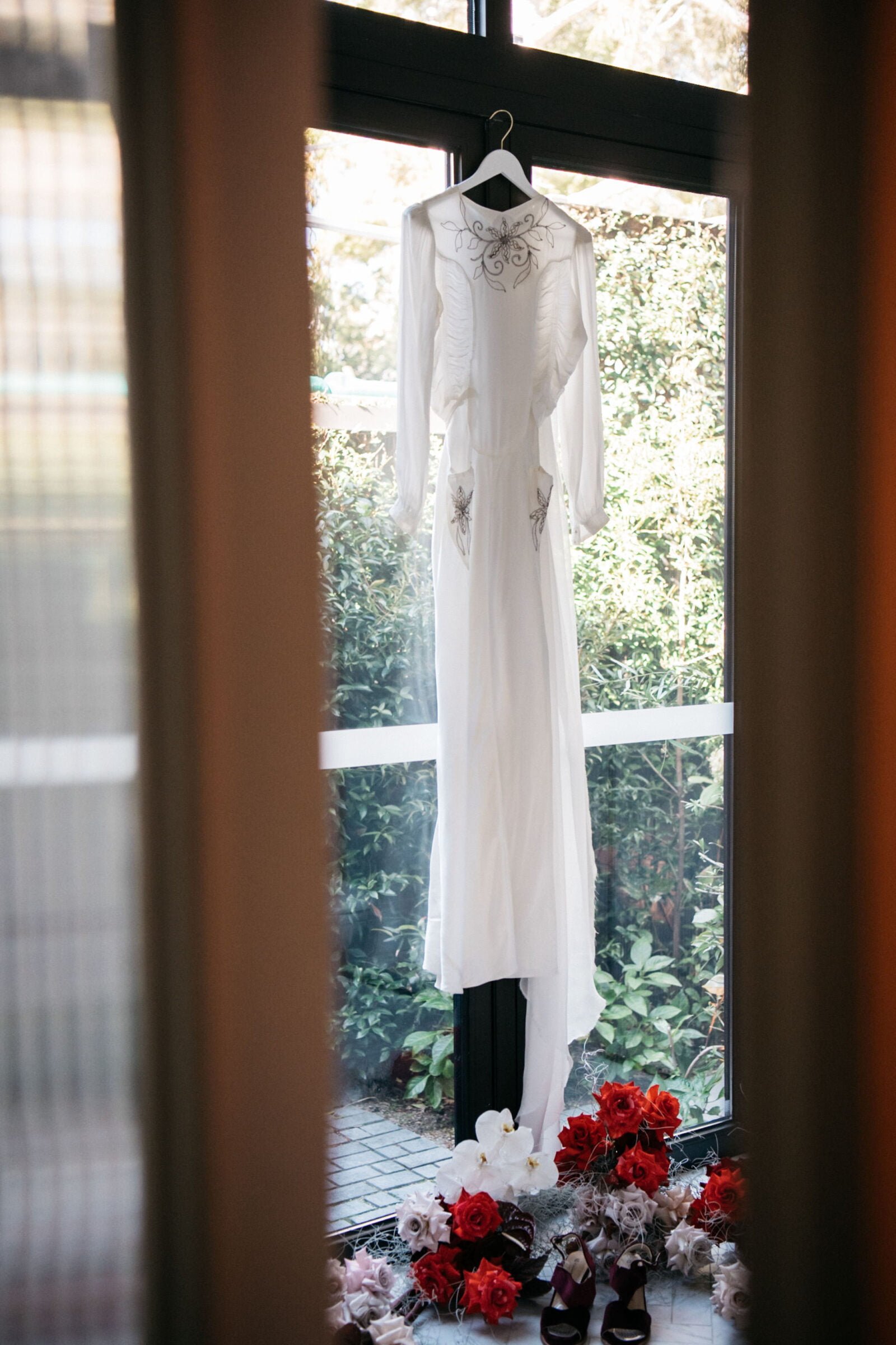 THE DRESS “I knew I wanted something comfortable and not too removed from styles I normal wear. I love the 1930s tailoring so I did a lot of etsy and vintage searches, the dress I found was super affordable and the most amazing shape, it was literally the perfect fit. I just laundered it a bit (in the process I found some of the original confetti from its prior owners wedding). It was fairly easy to find, and the store owner was fantastic with any questions I needed. ”