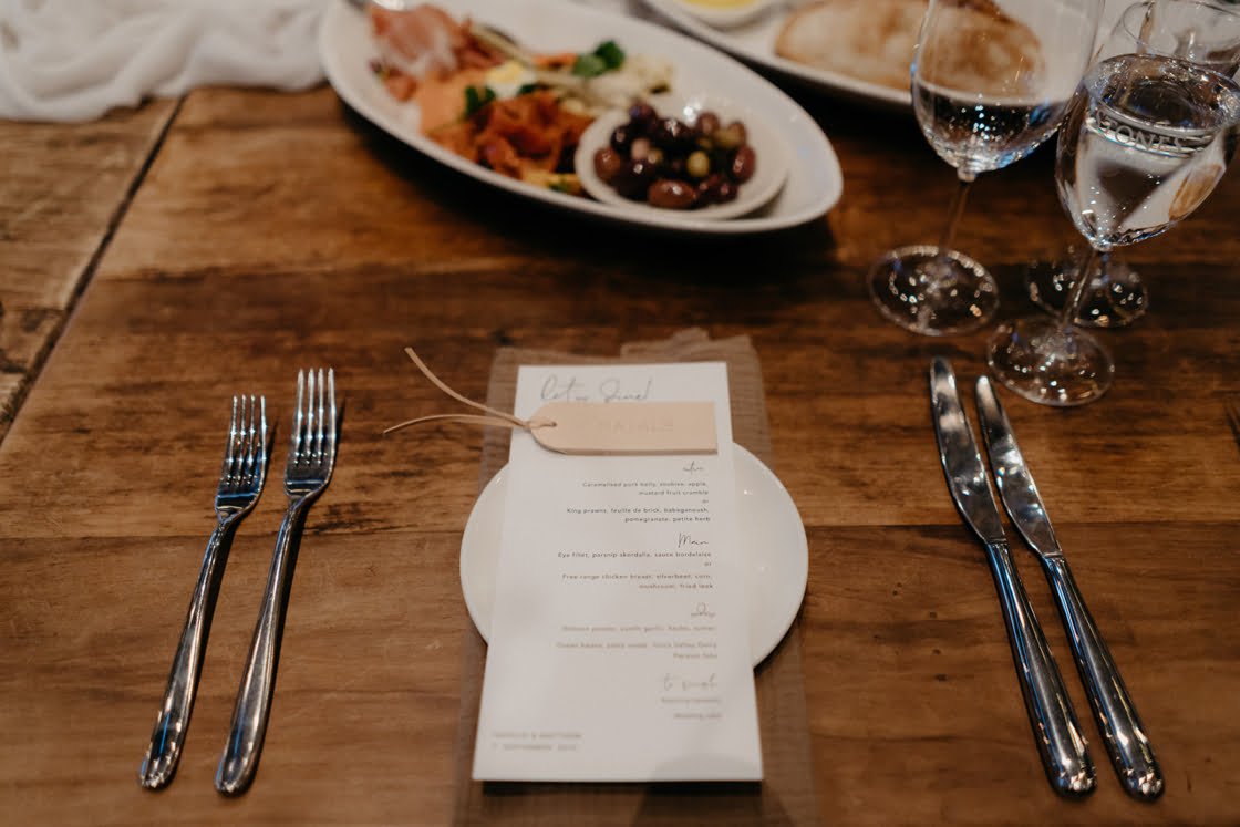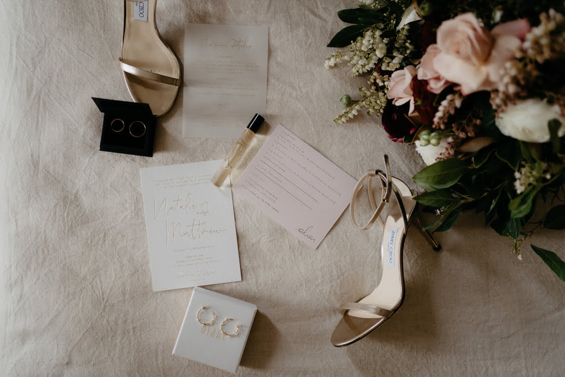 DIY “I am a graphic designer, so I designed my own invitations, food and beverage menus, seating arrangements and table numbers. I really wanted to play with different stocks and materials and knew I wanted gold to be the central theme throughout. With my invitations, I wanted something classic but that still tied in with our theme. I ended up choosing a white cotton paper stock with gold foil press, a printed blush pink with gold foil press and transparent vellum with gold foil press. I designed the whole suite within the first few months of locking down our wedding date. I got the invitations printed through Stitch Press and was super happy with how it all turned out.”