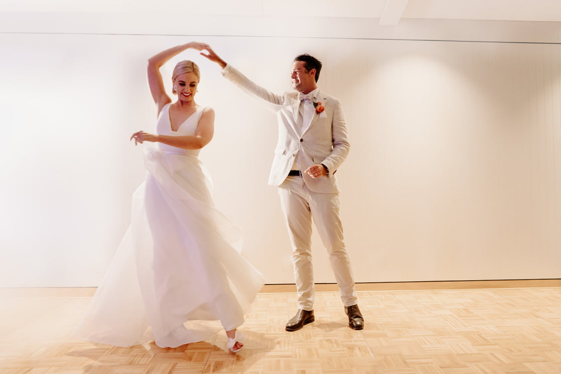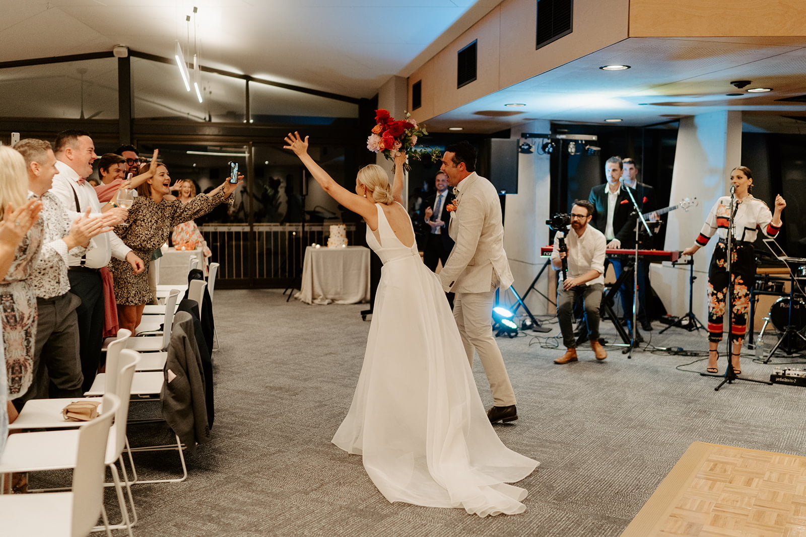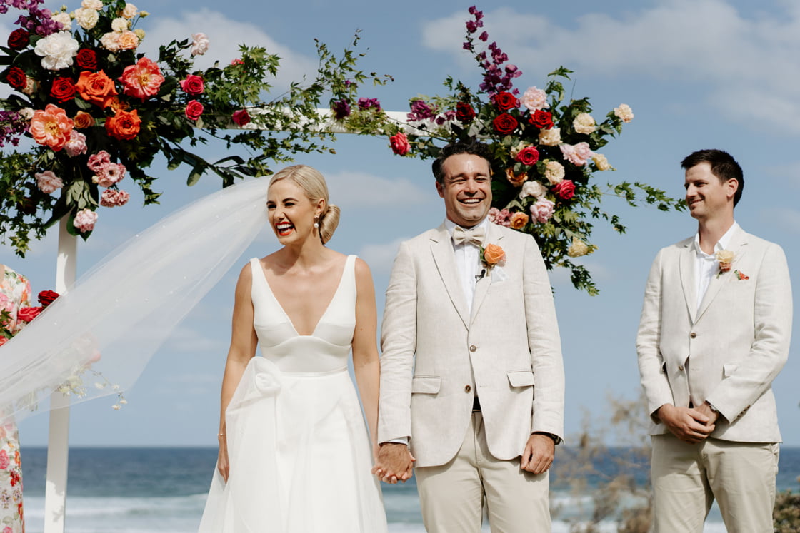 THE VIBE “Coastal and bright was the overall inspiration for our day. Having both grown up on the Sunshine Coast, the Sunshine Beach Surf Life Saving Club was the perfect location for us. Getting married in the year of a global pandemic meant that we planned around 15 different versions of how the day could play out. Lucky for us, the day was relatively unaffected by restrictions but it did mean that a few of our very special guests from interstate and overseas were unable to be there, so we live-streamed the ceremony to family and friends in NSW, Victoria, WA, New Zealand, Hong Kong, France, UK.”