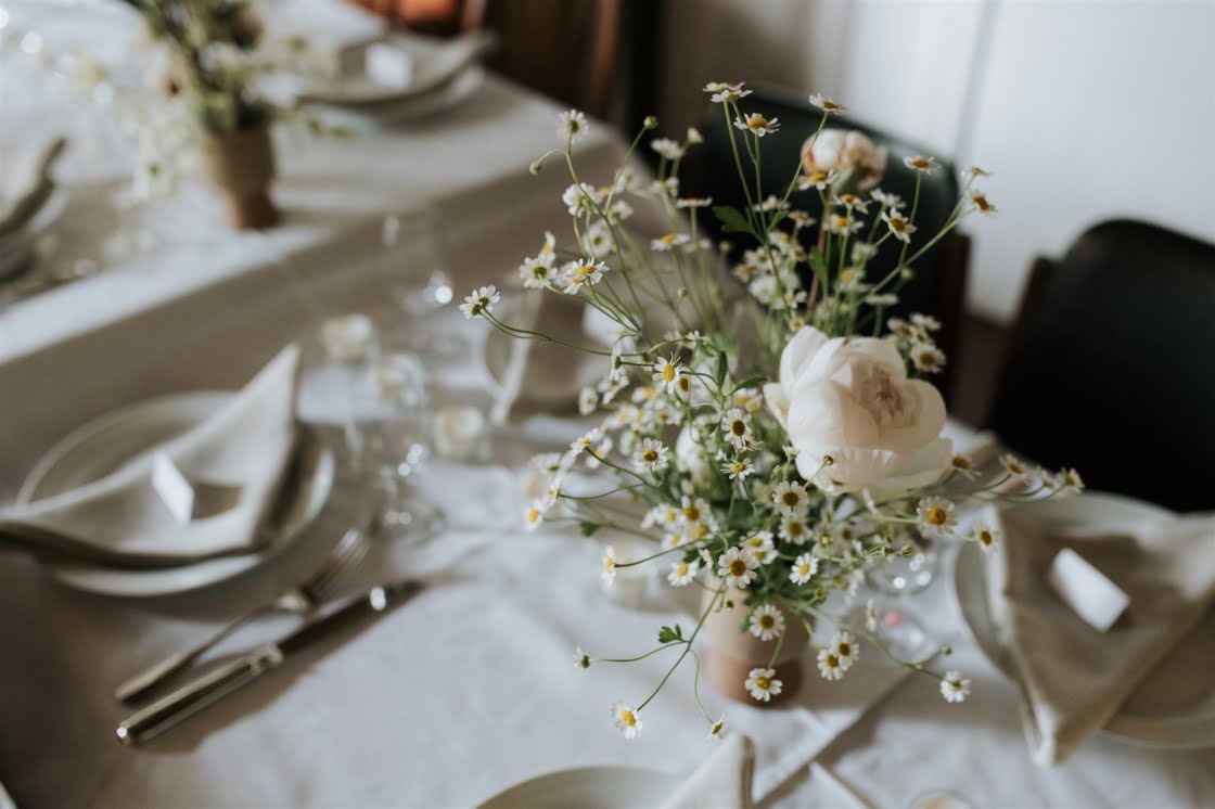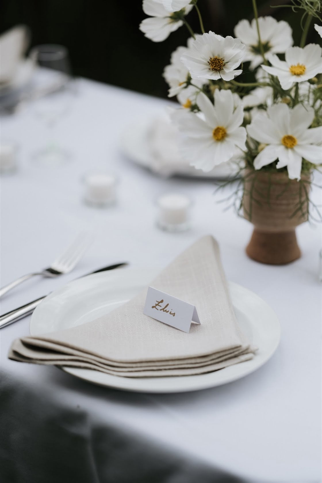 FAVE DETAILS “For me [Nerija], it was the dress and florals. The Lilia Cass Ceremonial dress was beyond perfect and such a dream to wear, it fit like a glove and I loved how it moved in the slightest bit of wind. The flowers were exactly how I envisioned them, the simplest flannel flower and peony bouquet, huge smokebush pillars with moody hydrangeas and delicate lace for the ceremony, and white wildflowers and chamomile for the table. Elvis’ parents had also prepared a video of our childhood photos and recorded messages from family in Lithuania (who couldn’t visit) that was played on a projector. We absolutely loved it.”