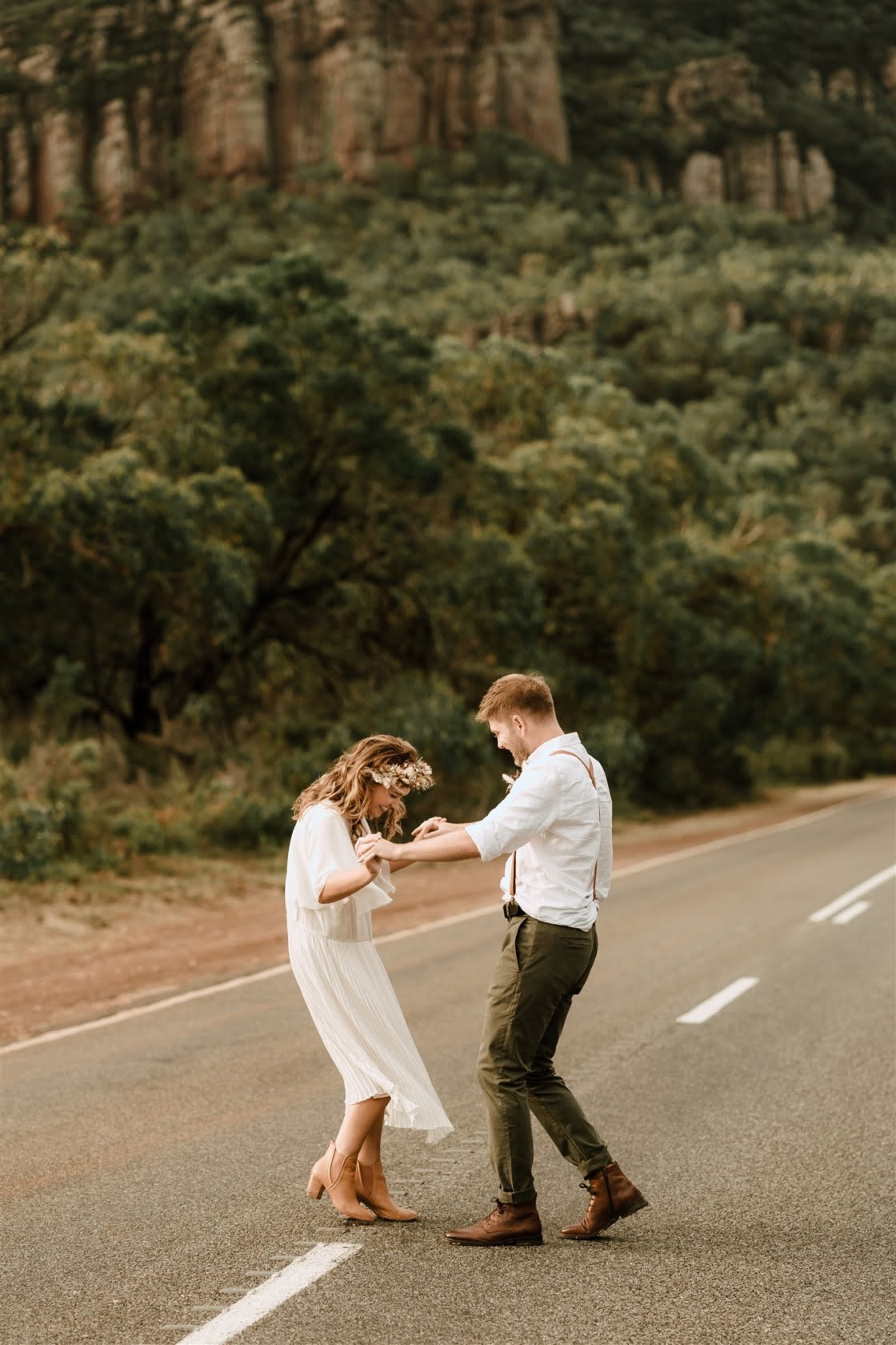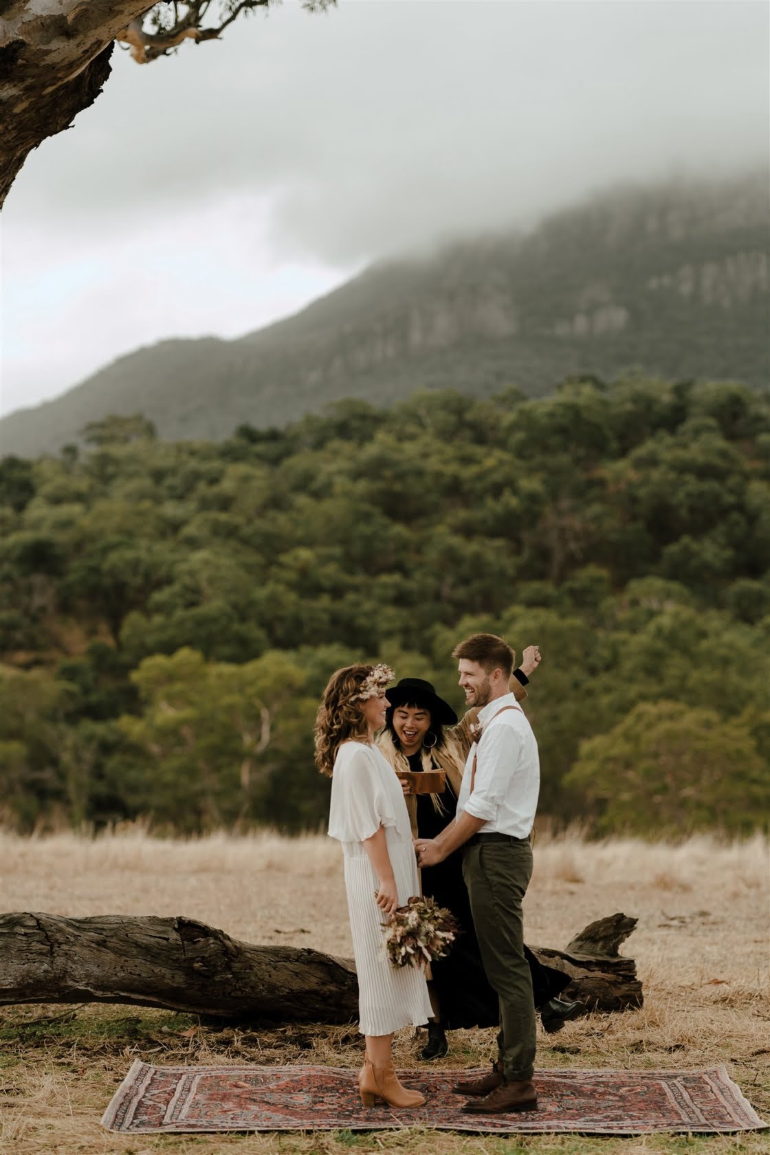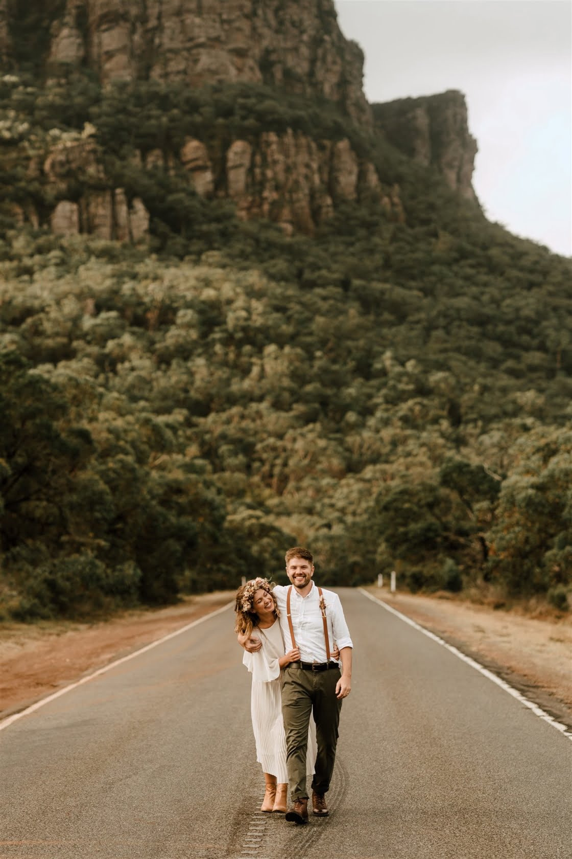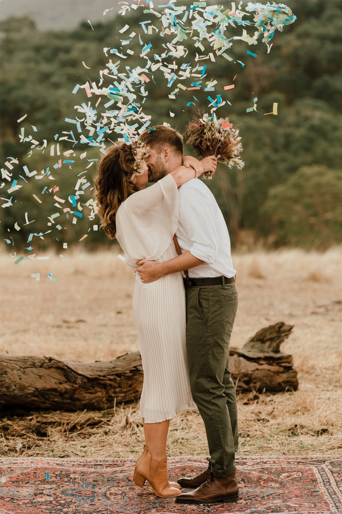 “Eddie made our ‘Just Married’ sign himself with our empty chickpea cans all cleaned out for the occasion,” says the bride. “What a sustainable, handsome man!” Just one of the reasons we love this couple who eloped in this Grampians National Park wedding. “Our boots were full of dirt and confetti by the end of the night – exactly as we wanted.” Jackson Grant Weddings and Moment Seeker Films documented the day and boy are we glad! Scroll down for all the beautiful details and pics galore…