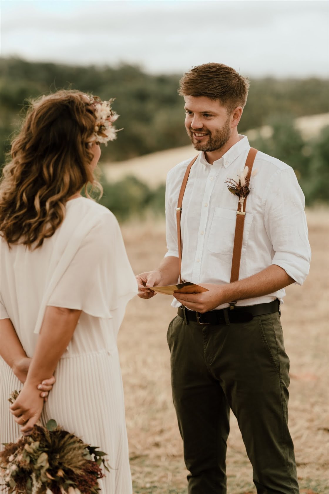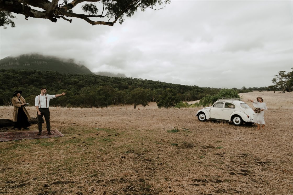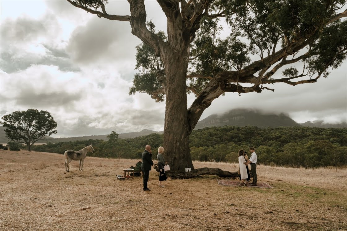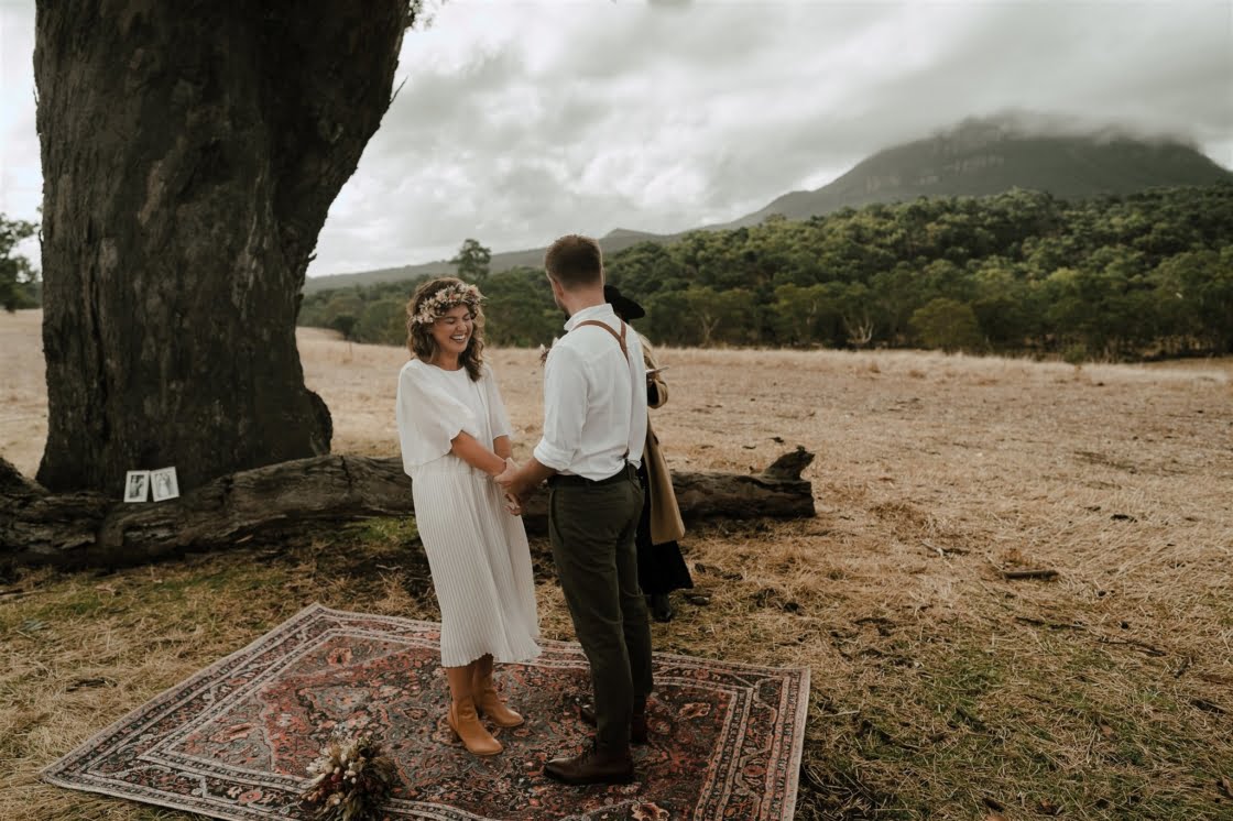 THE VENUE “We knew we wanted to share our vows under a gumtree – and the location to be peaceful and in the heart of nature. Finding a special gumtree to share our vows was an adventure. Creeping around the Grampians for days… Wayne and Jane thought we were sussing the property out for a robbery, only to find out we were just a carefree couple looking for our special spot to get married! They welcomed us in like we were family and drove us around the paddocks on a little tractor to choose our gumtree. It felt like we were meant to meet that day and for us to find this spot in the world to say our I do’s. It was magic.”
