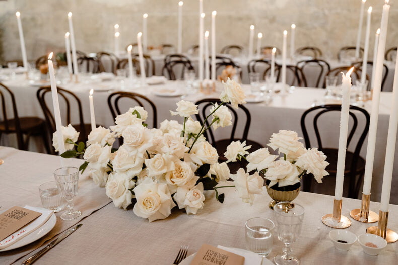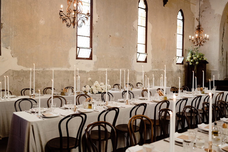 THE INSPO “As an interior designer my day to day revolves around being hyper-focused on all of the big and small details in a space. For our wedding we wanted the complete opposite – a space that we could walk into where the bare bones were so perfect we could turn up on the day with no flowers or styling and it would be breathtaking in its rawest form… that is Churchill. We chose four images we loved and anchored every other selection back to these original images. This really helped us stay on course and not lose focus. Our overall theme centered around a lot of neutrals, texture and a playful but refined use of electric red.”