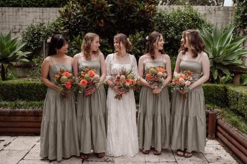 THE INSPO “We just wanted it to be a really light and fun day. We took the backdrop of Audley as our inspiration and went from there. Sage green for the bridesmaids dresses and lots of natives for our flowers.”
