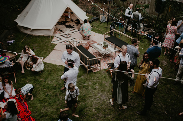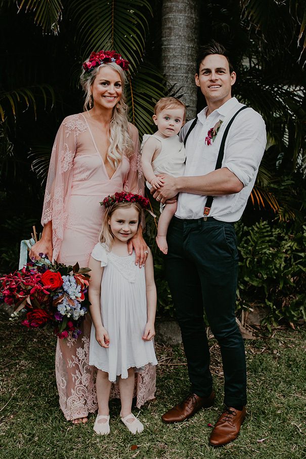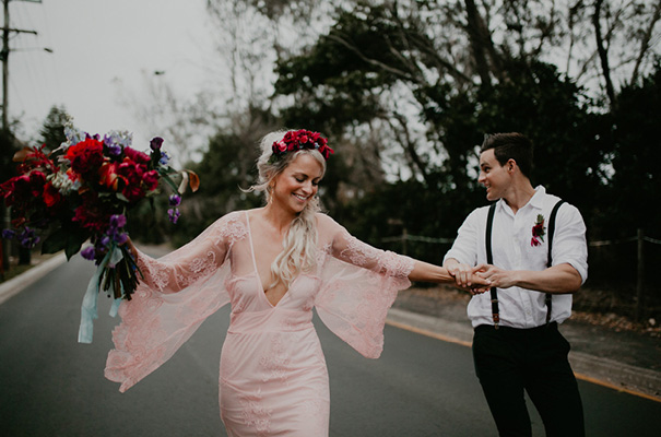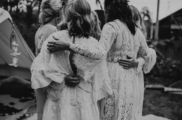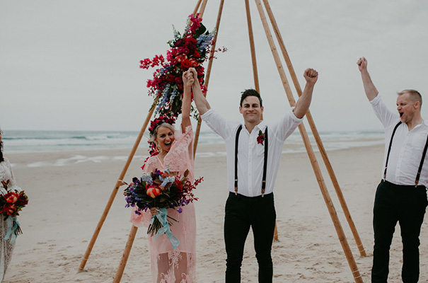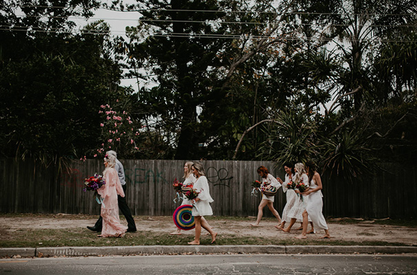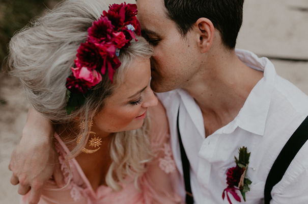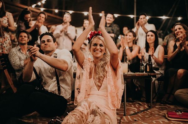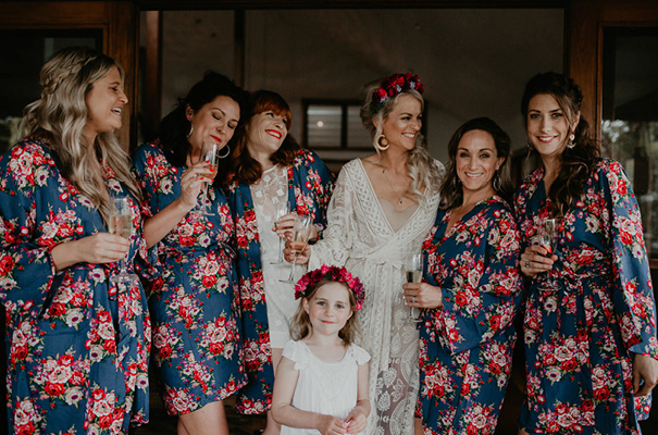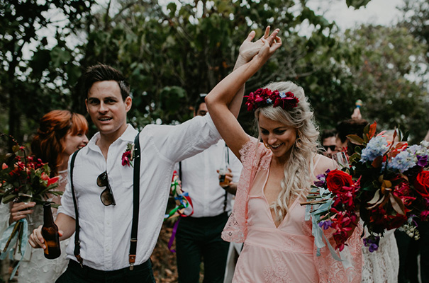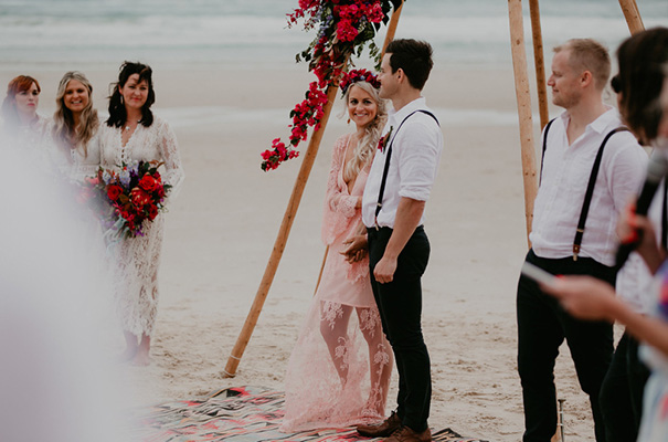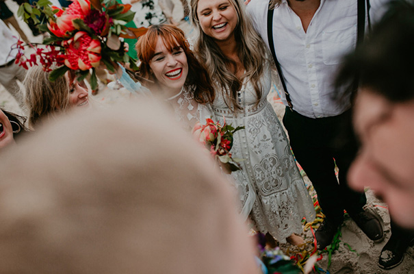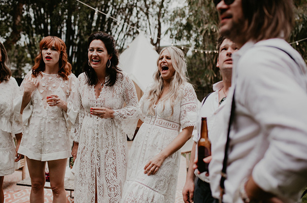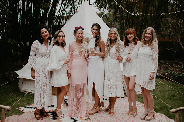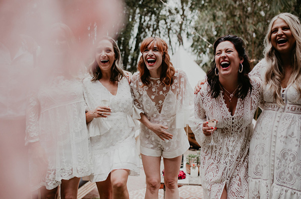 “Our vision was for a super vibrant, playful, bohemian love-fest festival party!! Something super intimate and joyful, with only our very nearest and dearest to celebrate love and family in a fun and relaxed way,” said the bride, who rocked a gorgeous pink Jen’s Pirate Booty gown, whilst her ‘maids wore some rather gorgeous white and cream Spell & The Gypsy Collective and Alice McCall frocks.