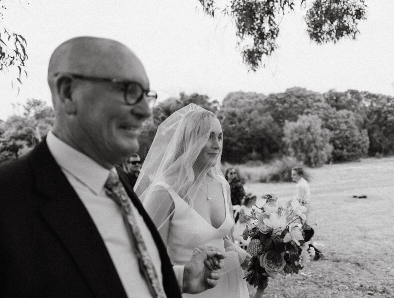 Engaged on their 11-year anniversary, Sarah and James’ Margaret River wedding was inspired by an intimate garden party, “where the overall vibe was one of warmth and connection,” says the bride. “Emma MacAulay, our photographer, said it best when she said ‘the small, intimate wedding that just felt like a big hug’.” LOVE it! The couple not only had the good sense to enlist the wonderful Emma for their day of days, but they also killed it in the fashion stakes. Sarah rocked the Karen Willis Holmes Shelby gown, while James opted for a green Theodore suit, with a bow tie from our pals at Peggy and Finn. Twas’ a magic celebration all round, scroll on down to see for yourself…