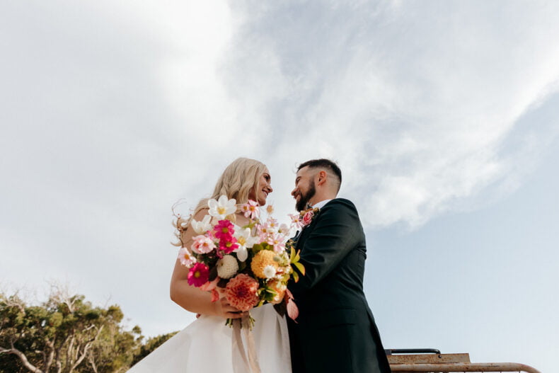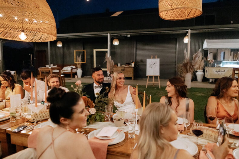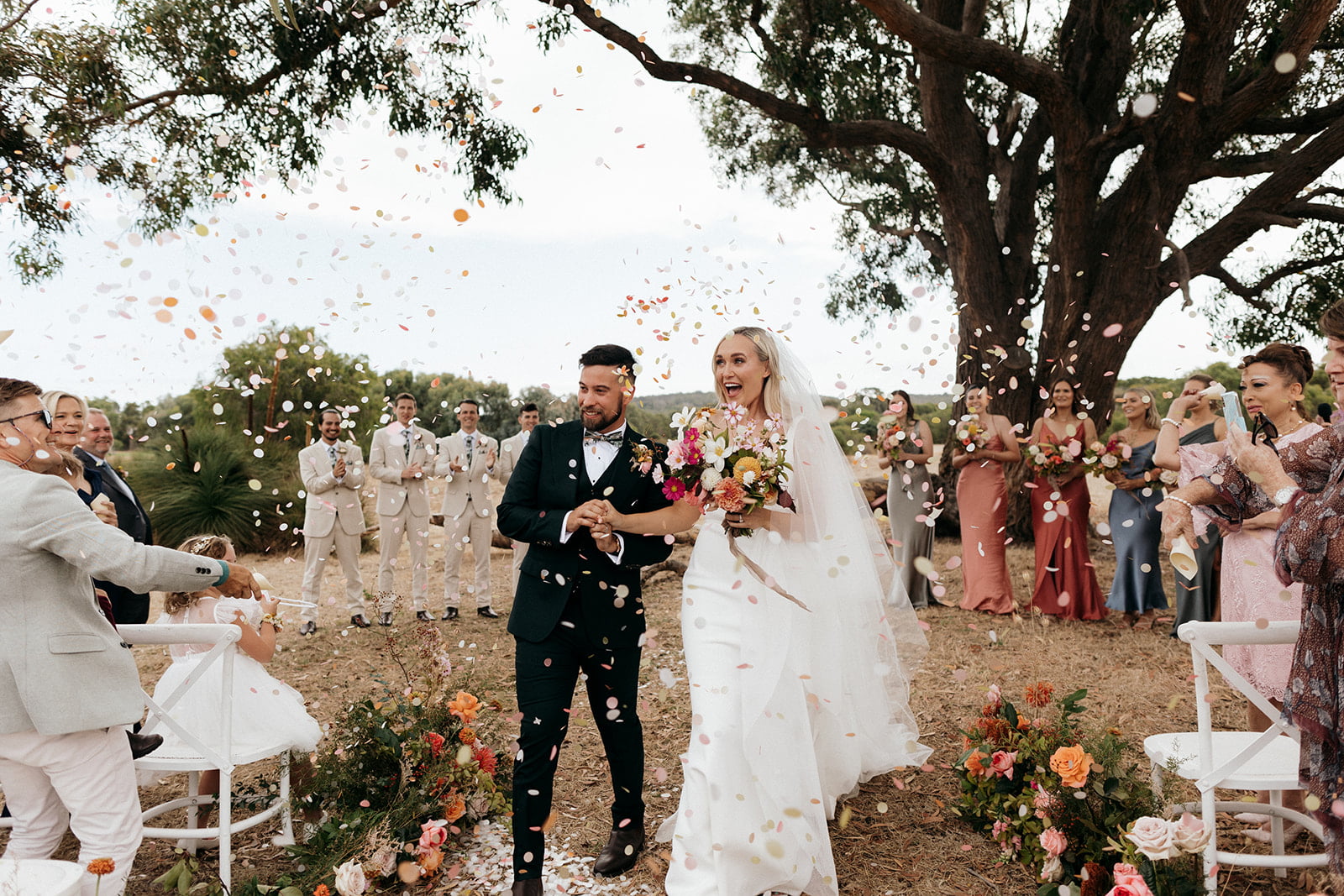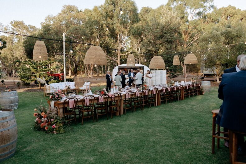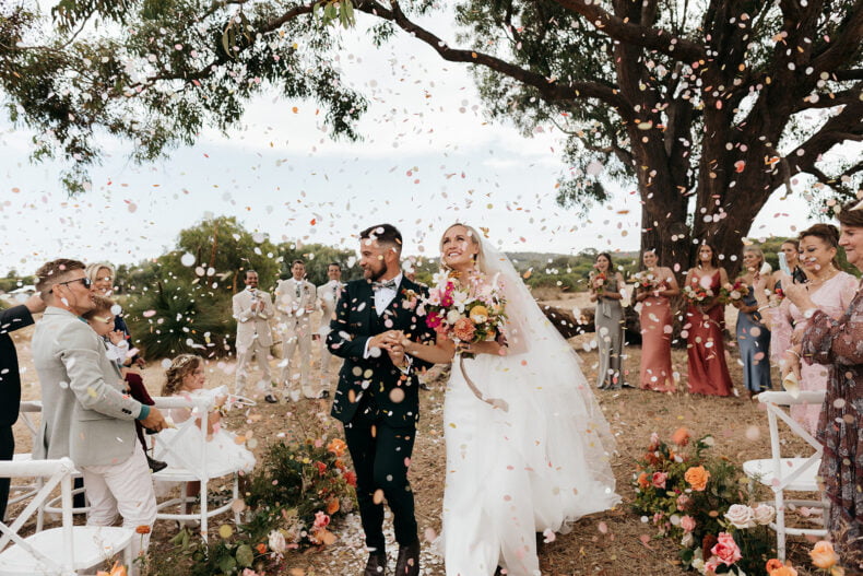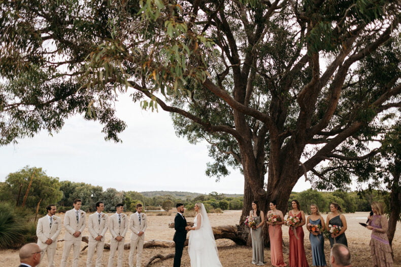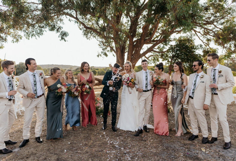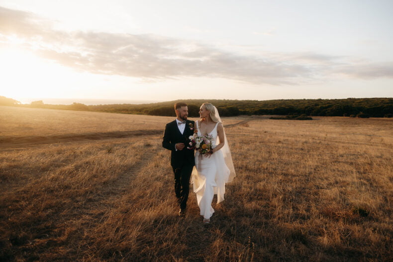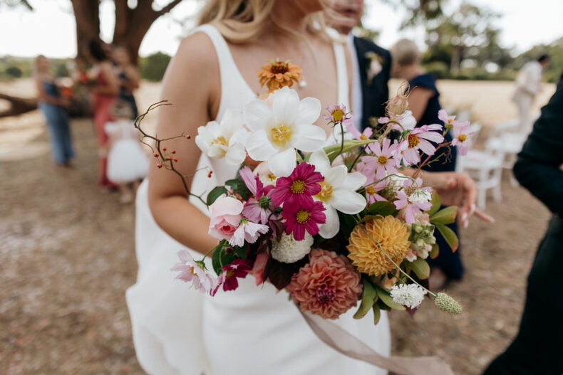 Engaged on their 11-year anniversary, Sarah and James’ Margaret River wedding was inspired by an intimate garden party, “where the overall vibe was one of warmth and connection,” says the bride. “Emma MacAulay, our photographer, said it best when she said ‘the small, intimate wedding that just felt like a big hug’.” LOVE it! The couple not only had the good sense to enlist the wonderful Emma for their day of days, but they also killed it in the fashion stakes. Sarah rocked the Karen Willis Holmes Shelby gown, while James opted for a green Theodore suit, with a bow tie from our pals at Peggy and Finn. Twas’ a magic celebration all round, scroll on down to see for yourself…