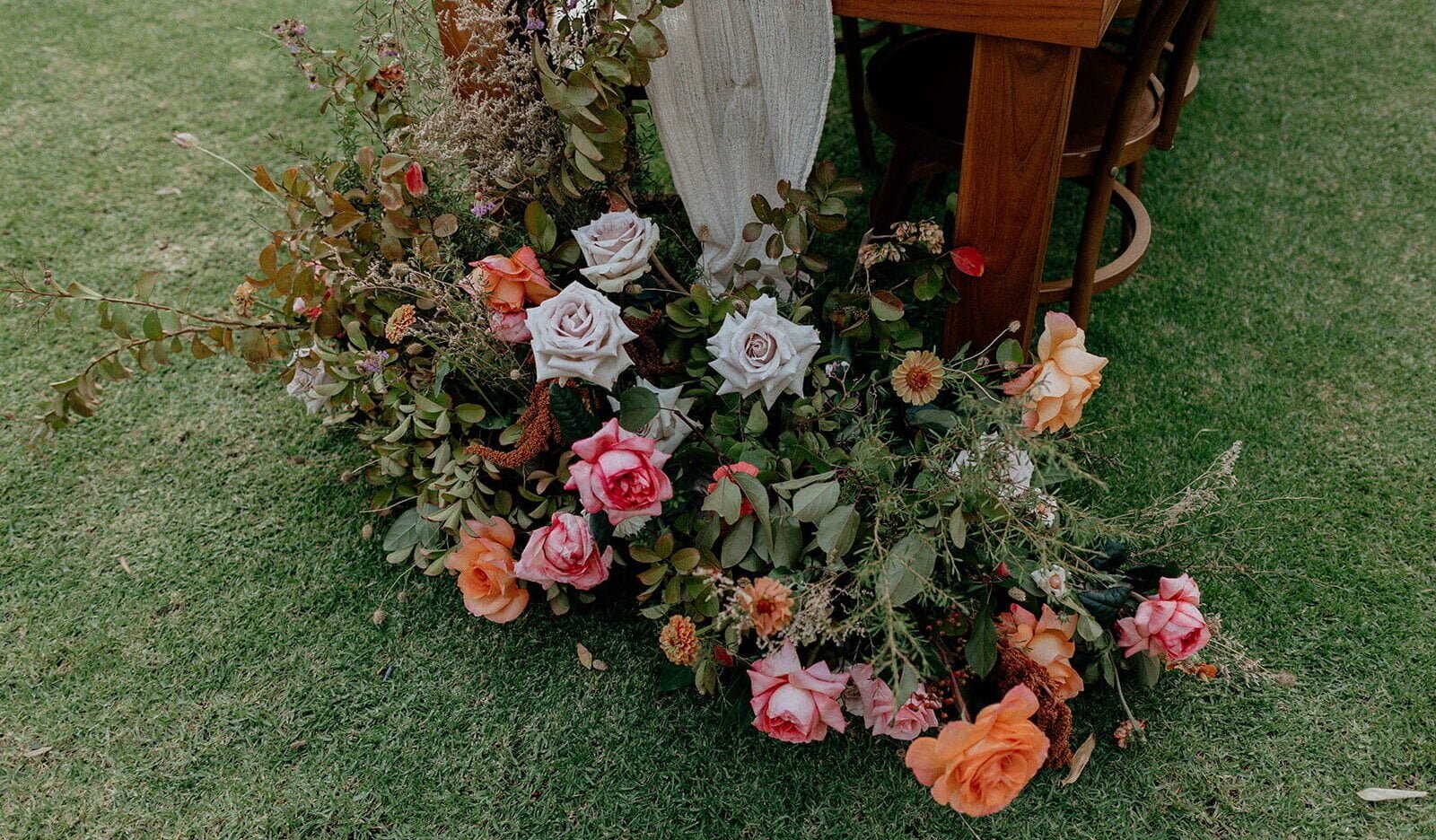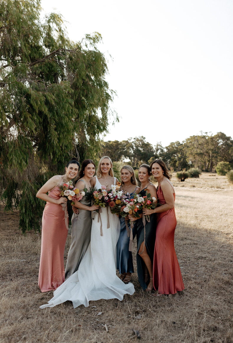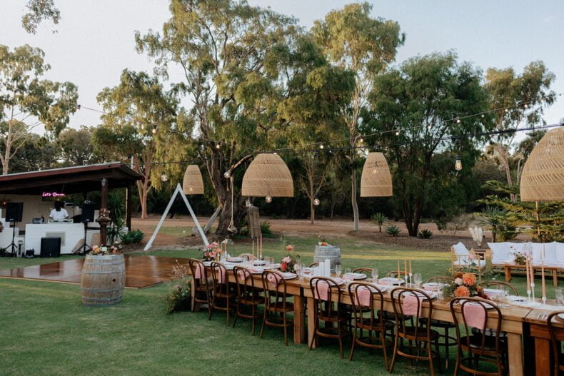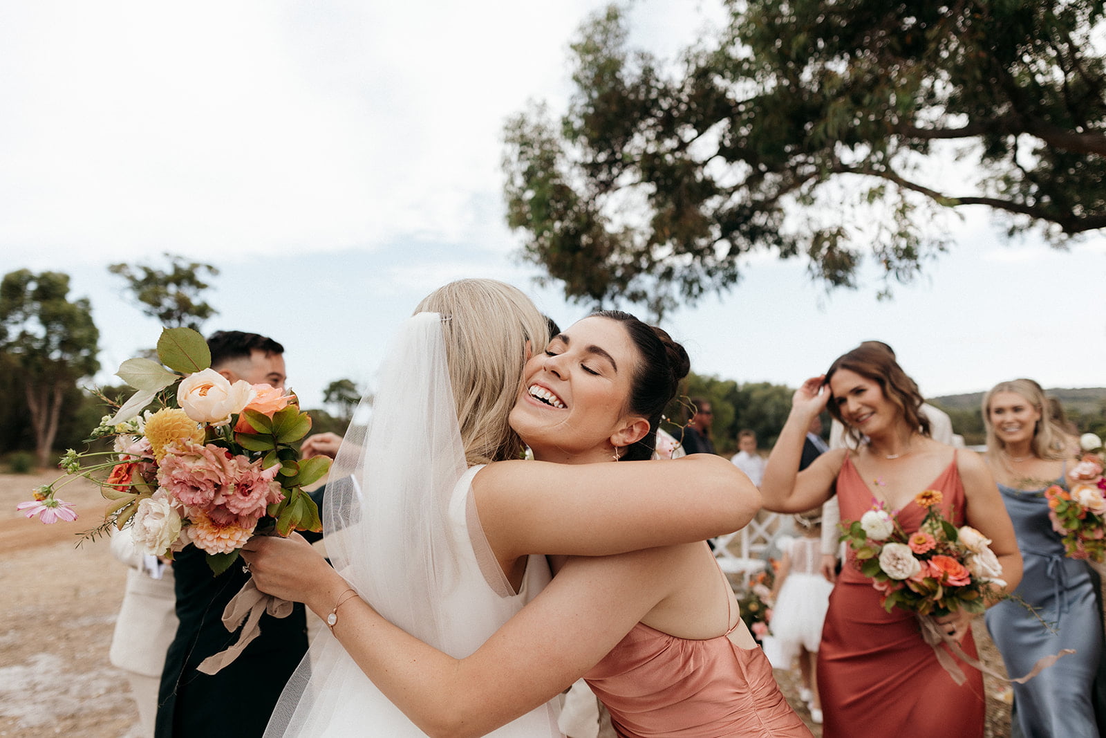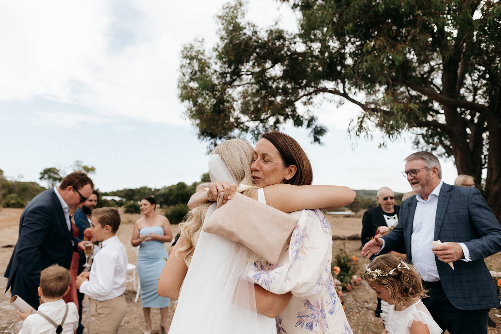 Engaged on their 11-year anniversary, Sarah and James’ Margaret River wedding was inspired by an intimate garden party, “where the overall vibe was one of warmth and connection,” says the bride. “Emma MacAulay, our photographer, said it best when she said ‘the small, intimate wedding that just felt like a big hug’.” LOVE it! The couple not only had the good sense to enlist the wonderful Emma for their day of days, but they also killed it in the fashion stakes. Sarah rocked the Karen Willis Holmes Shelby gown, while James opted for a green Theodore suit, with a bow tie from our pals at Peggy and Finn. Twas’ a magic celebration all round, scroll on down to see for yourself…