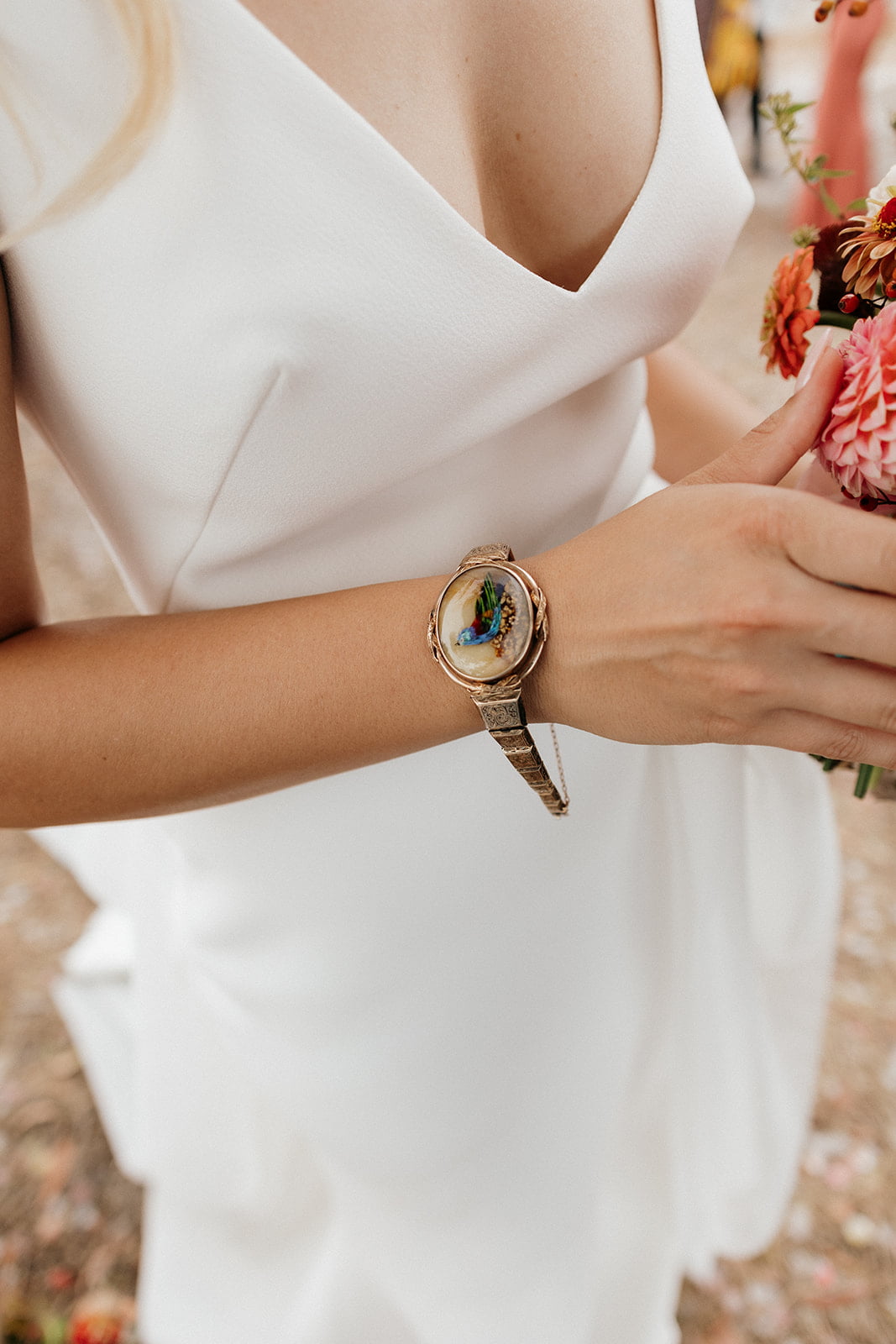THE DRESS “Armed with a Pinterest board full of ideas, I ventured out with my mum, thinking a simple slip dress might be my ideal choice. As it turned out, that idea didn’t resonate with me at all, and I had a mini style crisis. But after a comforting pit stop for falafels, we found ourselves at Karen Willis Holmes for an appointment. There, we were warmly greeted by Victoria, who quickly got up to speed with my wedding vision. Instead of pressuring me, she encouraged me to have some fun and try on a few random styles. And then, it happened. Victoria disappeared into the back and reappeared with Shelby in tow. It was the dress. They weren’t kidding when they said you’d know when you found ‘the one’. Shelby was elegant and timeless, and to add a touch of flair, we decided on a mesh skirt overlay that perfectly matched our aesthetic. It was a surreal experience, one that transformed a day I had been dreading into an unforgettable highlight that I’ll cherish forever.”