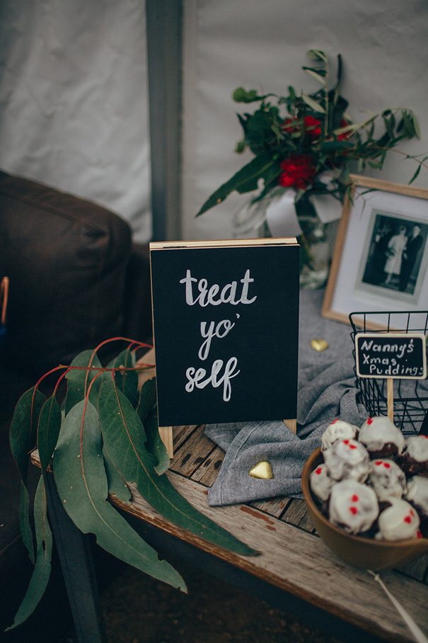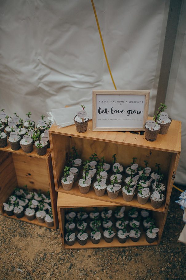 SJ designed the entire wedding stationary, including the invitations, prints, signs, menus and stubby holders, whilst Alex set to work on the timber signs and glass wishing well. The pair enlisted the help of SJ’s mum, who planted each and every one of the wedding favour succulents, not to mention whipped up some rather delicious looking desserts.