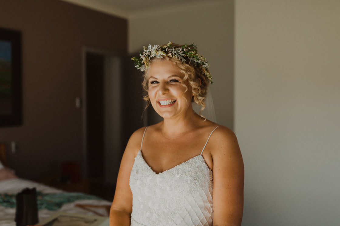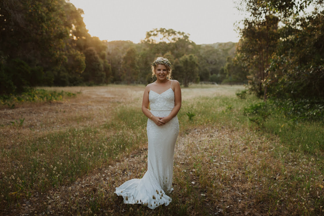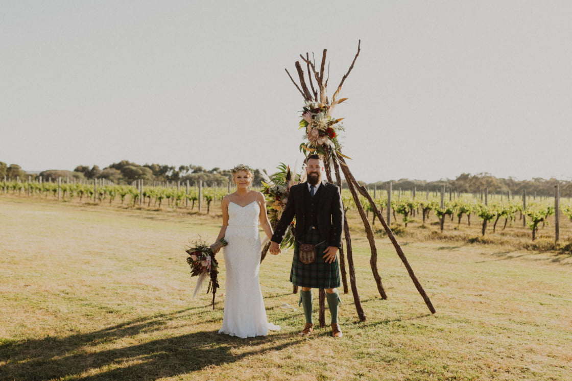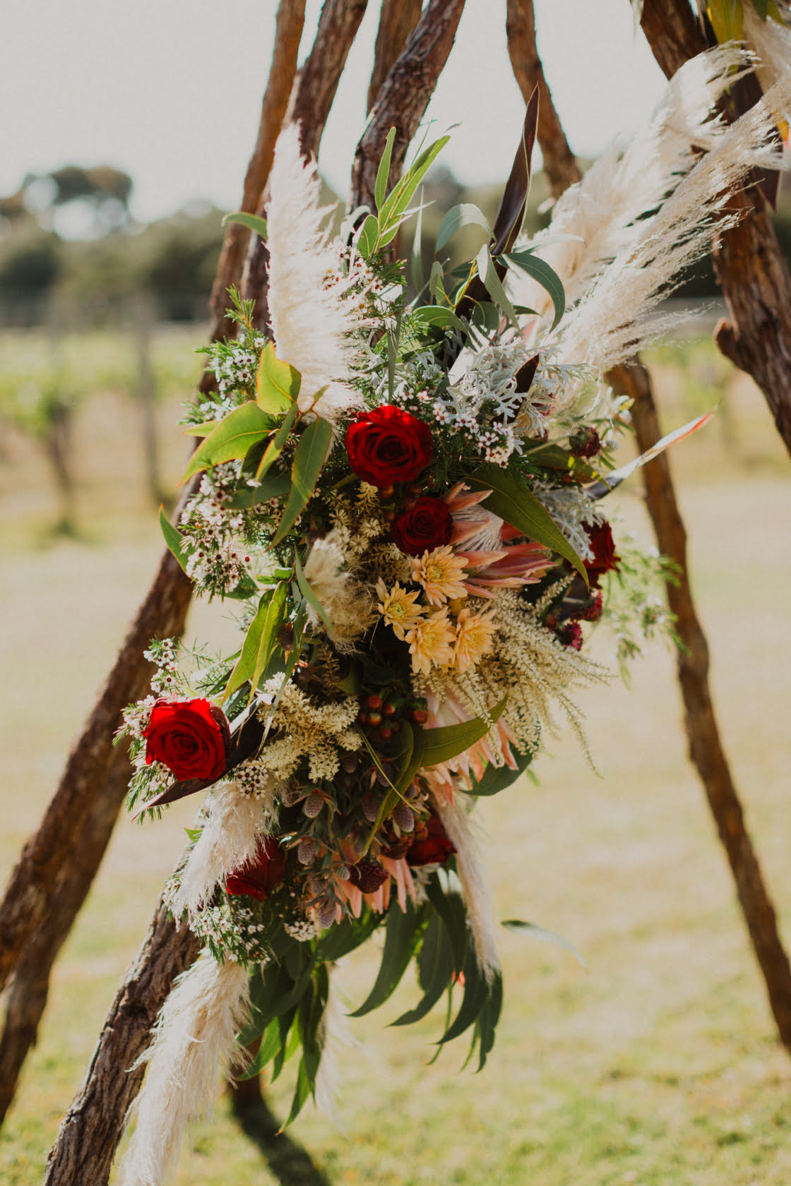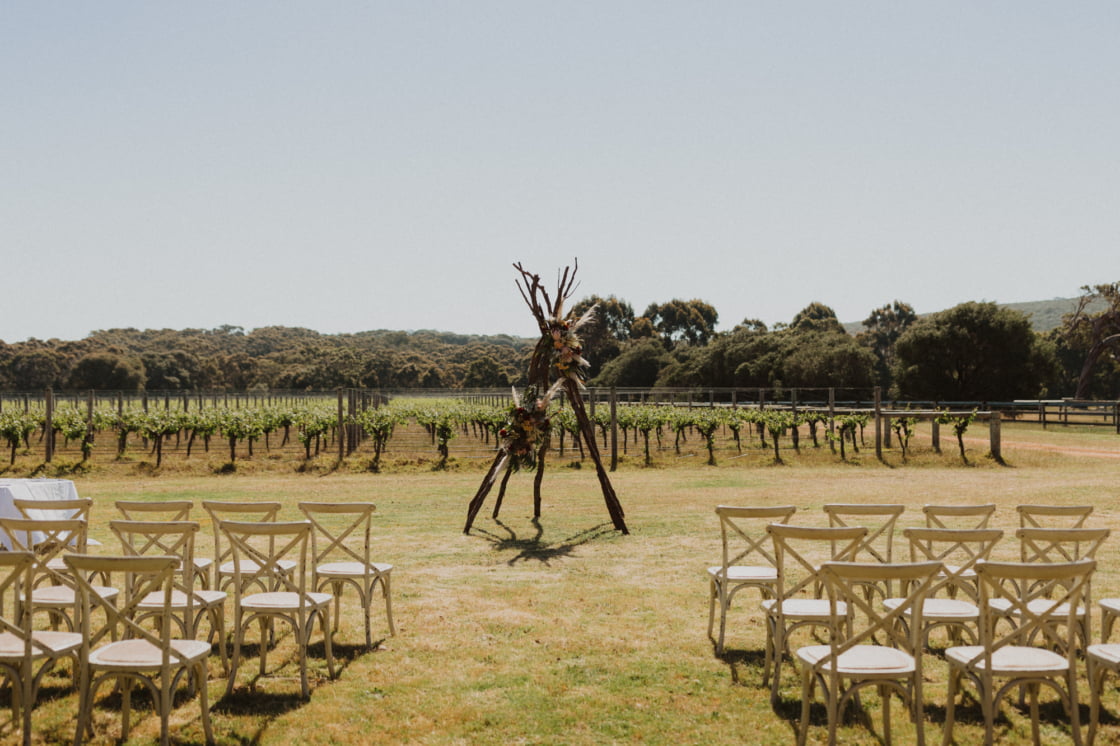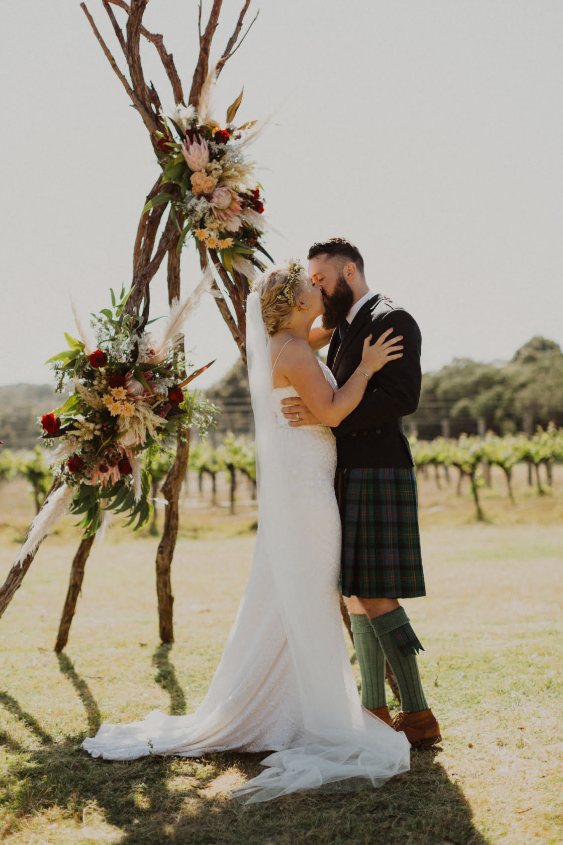 FAVOURITE DETAILS “We got really lucky with the weather as there were storms the weekend before, however, Margaret River really put on a show. The ceremony was outside backed by vines and our homemade tepee arbour adorned with Australian natives.”