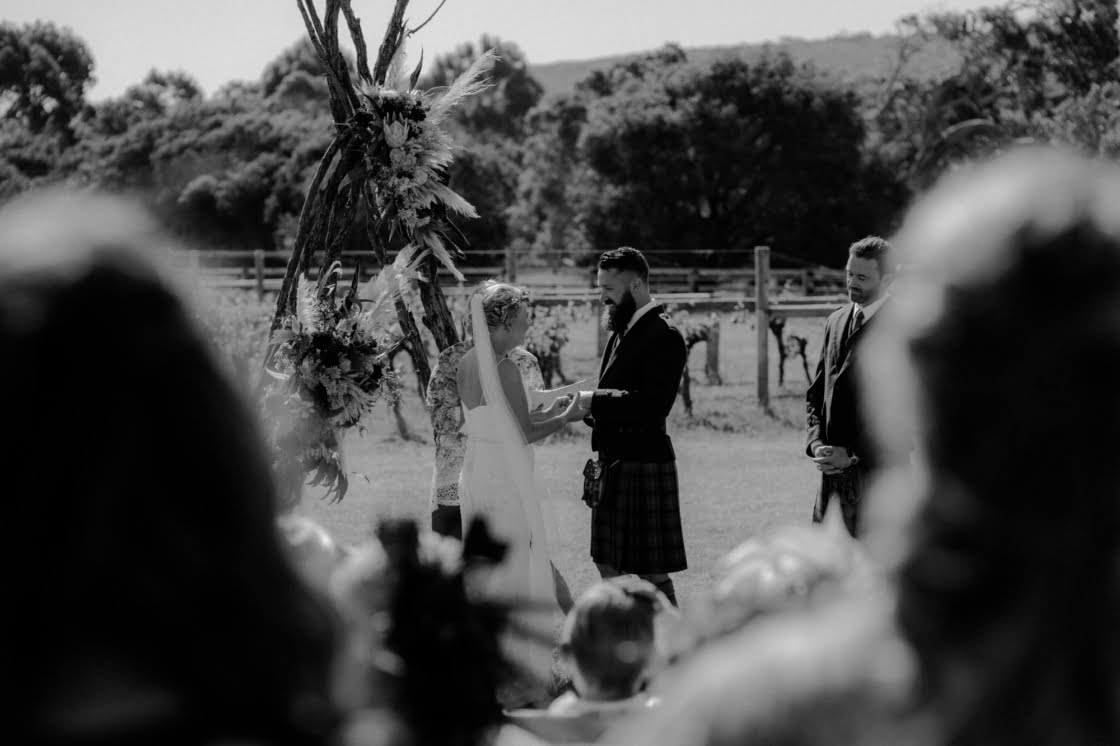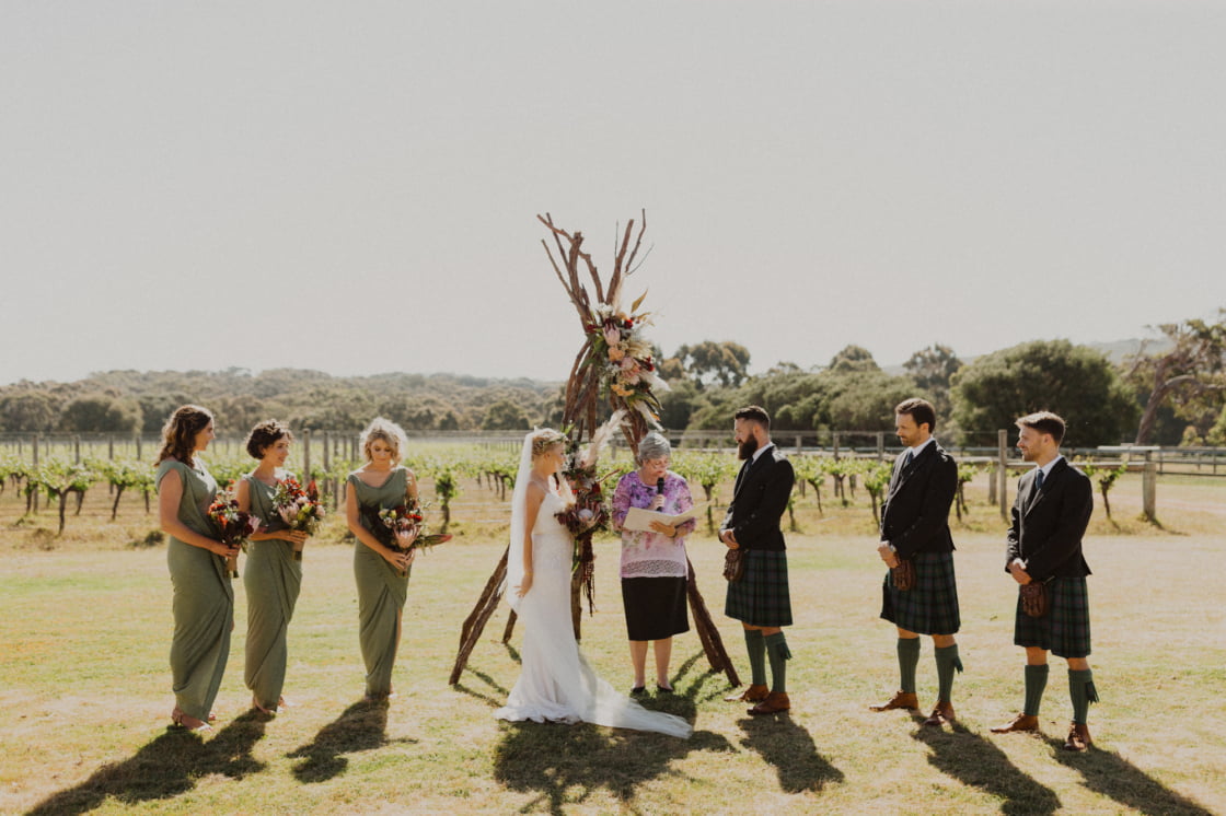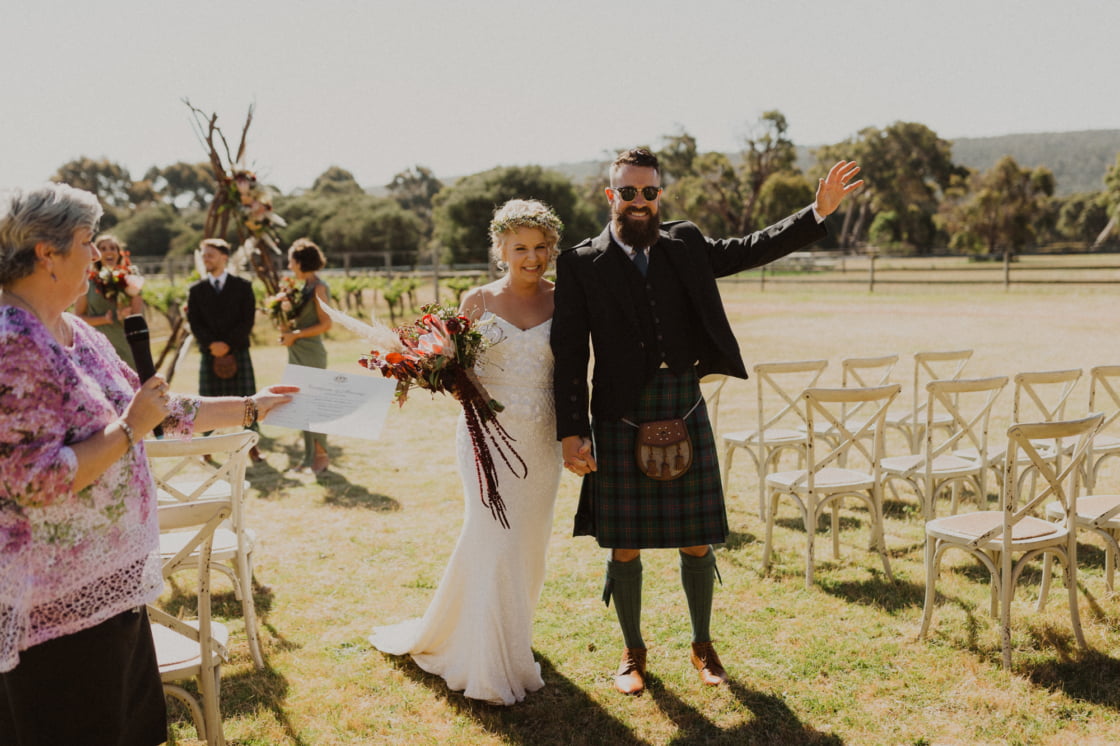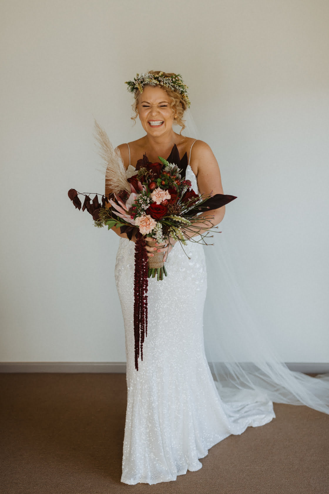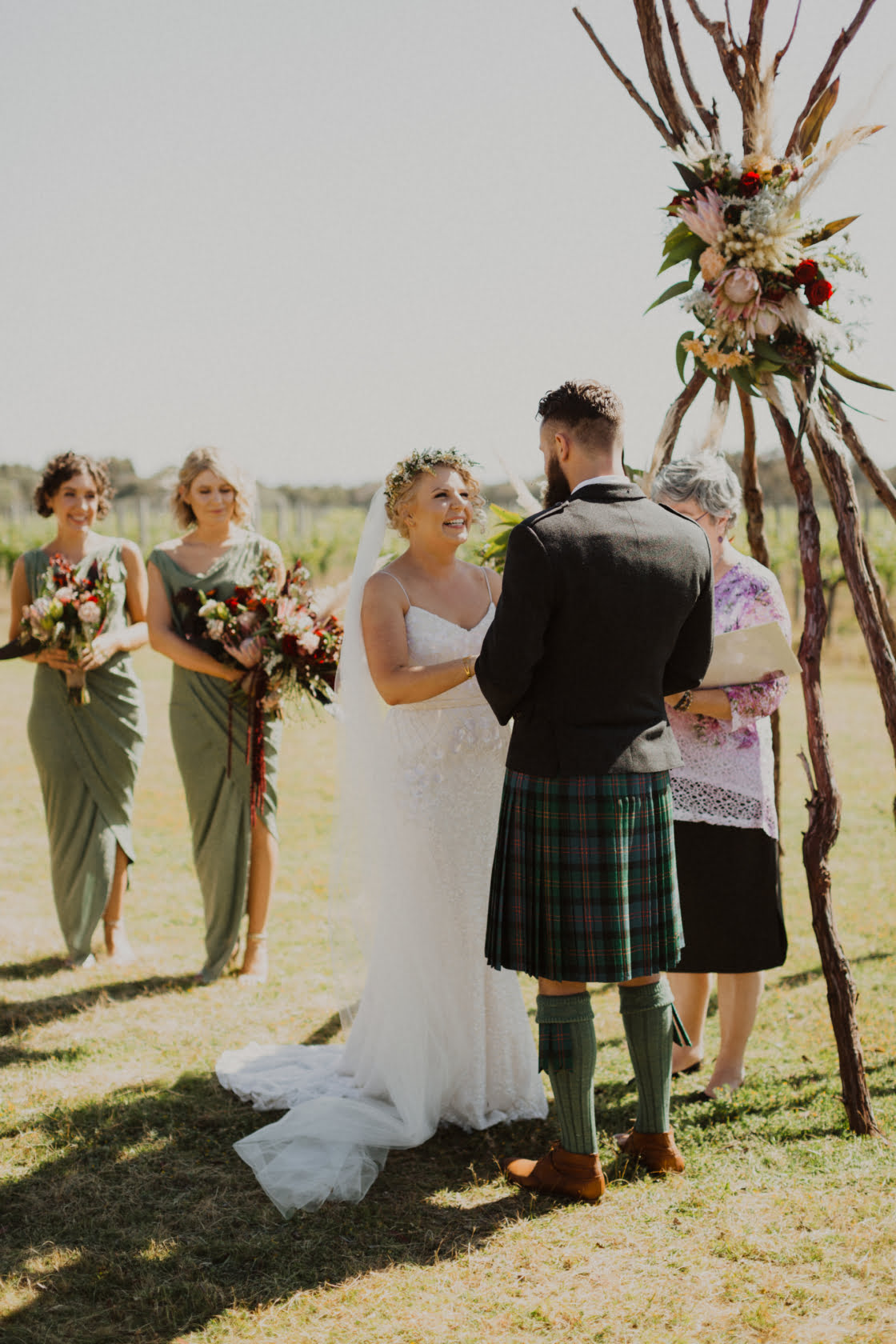 FAVOURITE DETAILS “We got really lucky with the weather as there were storms the weekend before, however, Margaret River really put on a show. The ceremony was outside backed by vines and our homemade tepee arbour adorned with Australian natives.”