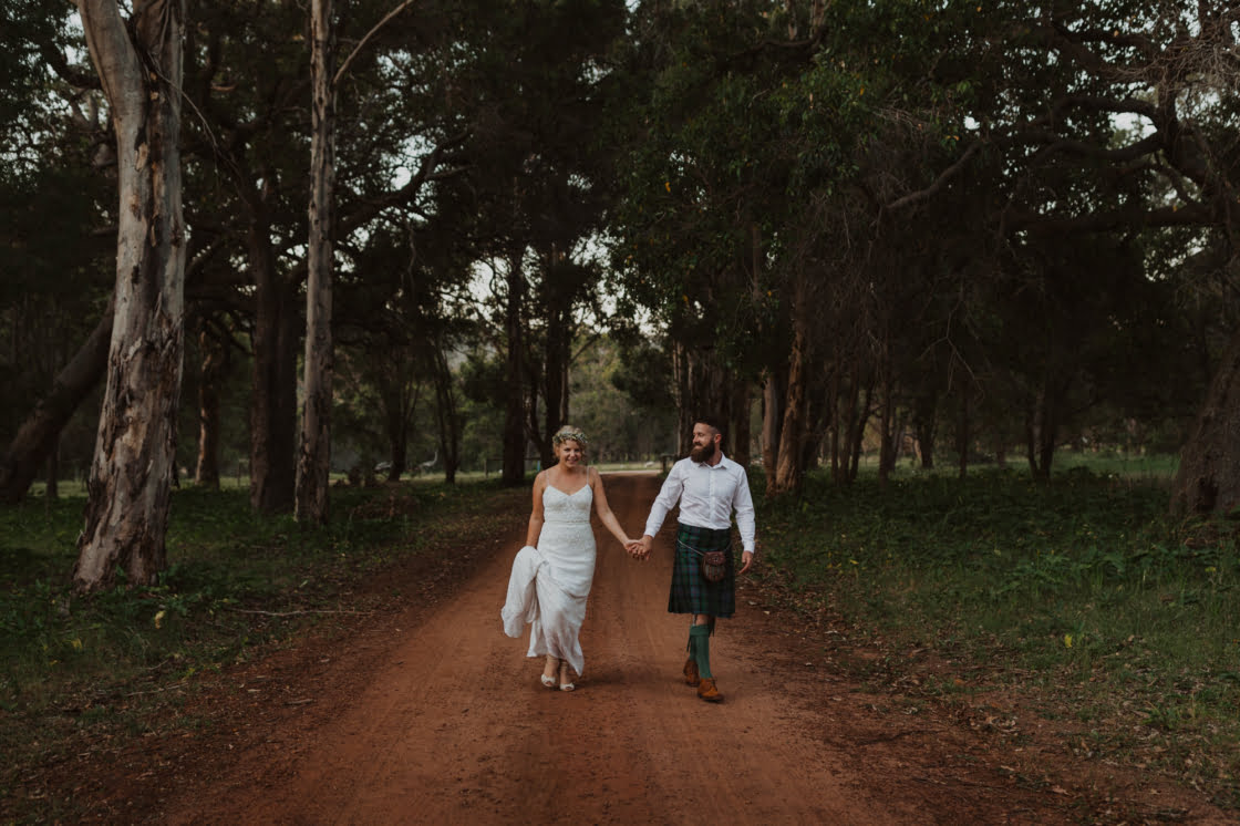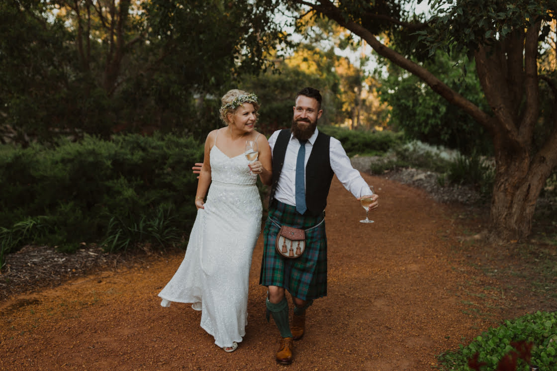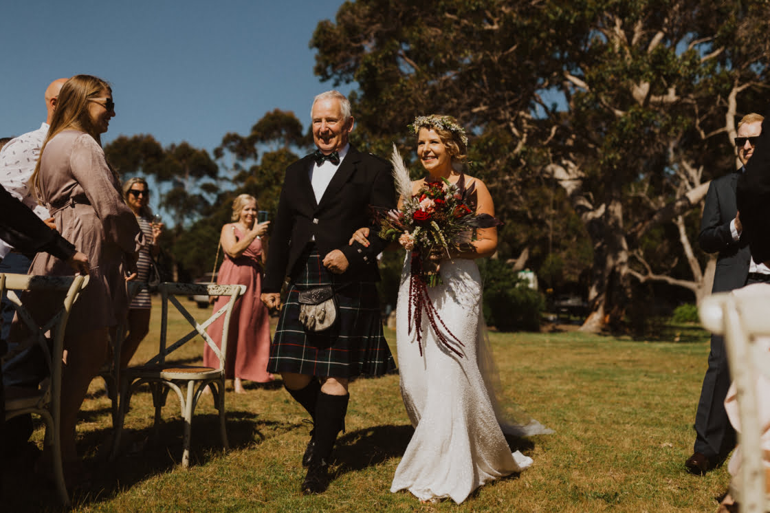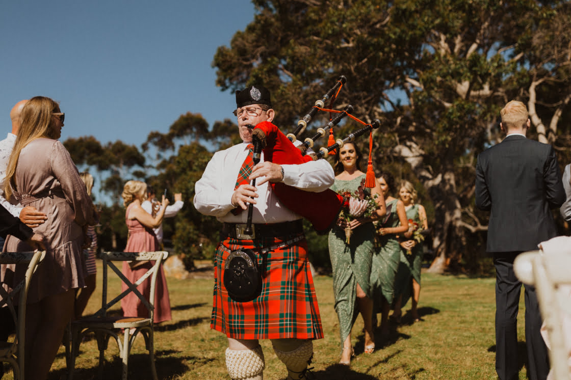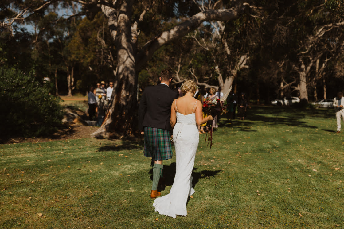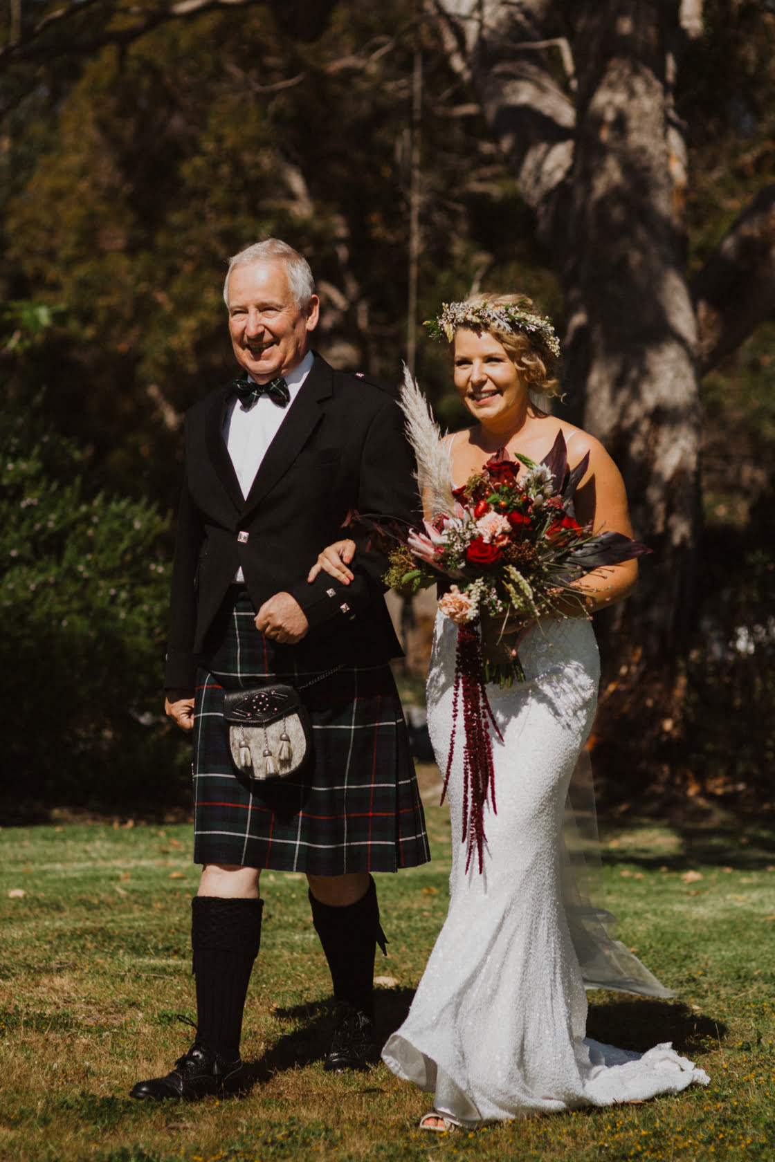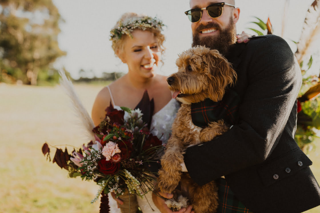 When Sarah and Sam decided to tie the knot they knew that incorporating their Scottish heritage throughout was a must. Think bagpipes, kilts and one very handsome cavoodle (complete with tartan cravat). Monty, the couple’s doggo, even underwent successful graded exposure training to bagpipes, not barking once throughout the ceremony. What a legend! Scroll down for some pretty freaking fabulous golden hour portraits, a bride decked out in Karen Willis Holmes and the cake to rule all cakes. Paris Hawken’s snaps are something spesh…