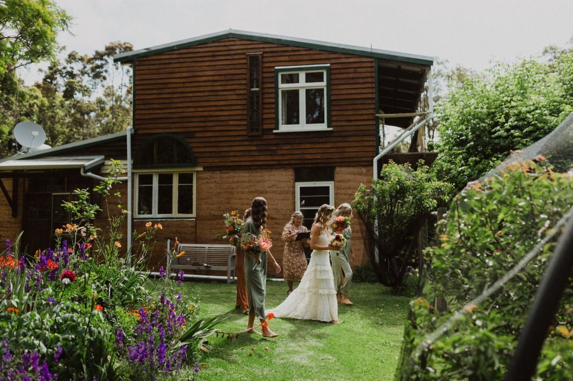 FAVE DETAILS “The whole day was amazing. Our bridal party organised super fun Hens and Bucks days (surf comps/ horse riding/ games etc) which made us both feel so loved up and excited about the wedding day. Kimbo’s sister and mum whipped up amazing handmade wedding invites. We found the flowers and desserts from wandering around the local Farmers Markets. Kirk’s Kitchen made his famous fish tacos and even spoiled some of the kids and my aunty to hot chips which wasn’t even on the menu, what a champ! The wedding cake was heaven, La Dolce Vita Catering went to school with Kimbo and her grazing table and GF cakes were just so delicious! Music and Videographers, the celebrant… A real standout for me was that it was a real honour going into my mum’s beautiful garden with a pair of secateurs and being told we could pick whatever we liked for my bouquet and flower crown. Mum worked hard in the garden and it paid off, it was just a delight hanging out in it in the morning of the wedding.”