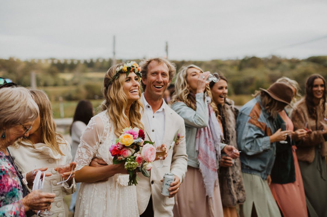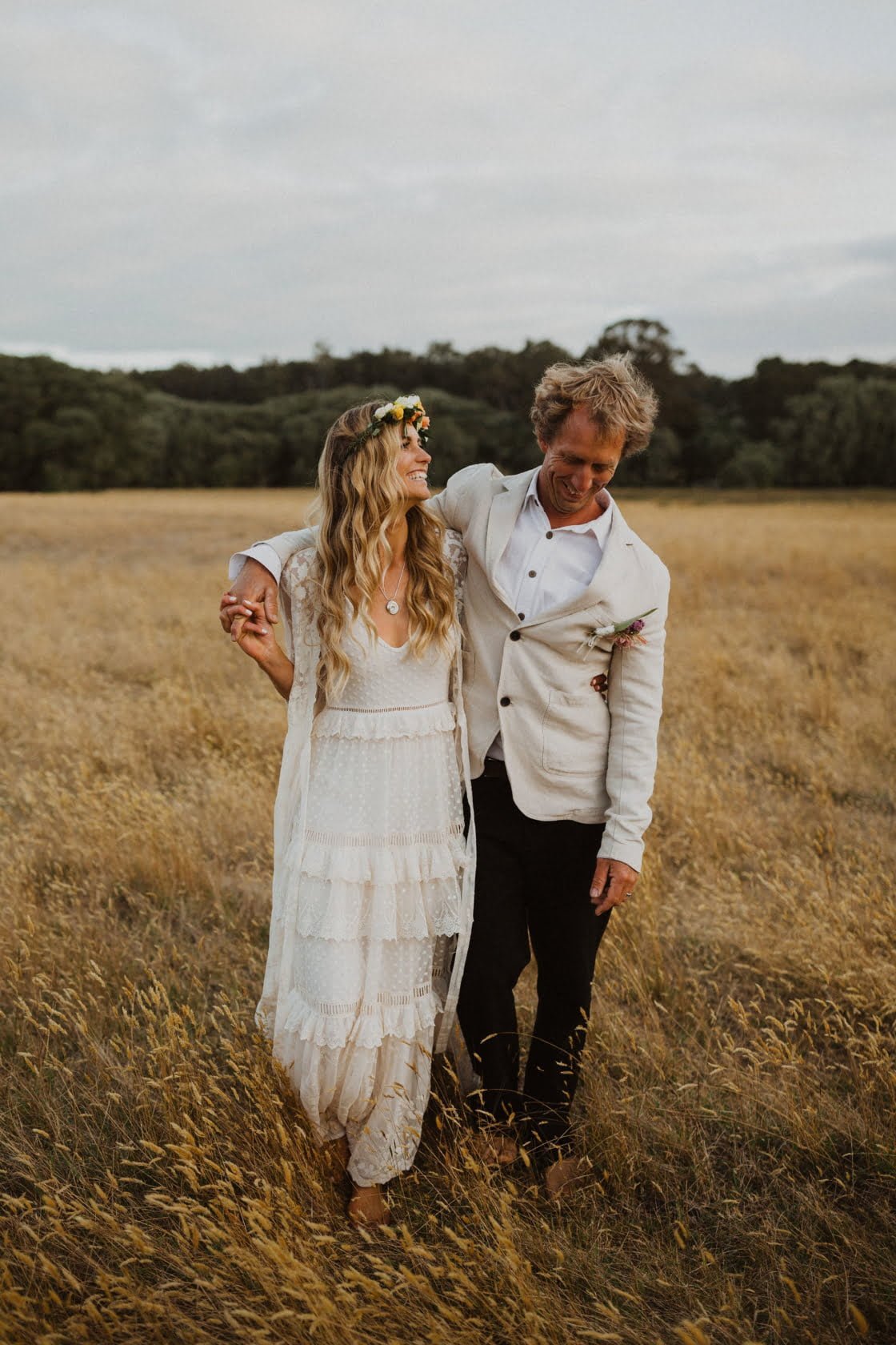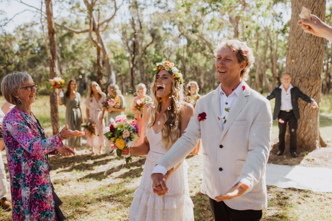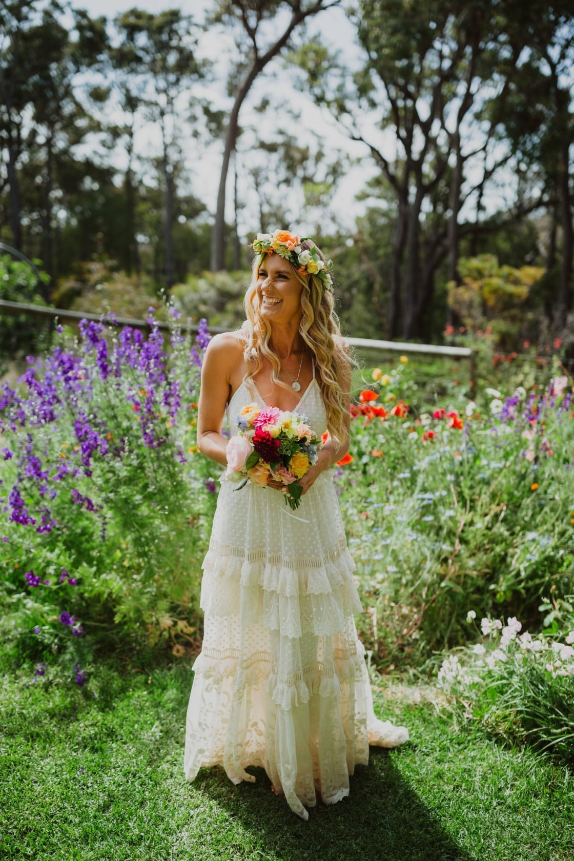 FAVE DETAILS “The whole day was amazing. Our bridal party organised super fun Hens and Bucks days (surf comps/ horse riding/ games etc) which made us both feel so loved up and excited about the wedding day. Kimbo’s sister and mum whipped up amazing handmade wedding invites. We found the flowers and desserts from wandering around the local Farmers Markets. Kirk’s Kitchen made his famous fish tacos and even spoiled some of the kids and my aunty to hot chips which wasn’t even on the menu, what a champ! The wedding cake was heaven, La Dolce Vita Catering went to school with Kimbo and her grazing table and GF cakes were just so delicious! Music and Videographers, the celebrant… A real standout for me was that it was a real honour going into my mum’s beautiful garden with a pair of secateurs and being told we could pick whatever we liked for my bouquet and flower crown. Mum worked hard in the garden and it paid off, it was just a delight hanging out in it in the morning of the wedding.”