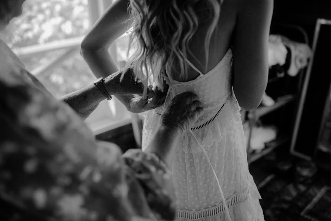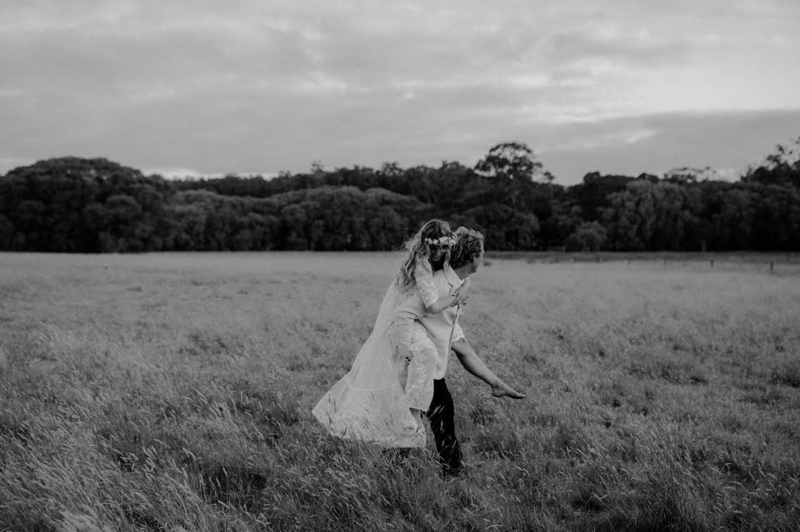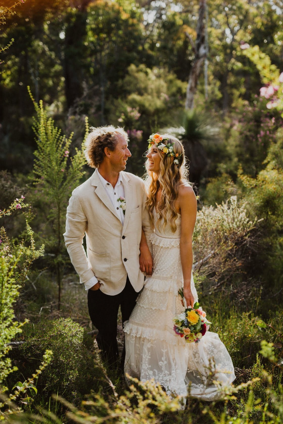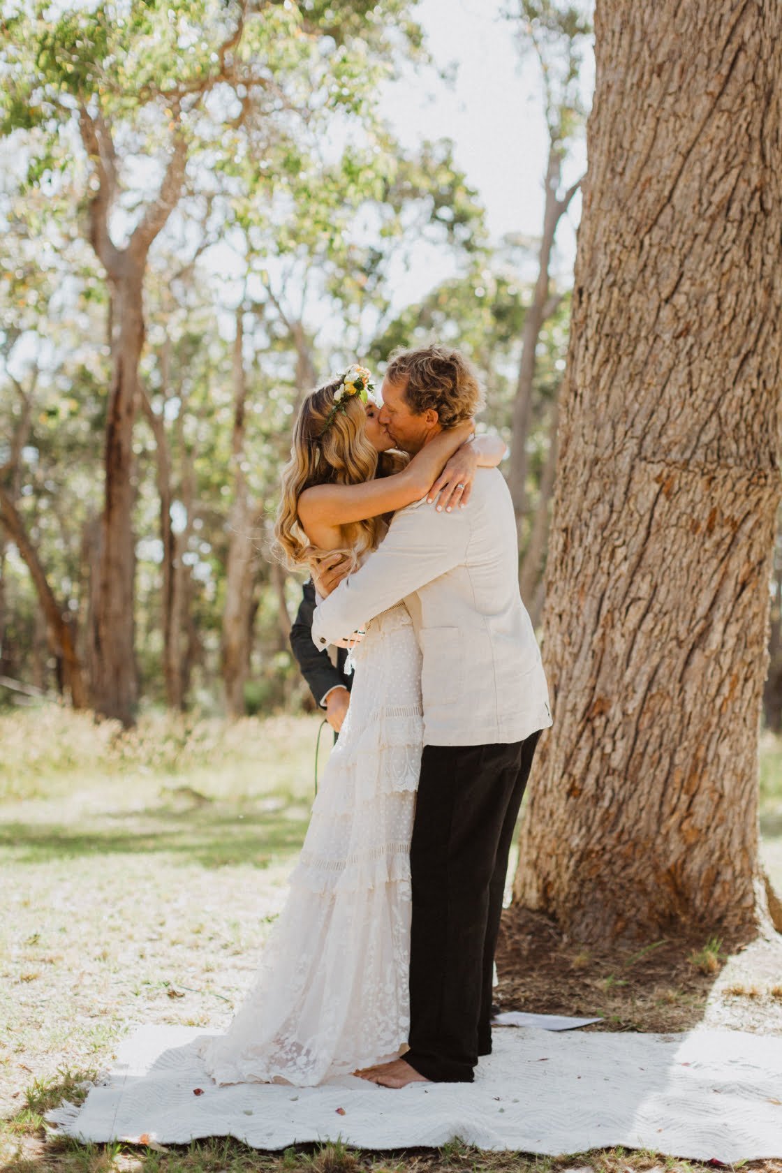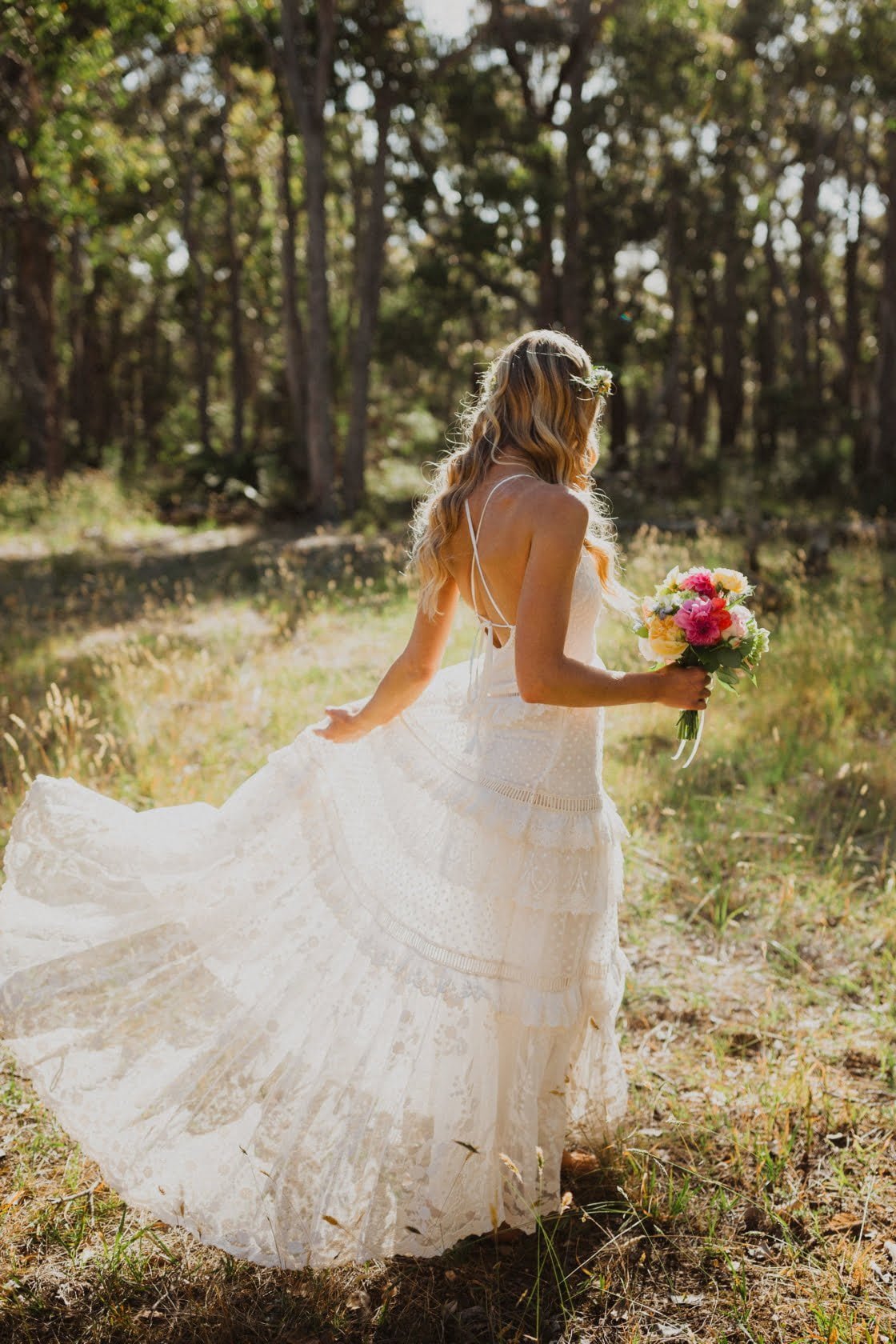 THE DRESS “I tried on a few dresses in Perth with mum which was fun! But the dress was purchased online from Spell Bride very early on, as we were moving to NZ for work on a yacht. Two months later COVID lockdown happened and we moved back home to Margaret River. It was close to what I was after and Jan (Kimbo’s mum) worked her magic on it and removed the lace off the bodice. It was then perfect, I could dance in it, swish around and felt fab!”
