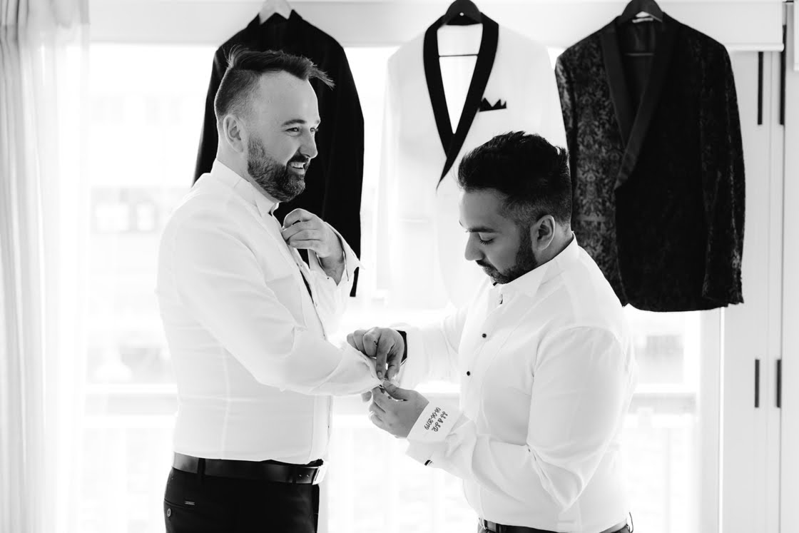 THE SUITS “Our suits came from Politix. Stephen had been excited about the jacket for quite some time and had difficulty tracking it down. Its fine features are what attracted him to it. As this was black, I chose a white dinner jacket but both had the same pants, bow ties and shoes for consistency. The white and black jackets were also set to contrast each groom’s skin tone, with Stephen, Caucasian and I, Sri Lankan.”