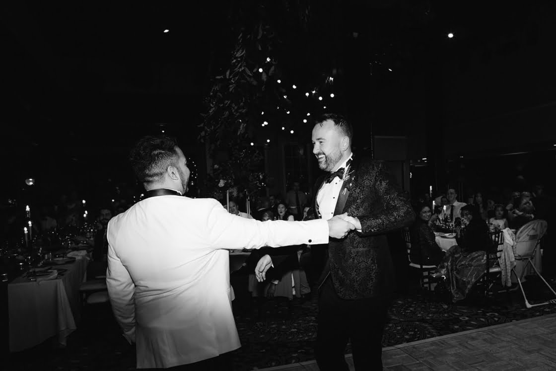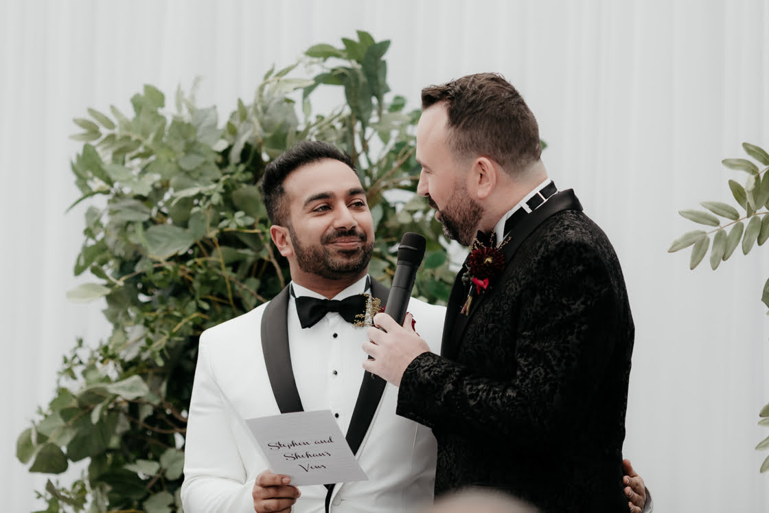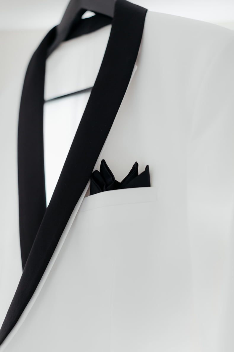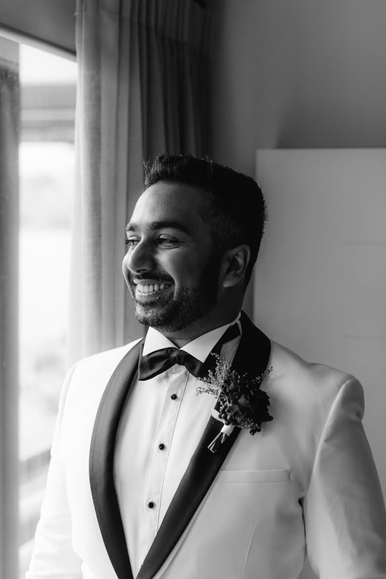 THE SUITS “Our suits came from Politix. Stephen had been excited about the jacket for quite some time and had difficulty tracking it down. Its fine features are what attracted him to it. As this was black, I chose a white dinner jacket but both had the same pants, bow ties and shoes for consistency. The white and black jackets were also set to contrast each groom’s skin tone, with Stephen, Caucasian and I, Sri Lankan.”