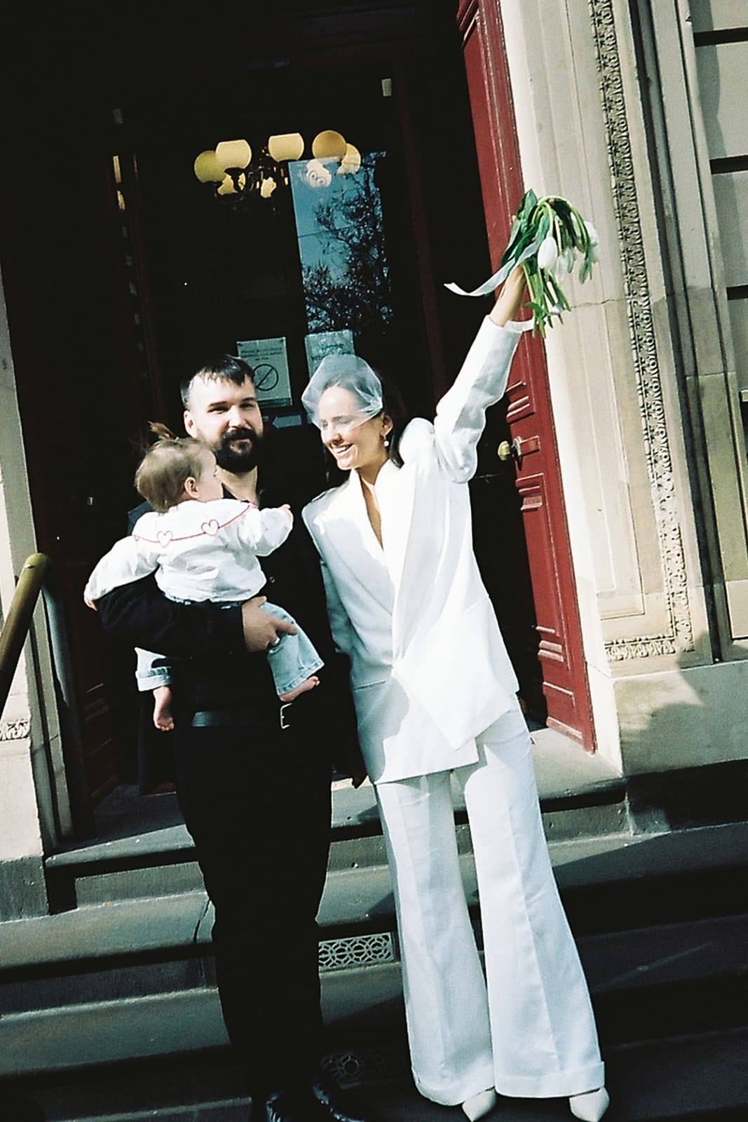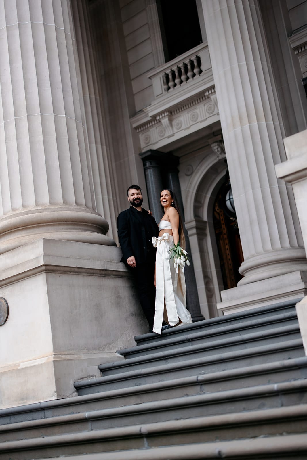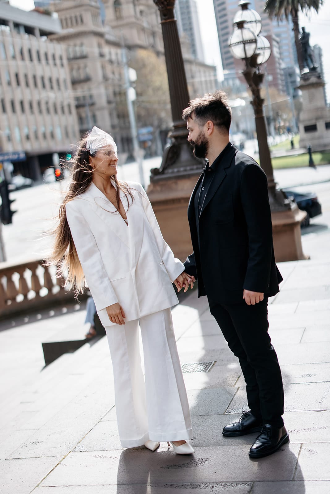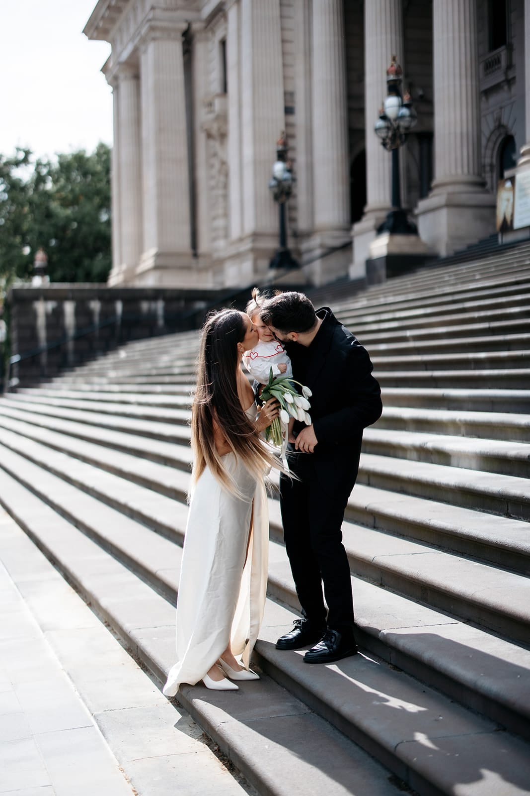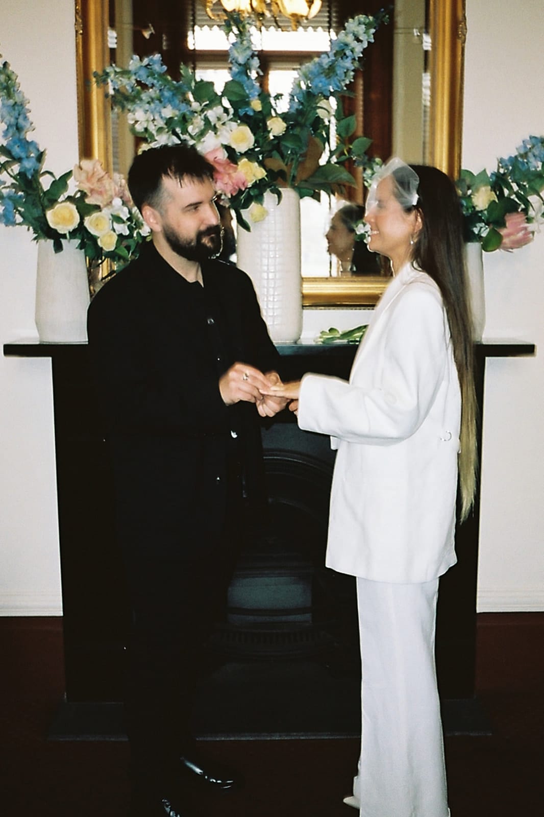 CONTRIBUTING VENDORS Photographer Kinship by Kristy Stationery Carrie Steffen Ceremony venue Victorian Marriage Registry Reception venue Marion Wine Bar Cake Bring Cake Rings Grew & Co, Hamish Munro THE BRIDE Pre-ceremony outfit Khirzad Femme Ceremony outfit MANGO x Victoria Beckham Luncheon outfit Christopher Esber Veil glamorbydesign via Etsy Shoes Spurr Makeup Kate Fletcher THE GROOM Jacket & Pants Olive Shirt Barena Shoes Dr. Martens