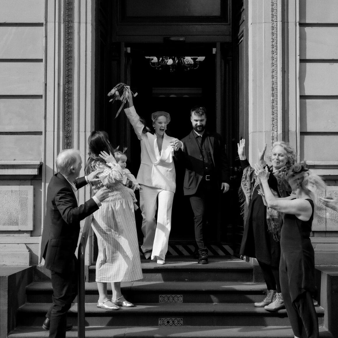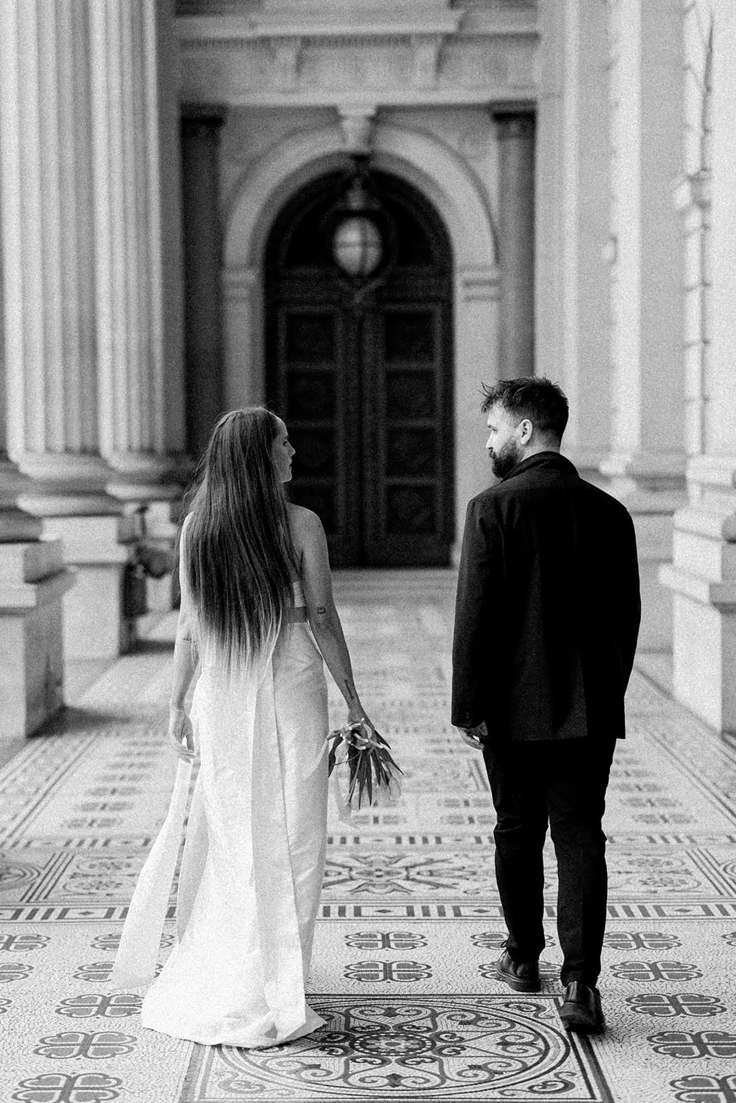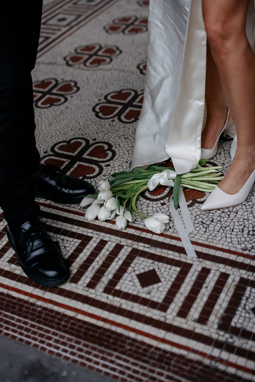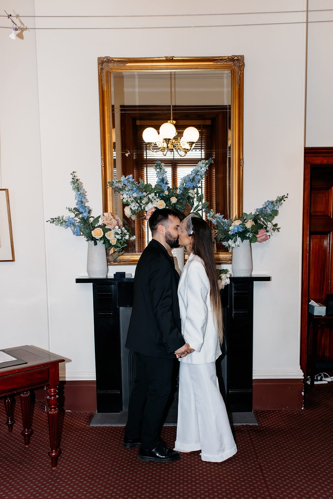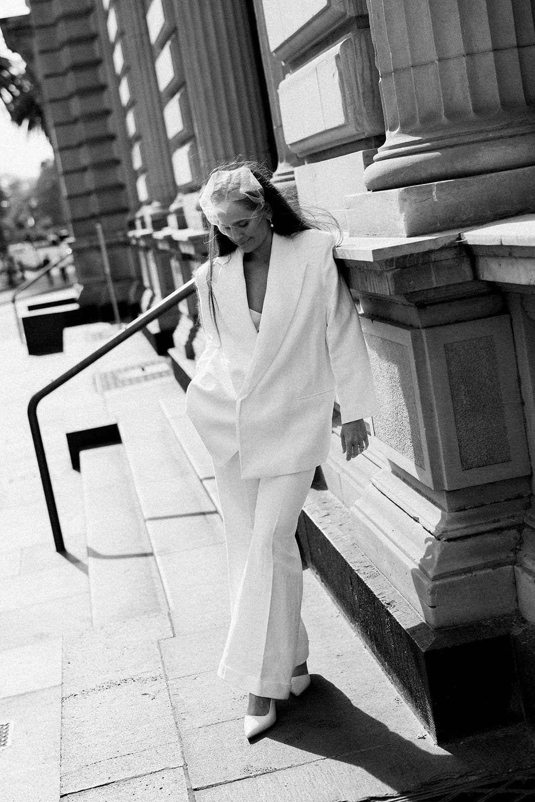 CONTRIBUTING VENDORS Photographer Kinship by Kristy Stationery Carrie Steffen Ceremony venue Victorian Marriage Registry Reception venue Marion Wine Bar Cake Bring Cake Rings Grew & Co, Hamish Munro THE BRIDE Pre-ceremony outfit Khirzad Femme Ceremony outfit MANGO x Victoria Beckham Luncheon outfit Christopher Esber Veil glamorbydesign via Etsy Shoes Spurr Makeup Kate Fletcher THE GROOM Jacket & Pants Olive Shirt Barena Shoes Dr. Martens
