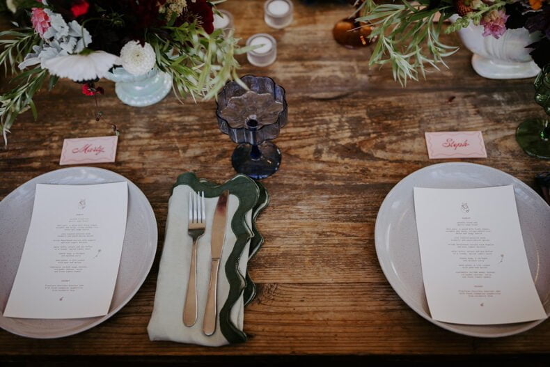 THE INSPO “An intimate summer party in a bygone era in the middle of nowhere. And if the groom was a merman (we didn’t set out to have so many aquatic elements in the table settings but it just kind of happened!). I love bright colours, especially reds, and Marty loves all shades of brown; we wanted the style to be representative of both of our favourite things.”