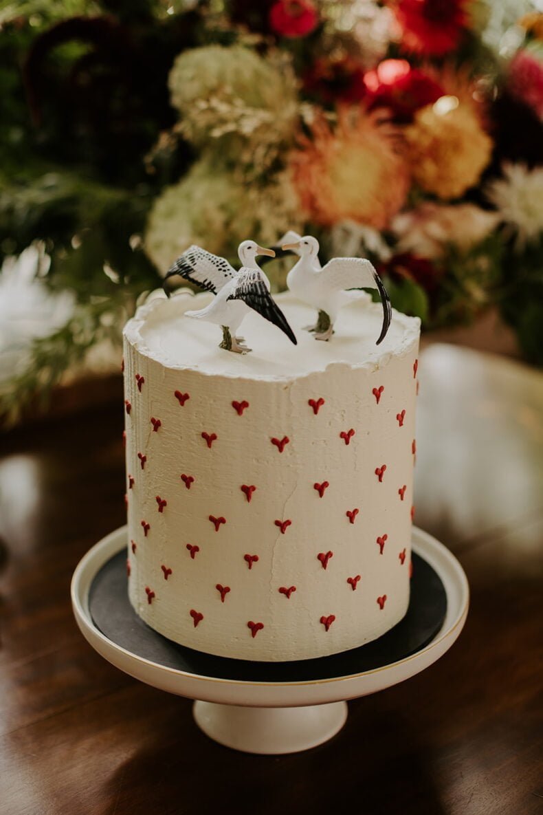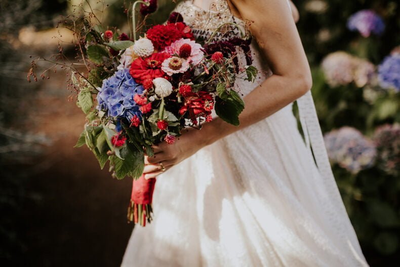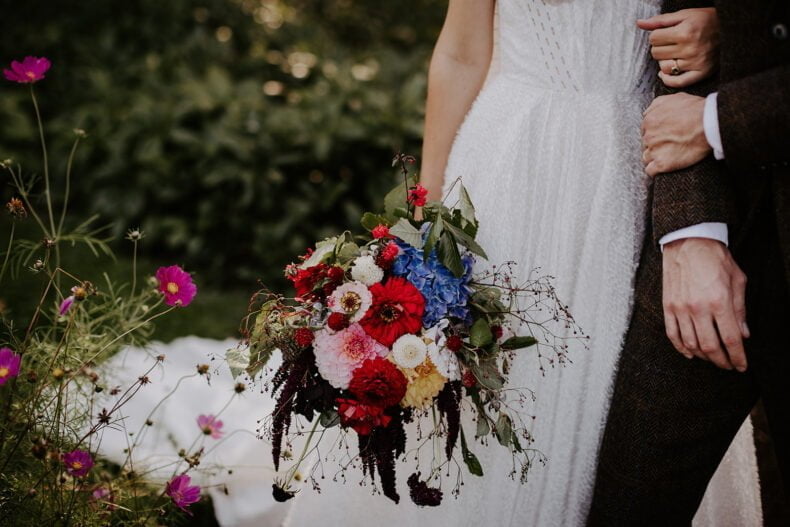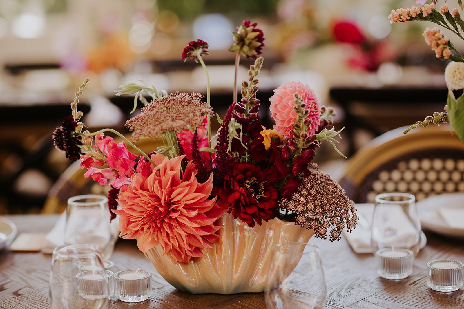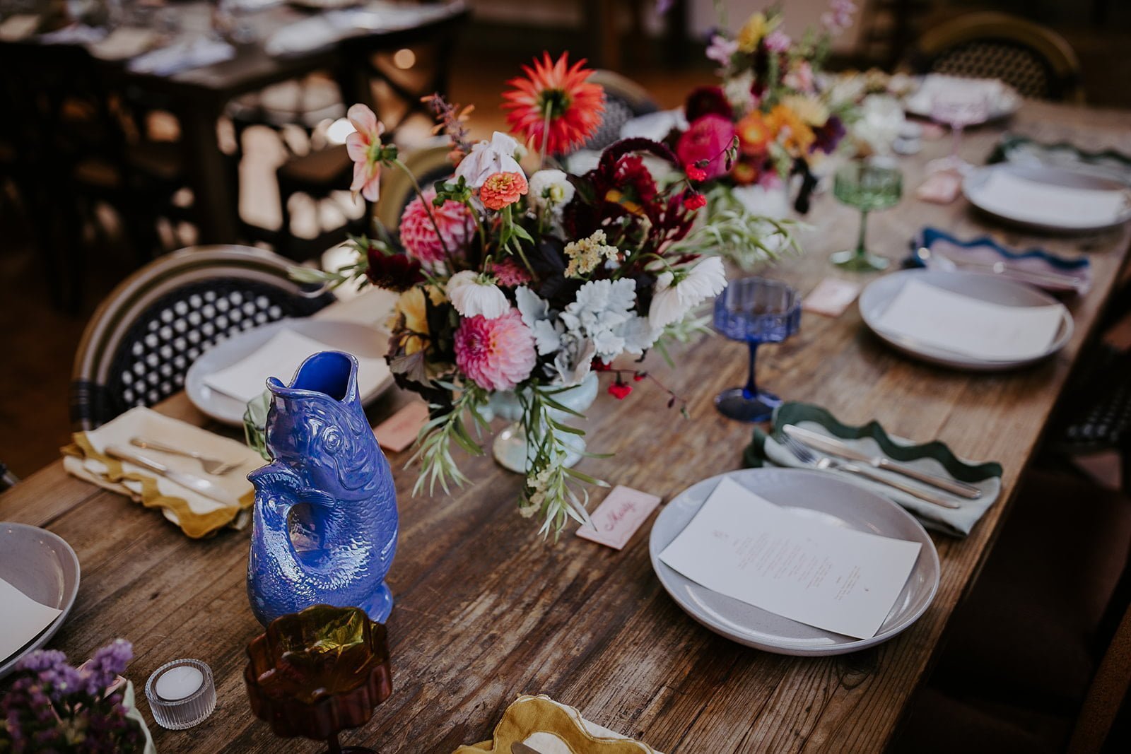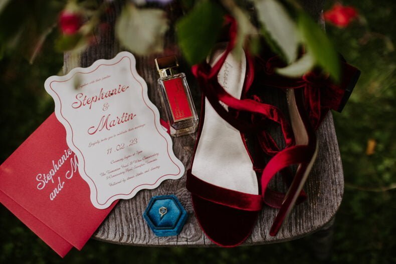 THE INSPO “An intimate summer party in a bygone era in the middle of nowhere. And if the groom was a merman (we didn’t set out to have so many aquatic elements in the table settings but it just kind of happened!). I love bright colours, especially reds, and Marty loves all shades of brown; we wanted the style to be representative of both of our favourite things.”
