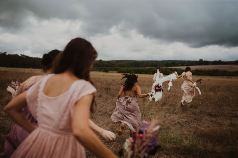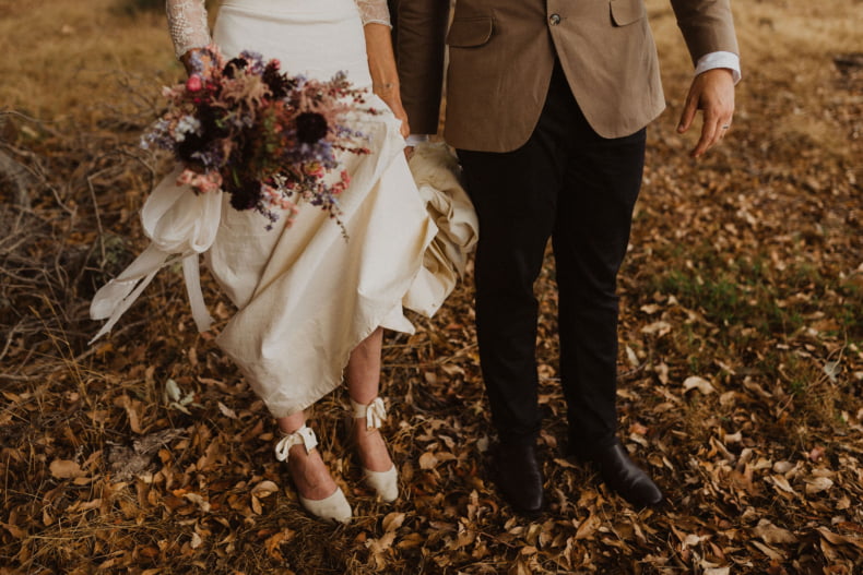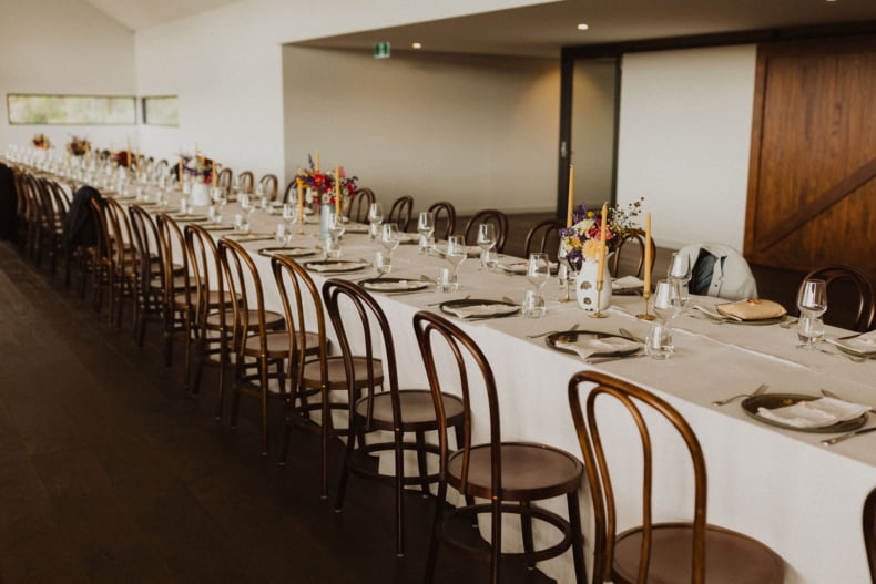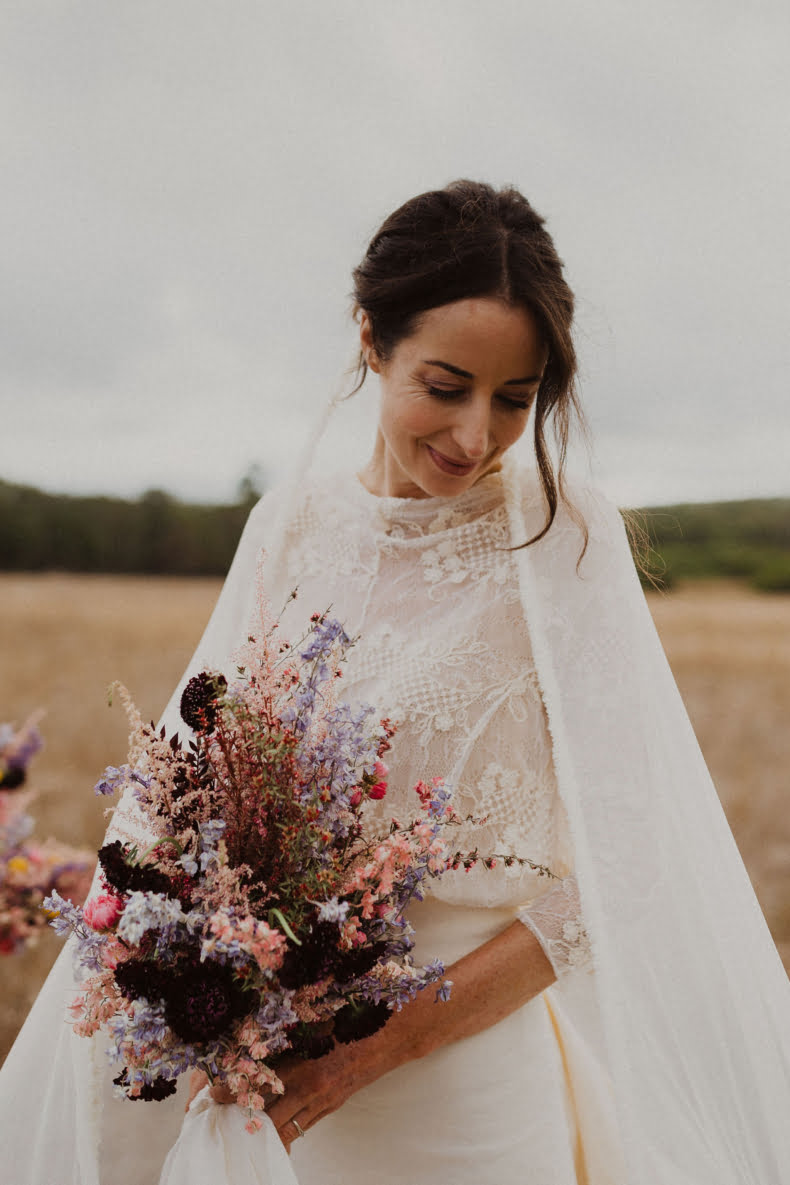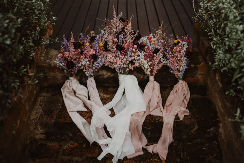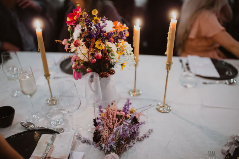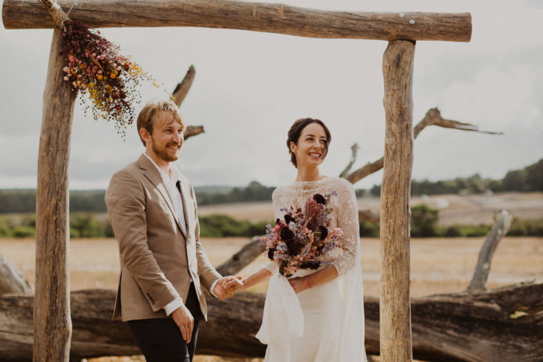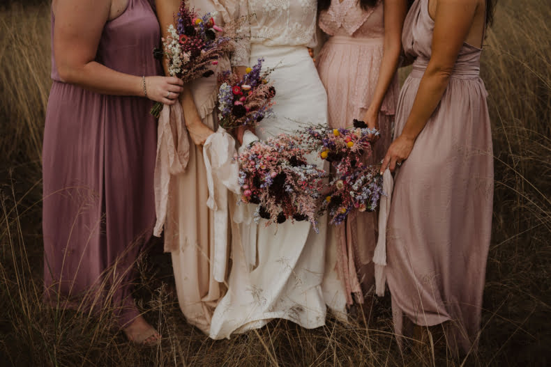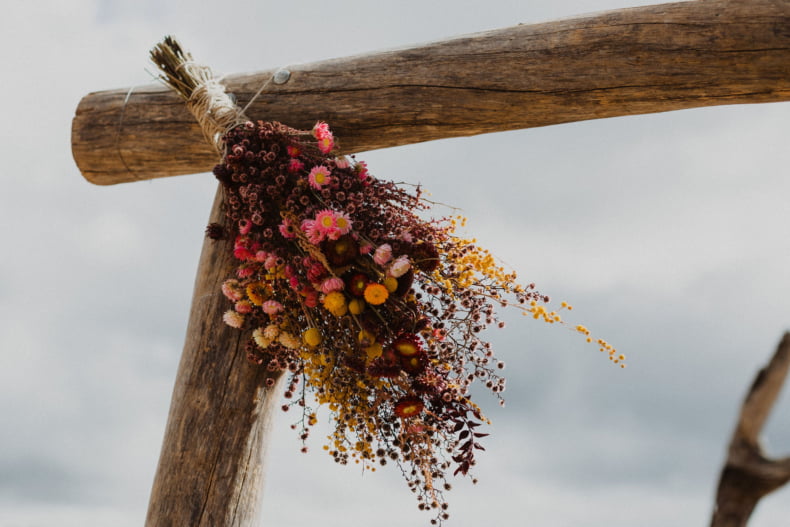 DIY “I grew and dried the flowers for the bouquets and arbour, my shed was filled with drying racks full of delphiniums, larkspur and strawflowers for months. It was a really rewarding process with lots of trial and error. Anything I grew that didn’t dry well became fresh flowers for the tables so nothing was wasted. My family and a few friends helped put the vases of flowers together the day before the wedding. None of us are florists but figured we would work it out as we went – it was really special looking at the tables and seeing each of their creations.”